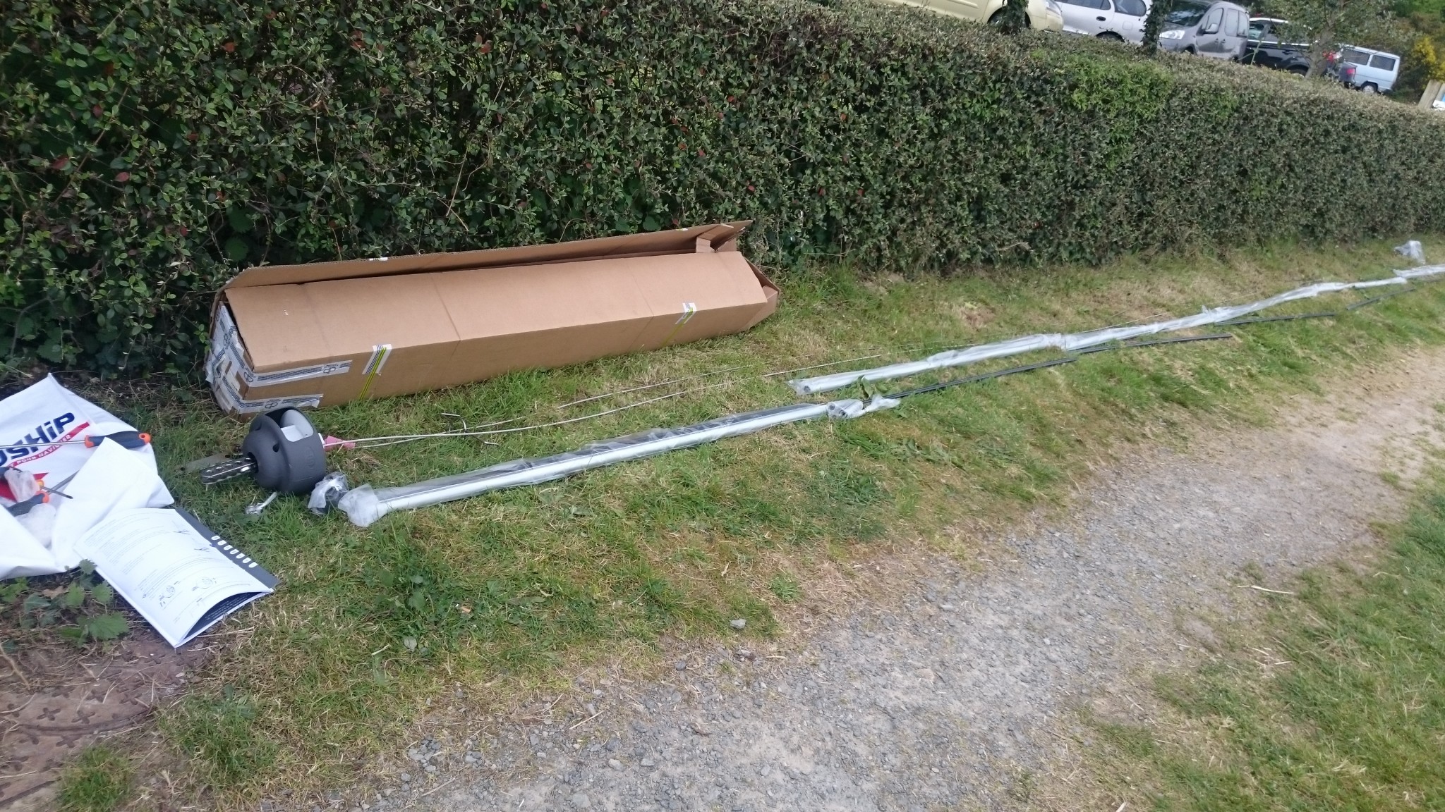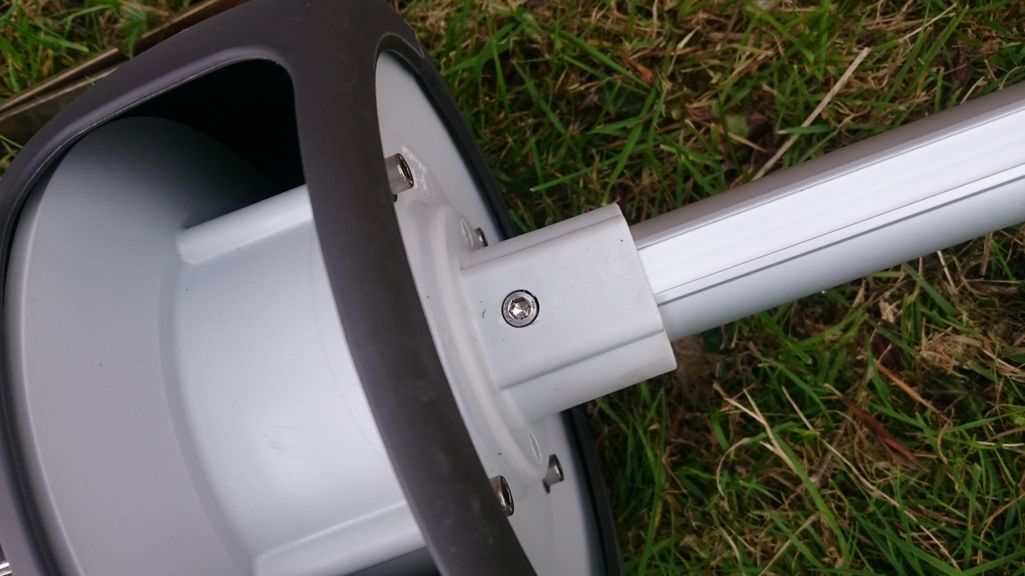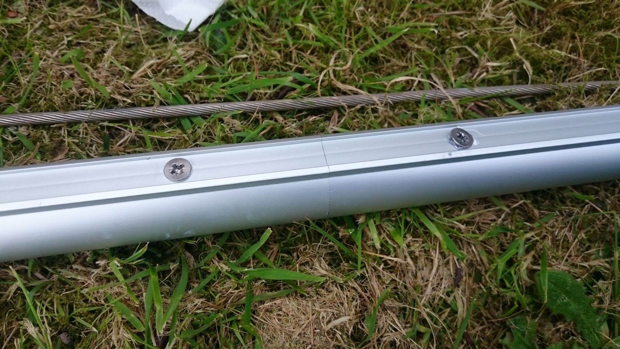 Pour remonter le mât on doit d’abord assembler l’enrouleur, et je le fais sur la pelouse à côté des sanitaires. Le point super sympa, c’est que ça fait plein de copains curieux avec qui discuter. L’enrouleur, un Plastimo 609S n’est pas très cher (de l’ordre de 500€), en tout cas pas mal moins cher que les enrouleurs de marques concurrentes. Mais comme toujours, on en a pour son argent : rien n’est ajusté, les trous ne tombent pas en face, un coup c’est trop long, un coup ça ne l’est pas assez, j’essaierai un peu toutes les combinaisons pour trouver ce qui marche le mieux ensemble, mais il reste deux profils bien mal assortis. Et ce qui aurait pu être une promenade de santé se transforme en ascension (c’est de saison) un peu ardue.