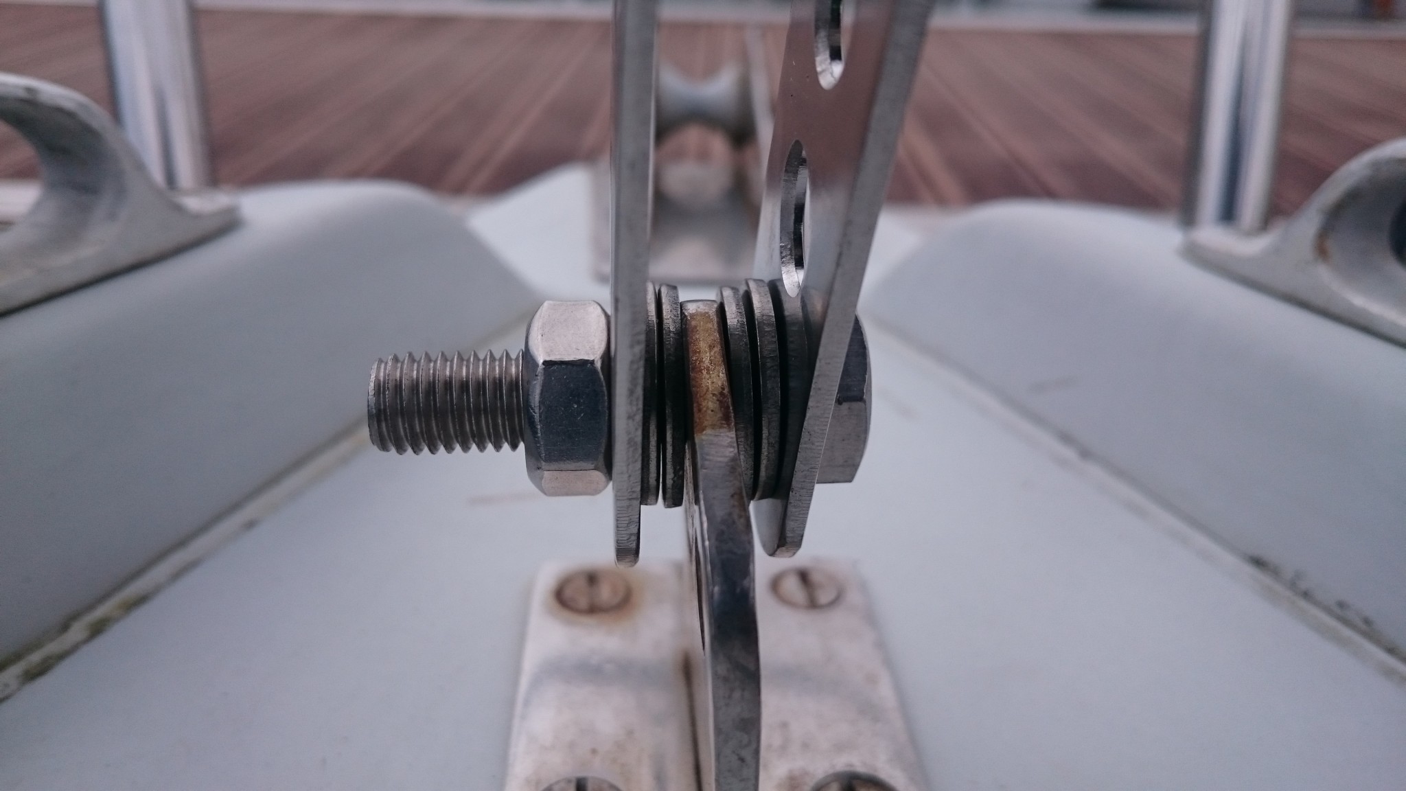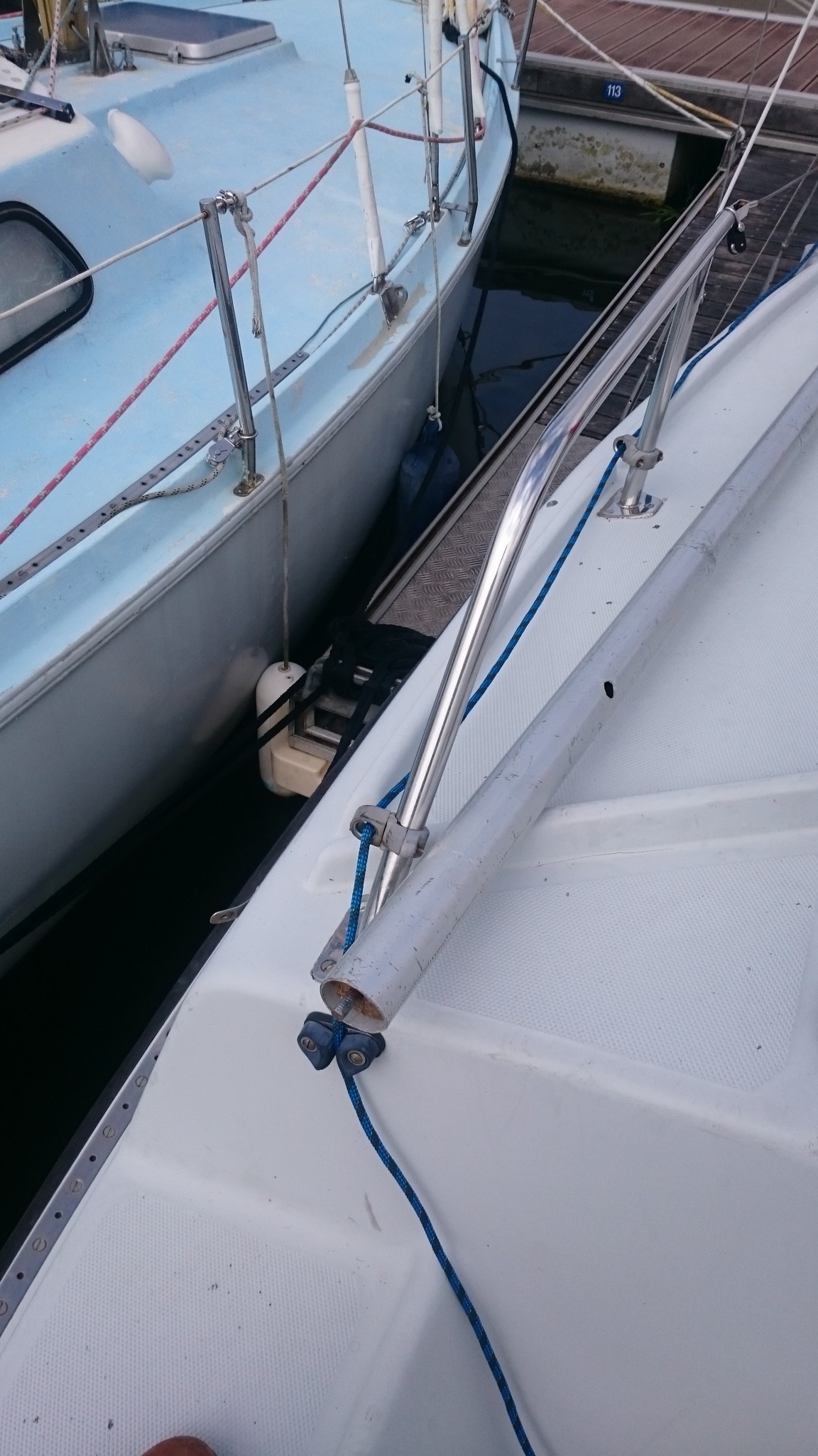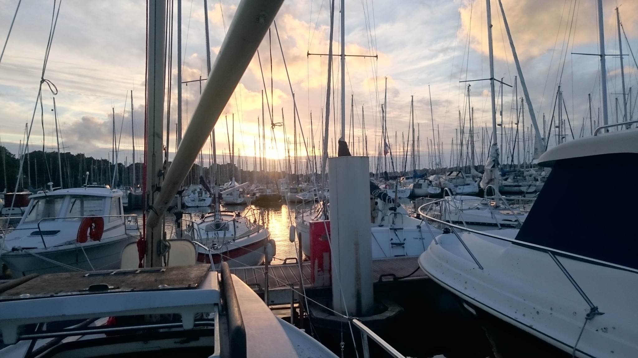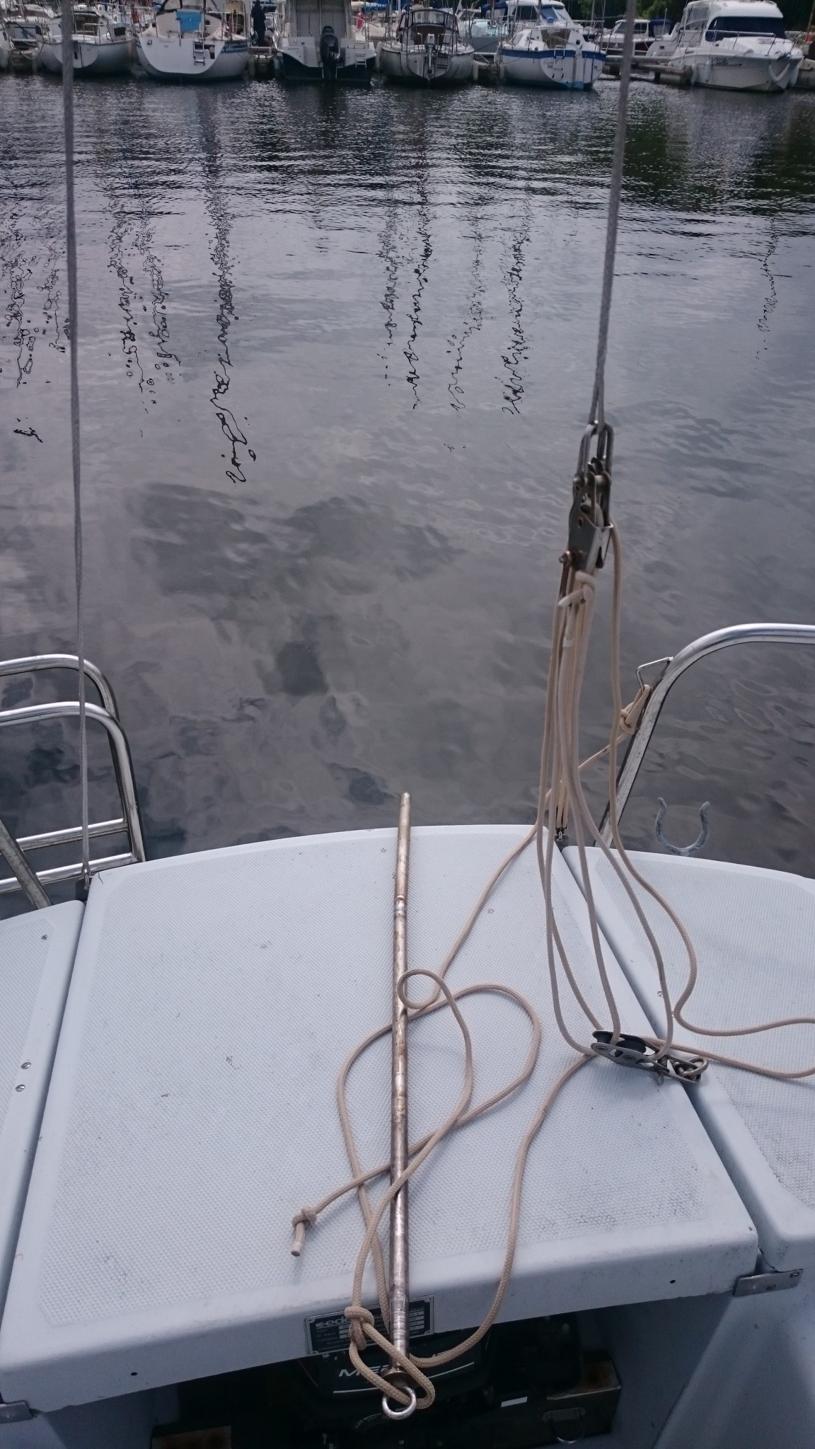 Après quelques courses et de retour au bateau, vient le réglage du mât, lors la précédente session, je l’avais fait en me fiant à mon instinct, mais en me renseignant au retour, je me suis dit que je devais pouvoir faire beaucoup mieux. Et en effet en mettant mon oeil dans la gorge, passé les barres de flèches, le mât porte assez sévèrement à droite… En appliquant les principes lus dans le manuel Selden, je perds quand même un tournevis à l’eau puis en desserrant le ridoir de hauban tribord, il s’ouvre, et 30 secondes et quelques jurons plus tard, la chape file elle aussi à l’eau… je la pensais encore solidaire du filetage du bas. A tort. A l’aide d’une drisse, je sécuriserai mon mât le temps d’aller en face acheter un ridoir neuf un poil énervé, désespéré beaucoup. Le ridoir remonté, je finirai le réglage sans plus d’anecdotes, et à la fin, je suis vraiment rassuré de ce que je vois en mettant mon oeil dans la gorge. Rassuré de n’être pas parti en mer avec un le réglage initial surtout !