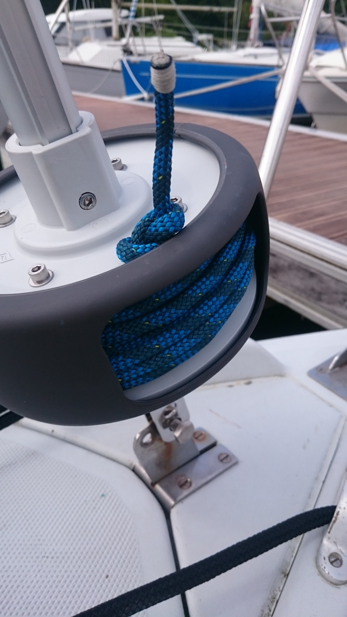 J’ai ensuite mon palan de pataras à changer, je m’étais aperçu que celui que j’avais mis n’était pas le bon. J’ai sur le bateau une couleur par bout (rouge pour la GV, bleu pour le génois, crème pour le spi), sauf sur les palans qui sont tous de la même couleur ce qui n’aide pas toujours à les reconnaître. Mais le palan initial a comme rétréci au lavage (en fait le mat est désormais plus porté en avant) et si j’envisage d’abord refaire le palan, je finis par trouver une boucle dyneema fabriquée lors de l’atelier avec Fabrice dont je me dis qu’elle prolongera convenablement mon palan. Hop, plié.