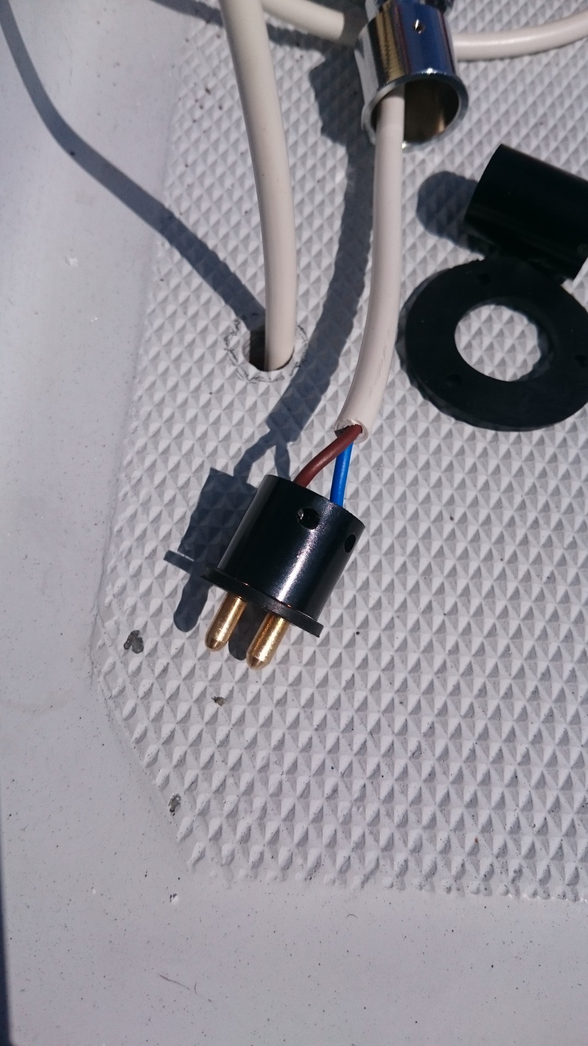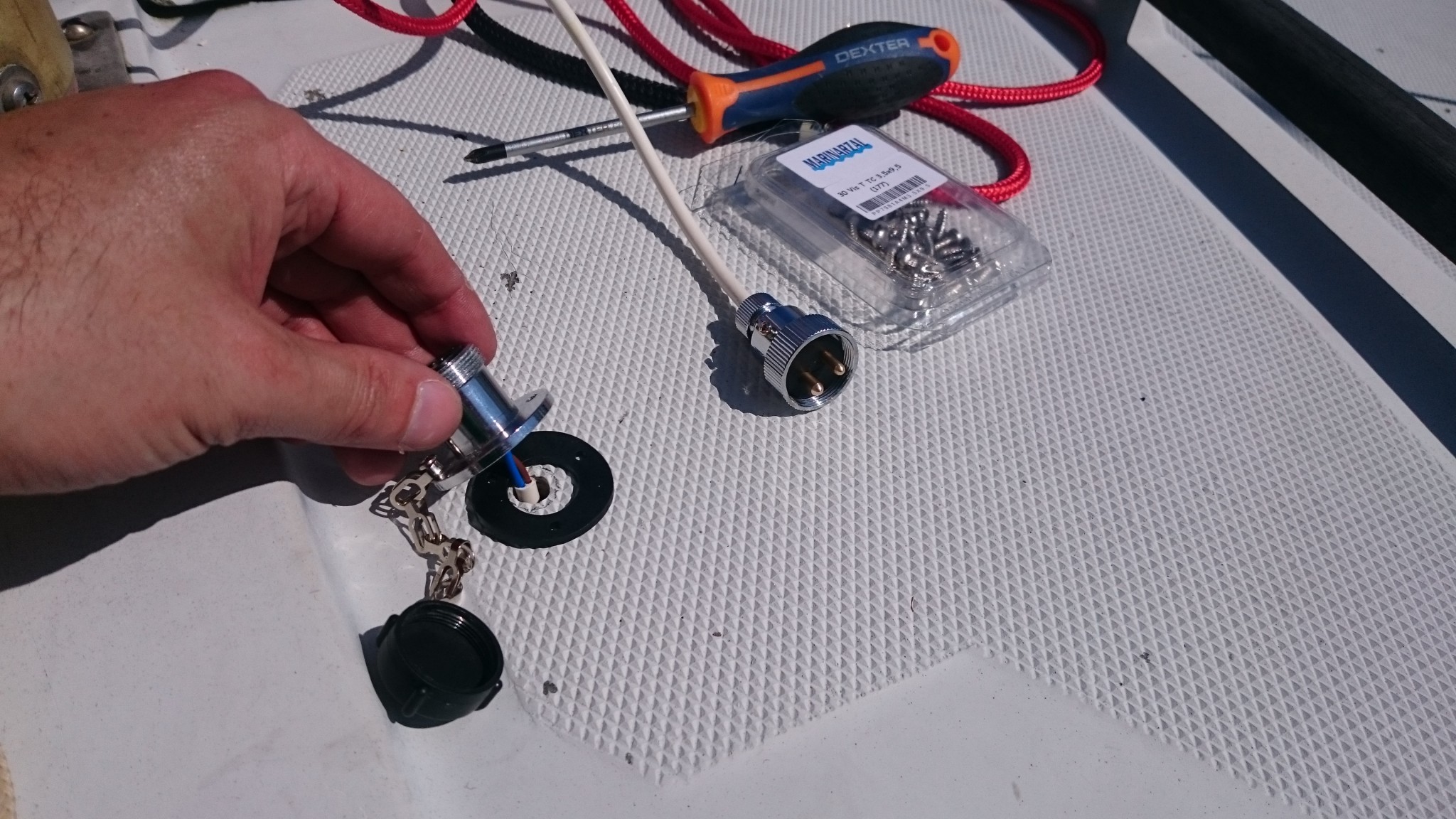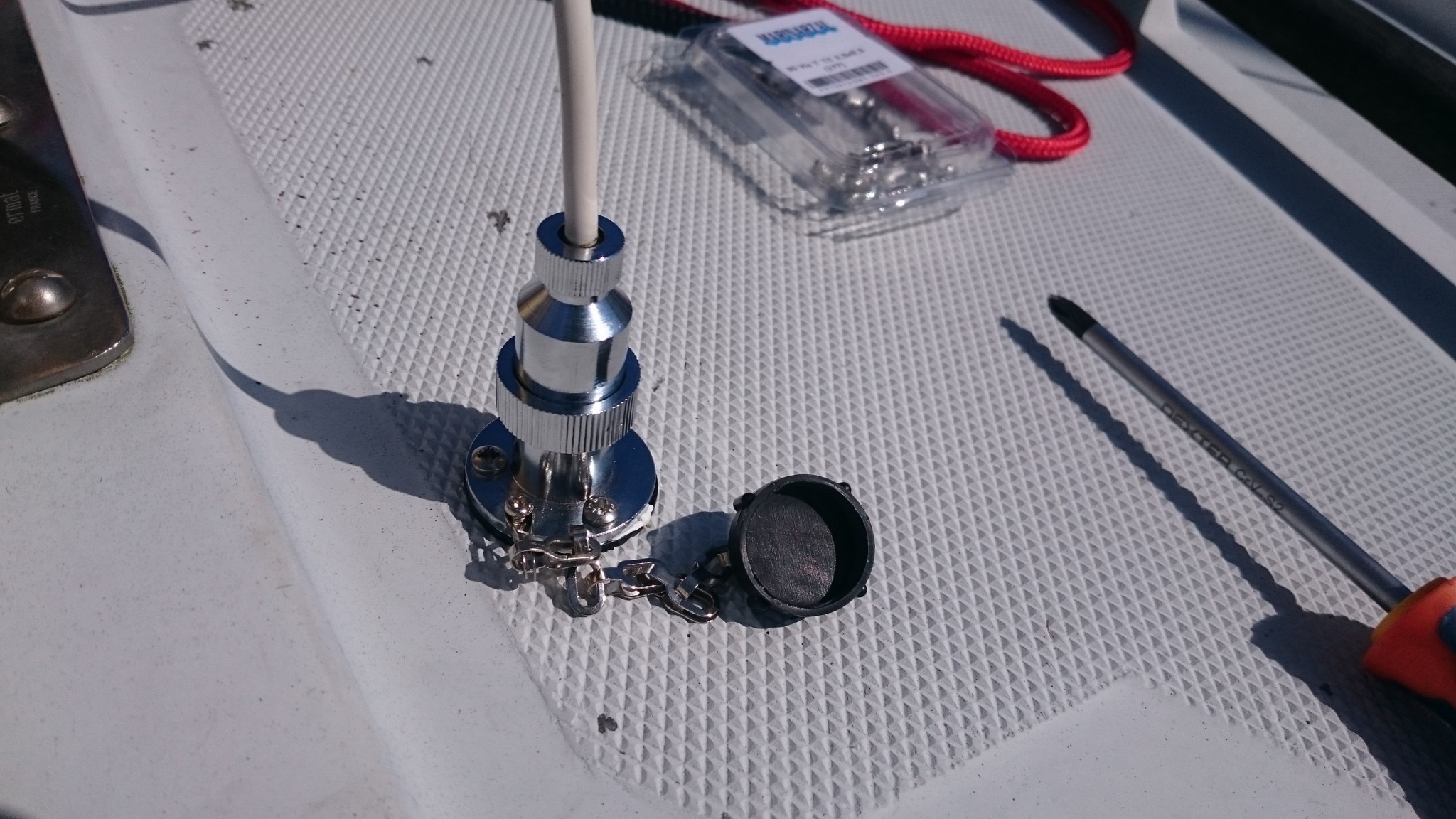 Je dois percer le pont pour faire passer le câble électrique du feu de mouillage. J’ai acheté un passe-pont que je trouve plutôt très bien foutu, mais en le démontant, je me rends compte qu’il faut un tournevis de précision pour manipuler les vis serties dans une sorte de bakelite. Evidement je n’ai pas ce genre d’outil à bord, je l’ajoute à ma liste pour les courses du midi, avec quelques autres petits machins… et je m’abstiens de percer le pont avant d’être sûr de pouvoir terminer l’atelier :)