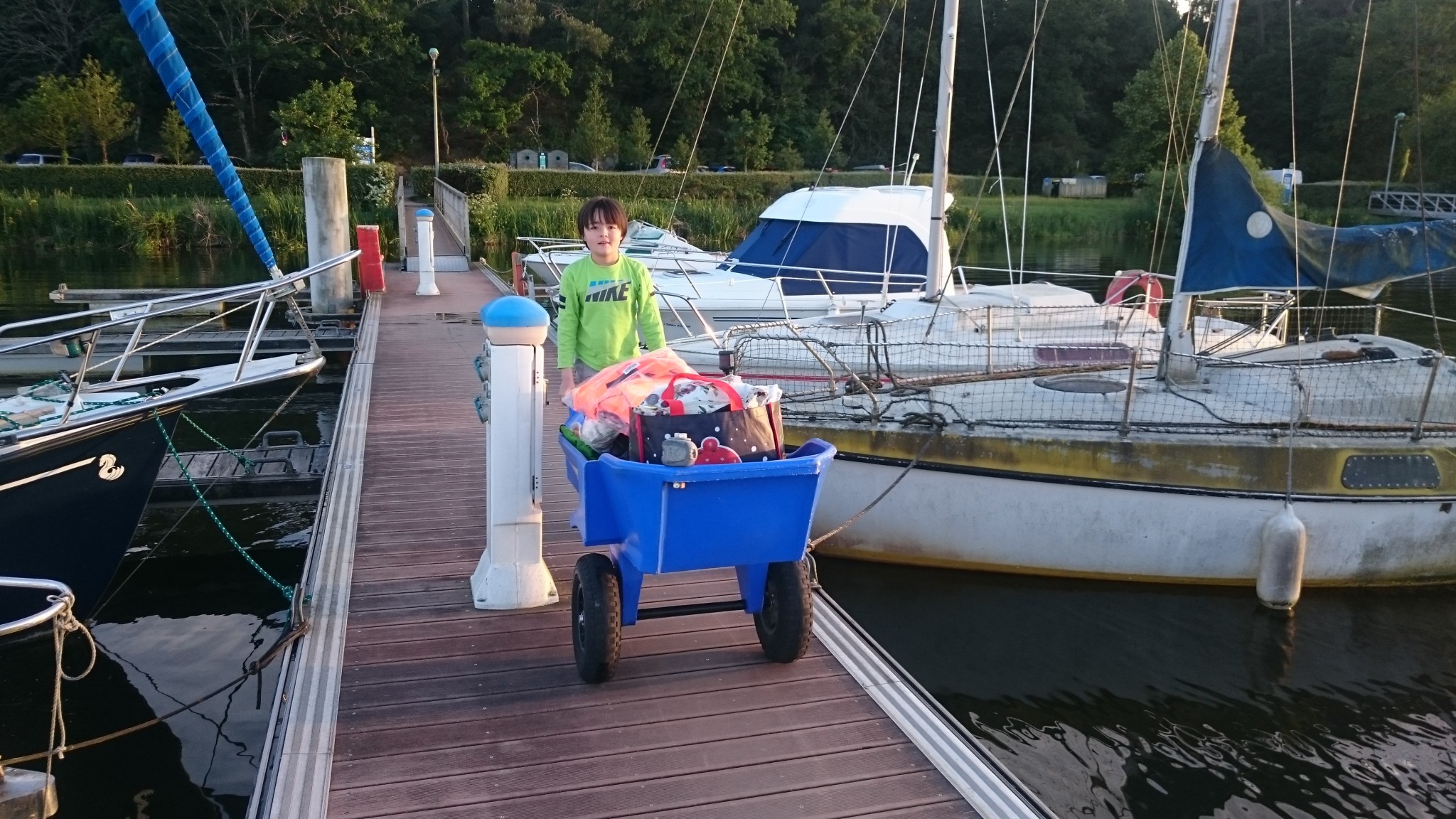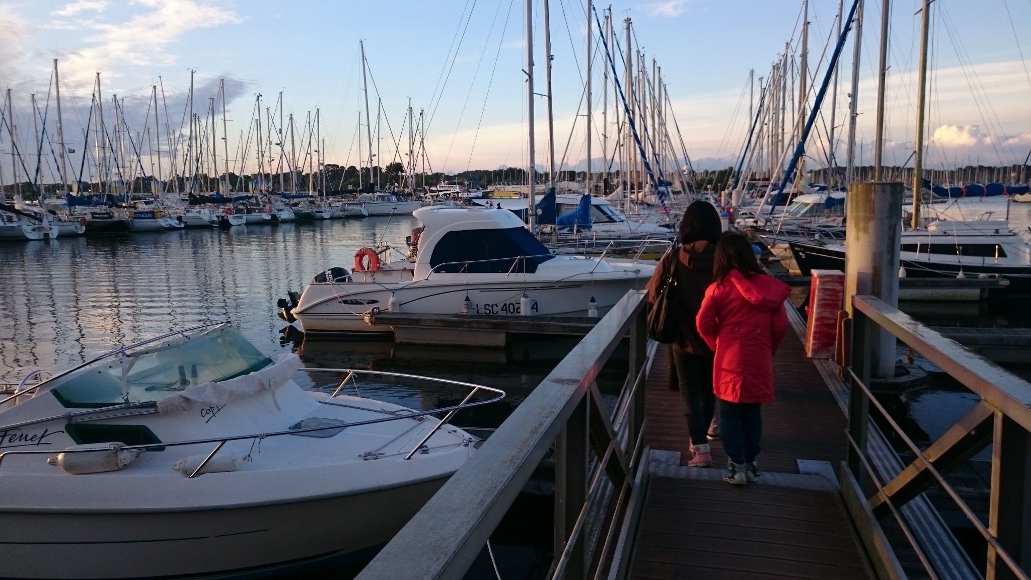 Je rentre à la maison où la petite famille m’attend, il est question de manger au restaurant avant d’aller dormir au bateau. Au retour, je m’affaire à divers ateliers à commencer par hisser le génois, il y avait beaucoup de vent dans l’après midi, j’ai préféré attendre le soir que le vent ne tombe. Avec l’aide des petits et du winch parce que c’est rigolo et que sans lui hisser la voile était un peu compliqué pour eux, le génois retrouve sa place sur l’enrouleur tout neuf. La longueur est bonne, la ralingue coulisse tout seul, et surtout : l’enrouleur tourne tout seul. Maintenant je sais que l’ancien avait fait son temps. Puis je teste le feu de mouillage en branchant le câble sur une prise 12v (dont je sais maintenant reconnaître la borne + : c’est celle en forme de -). Ca marche super, on ne voit que mon feu de mouillage de tout le port !