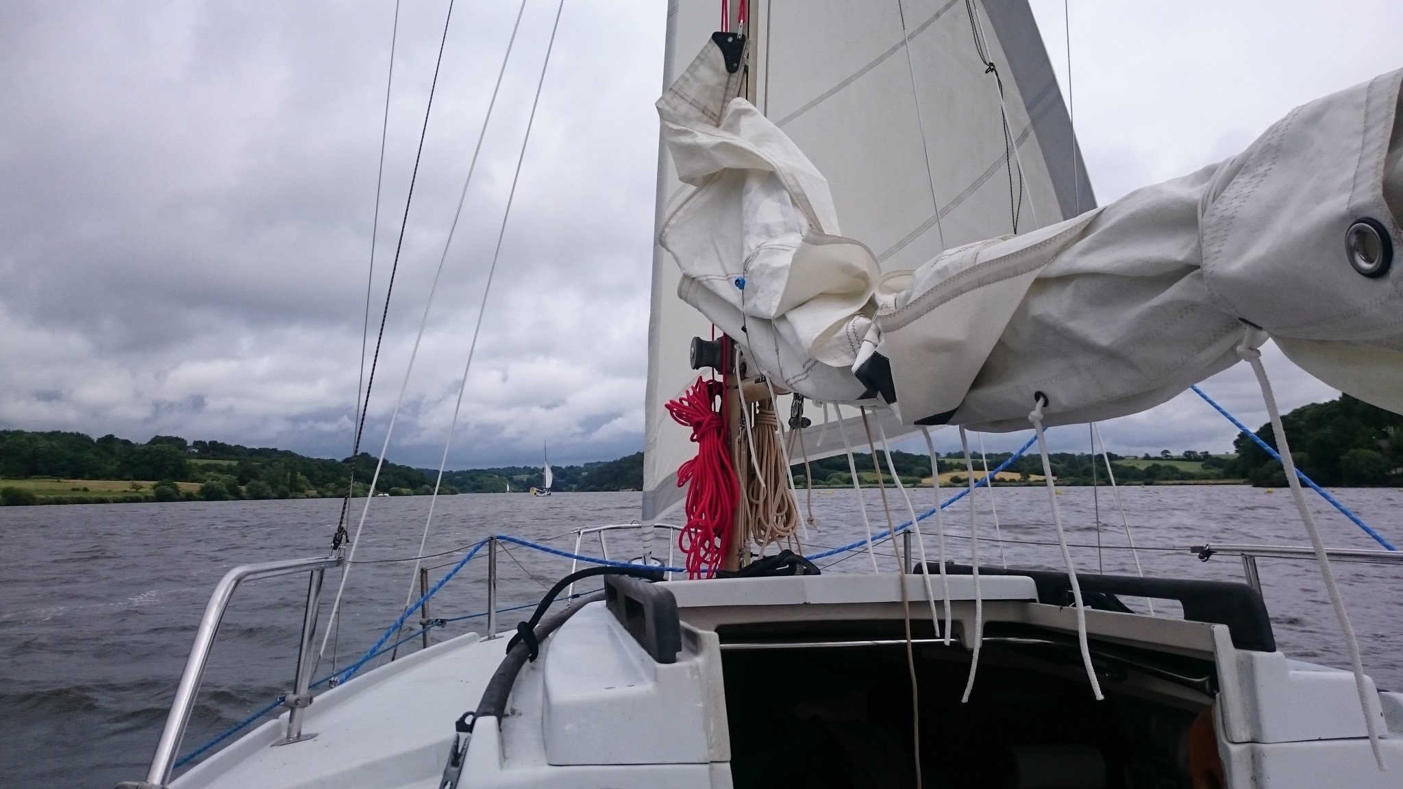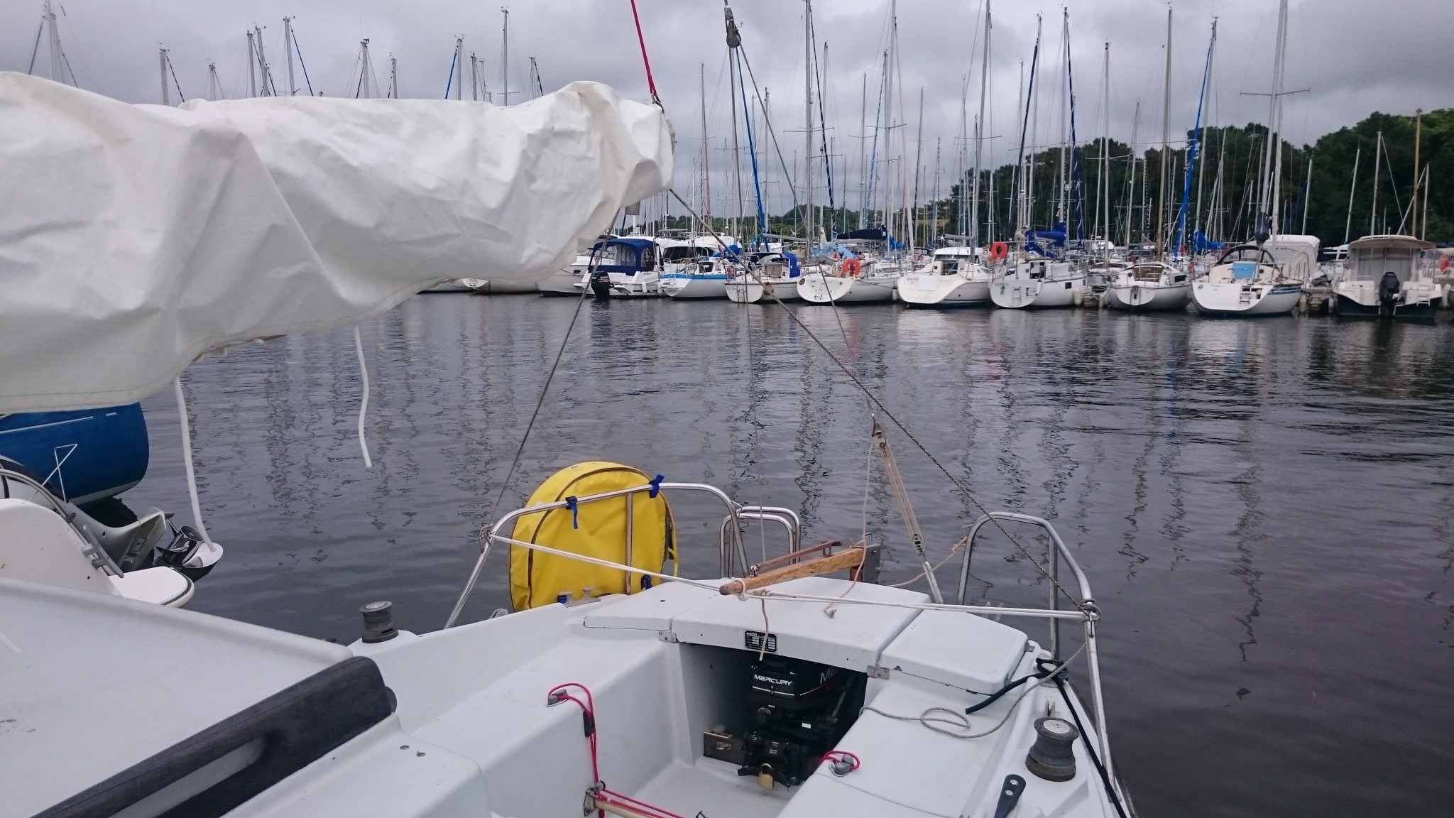 Week-end en deux parties : un samedi à bricoler, vérifier, régler, perdre des trucs dans l’eau, même pêcher malgré moi et un dimanche sur l’eau pour une courte navigation mi voile mi moteur.