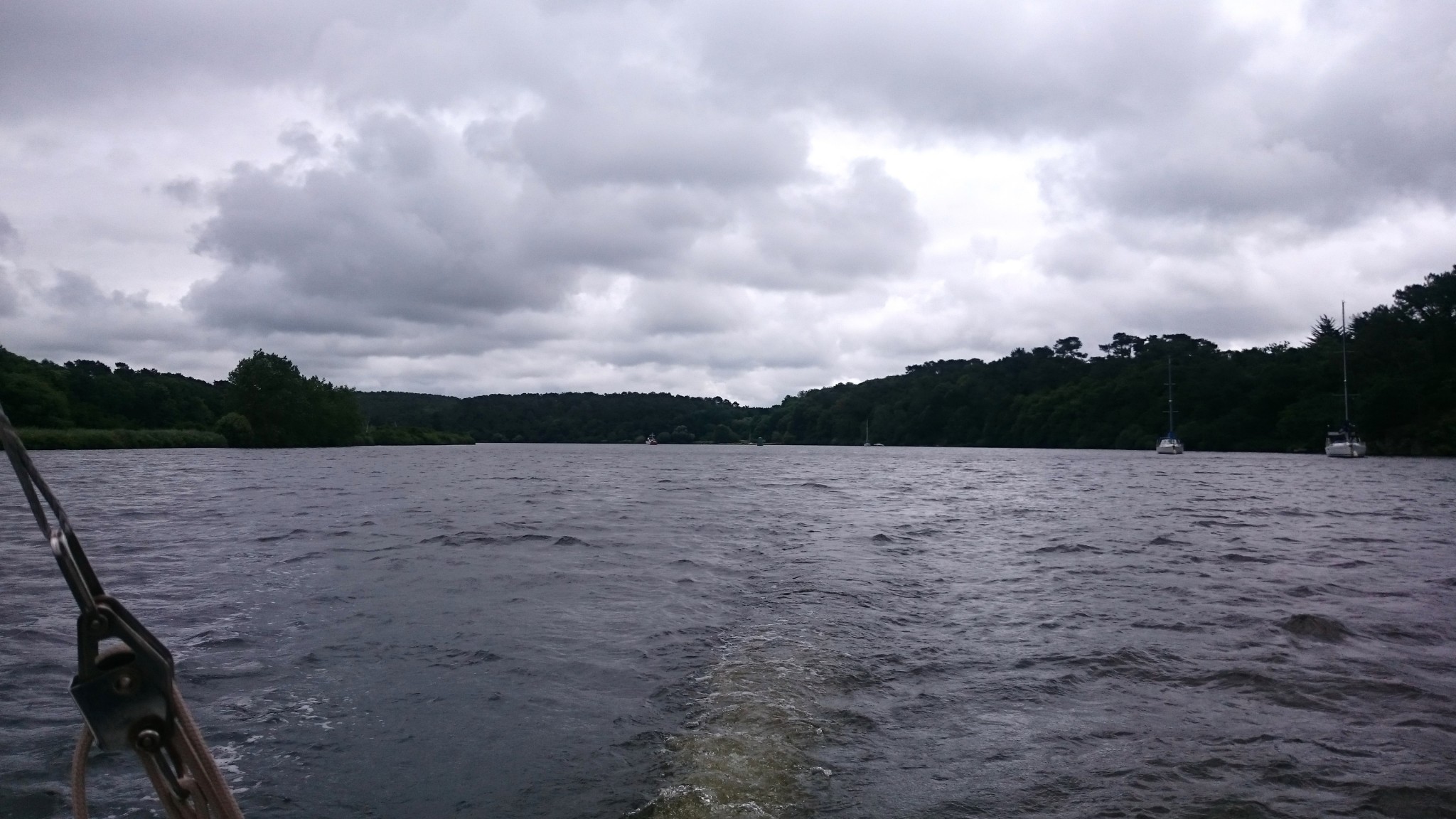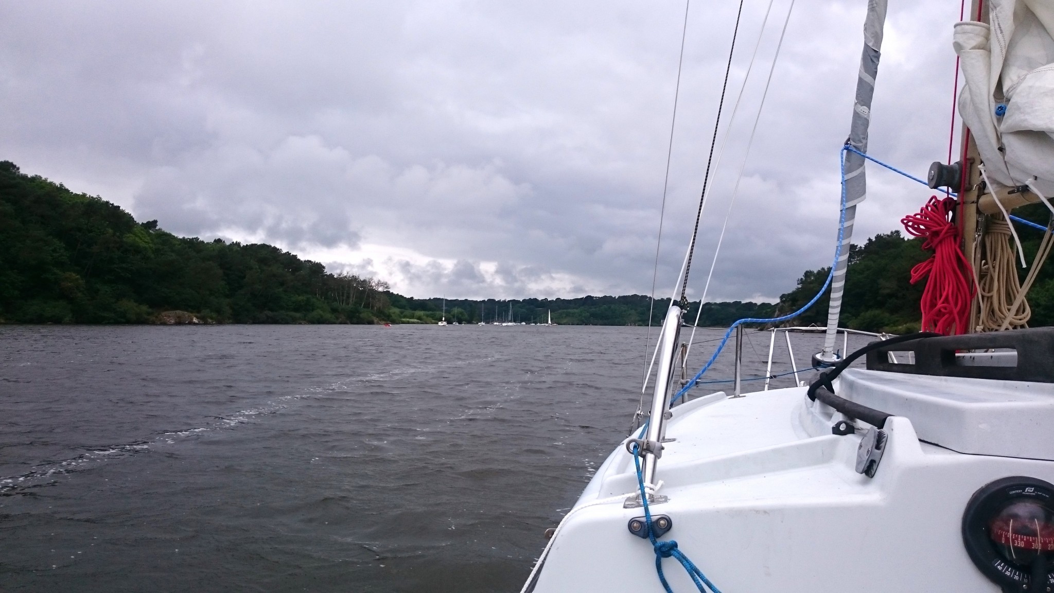 Contre l’avis général, je me donne même le luxe de déployer le génois, pas totalement, mais suffisamment pour me rendre compte en vrai à quel point un enrouleur neuf ça change tout sur tout. Ça se déploie tout seul, ça se maîtrise comme un rien, un peu plus de génois, un peu moins, si je veux oui, et même seul à la manoeuvre ! Quel plaisir ! Et juste au génois, la Vilaine au vent arrière devient un vrai plaisir : pas de dévente du génois pas de cap pointu à conserver sous peine de voir la bôme traverser. Et au loch, on est entre 3 et 4 noeuds, c’est très agréable. Pendant que je me réjouis d’être à la barre, dans le carré on ouvre les sardines, on coupe le pain, quelques sandwichs m’arrivent, et même une petite bière… La Roche Bernard apparaît, on range la voile (est-ce que je vous ai dit à quel point le nouvel enrouleur est un plaisir à manipuler ?), on fera un tour au moteur avant de se retrouver face au vent… ça souffle en vrai ! :)