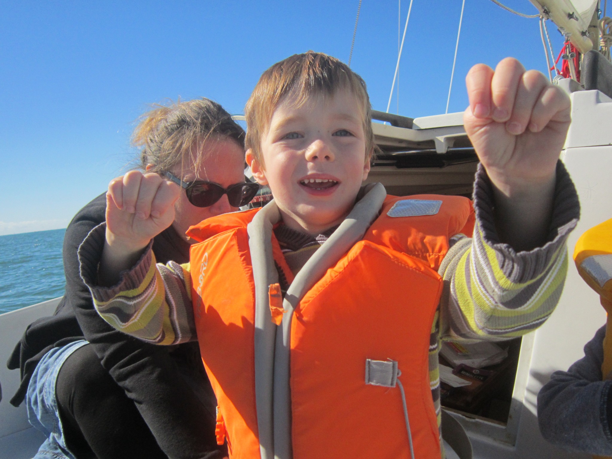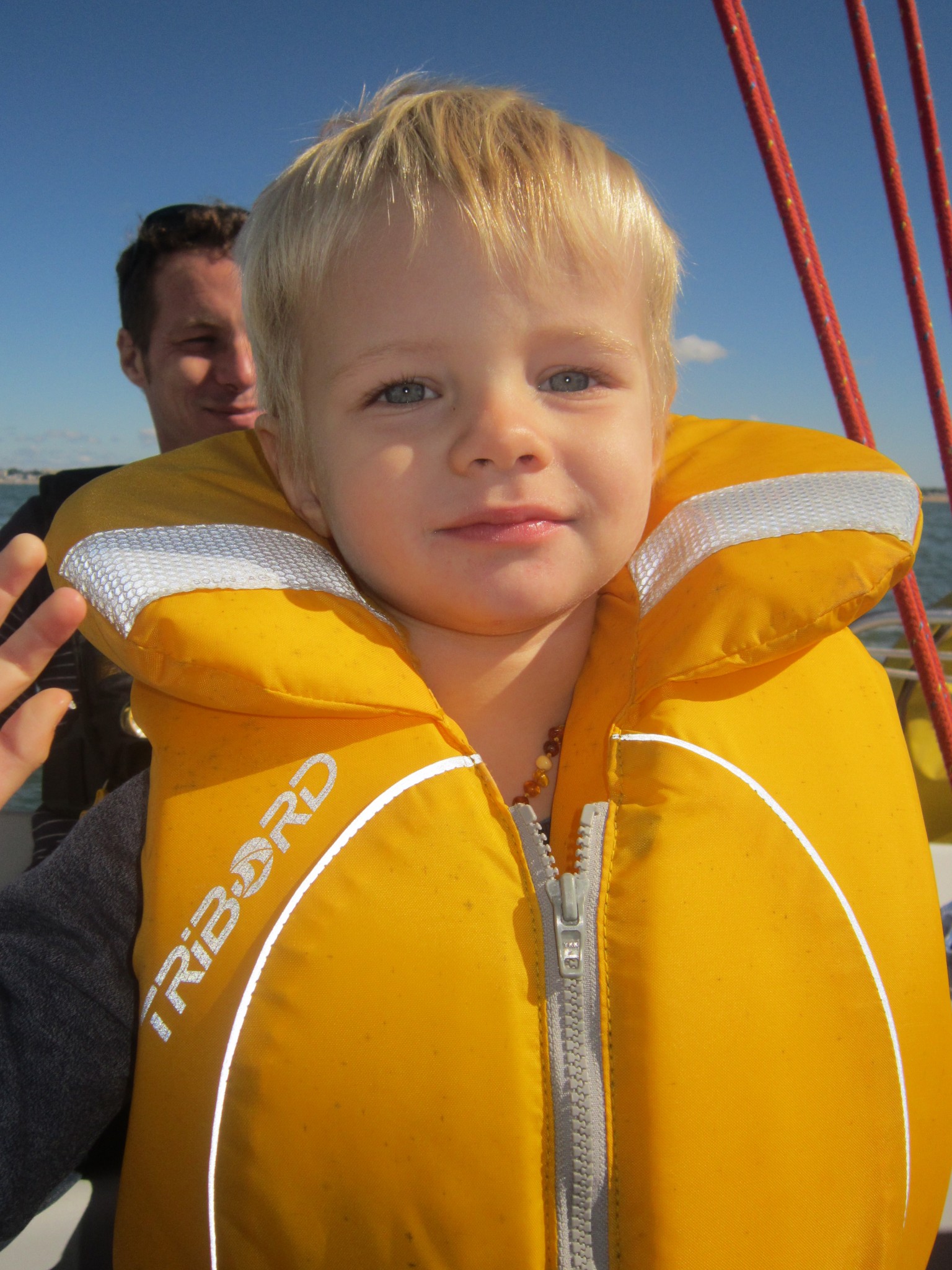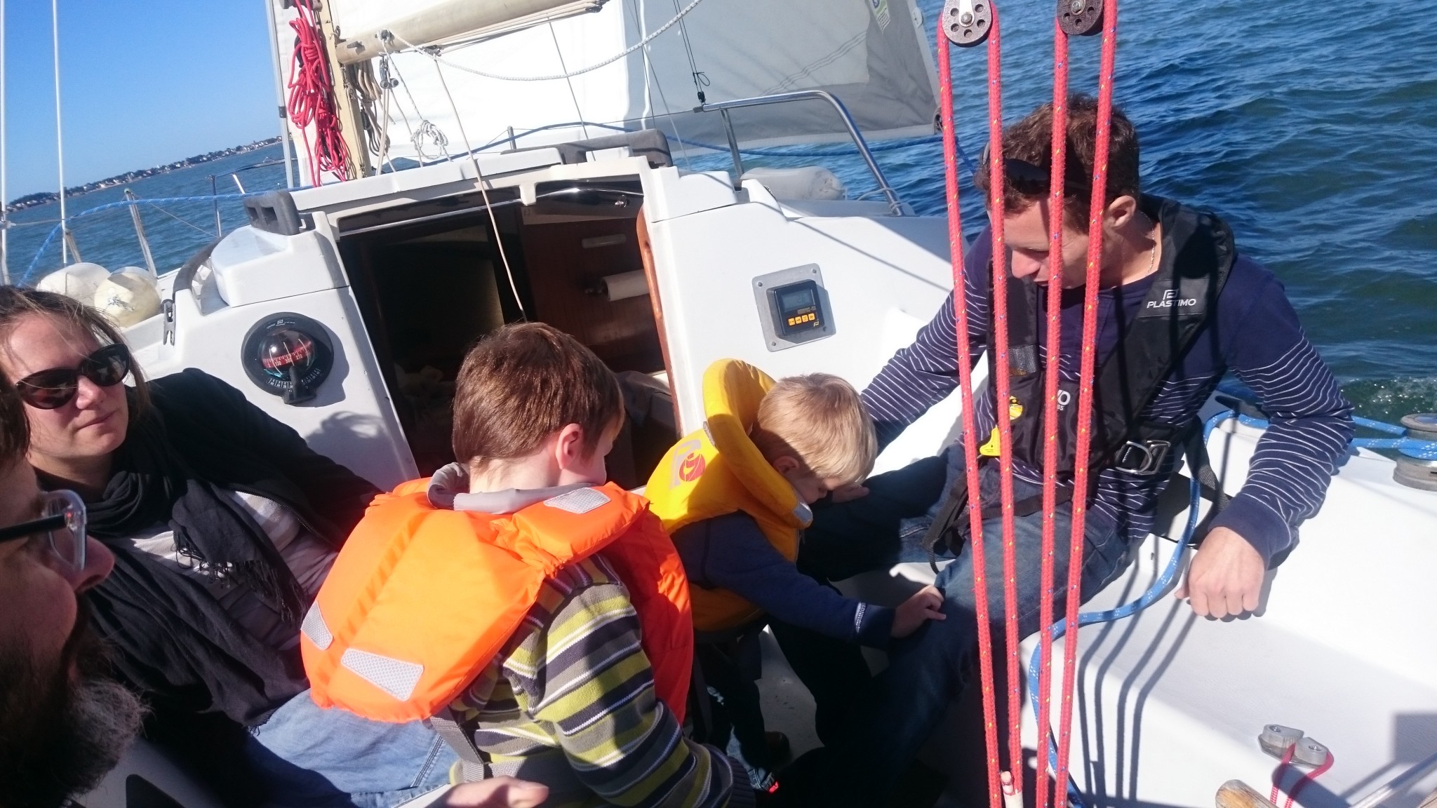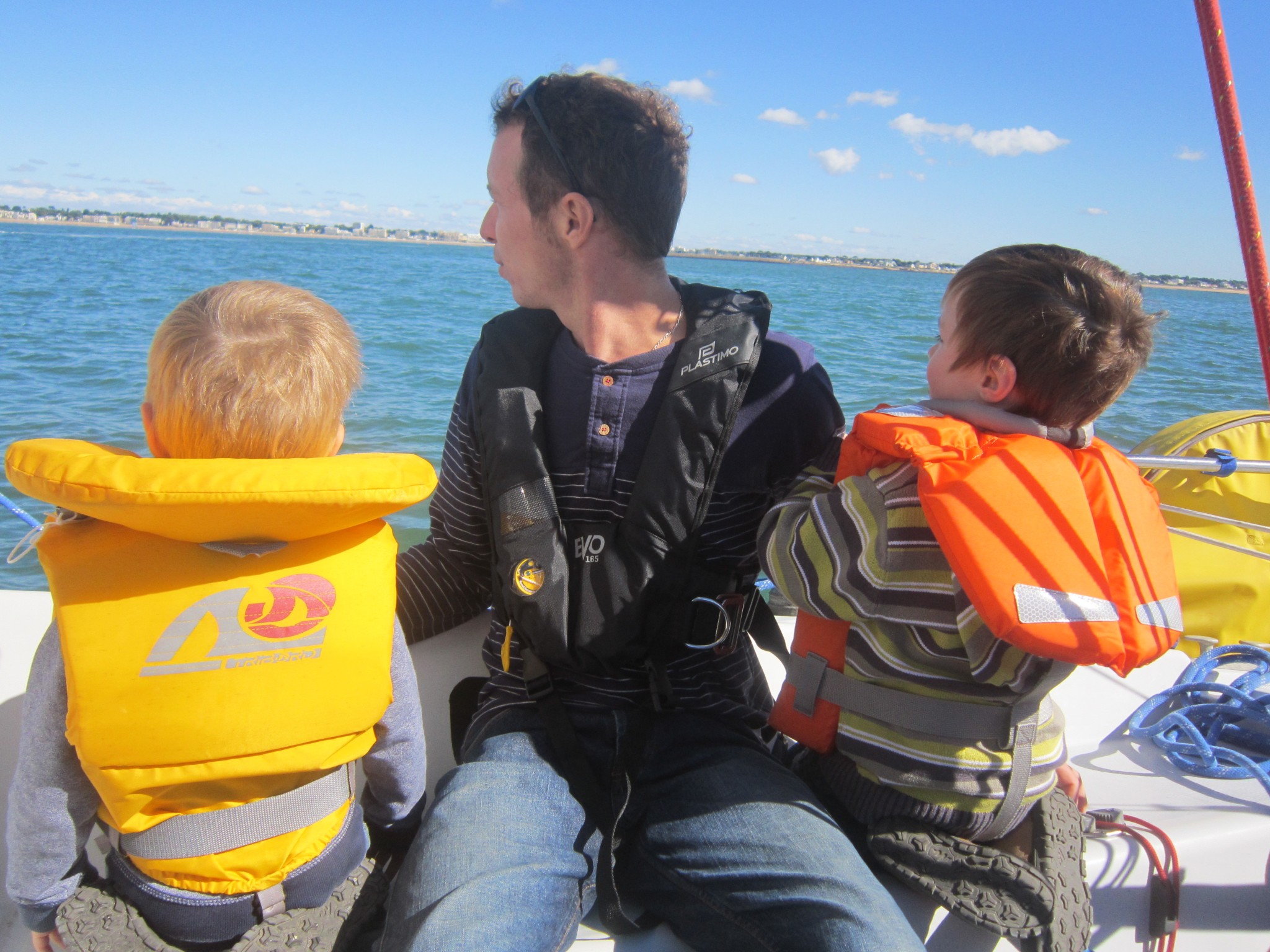 C’étaient les tout premiers à monter à bord, David et son grand étaient avec moi le jour de le mise à l’eau. On avait alors déplacé le bateau d’un ponton sur l’autre. Depuis visiblement, le « bateau de Ghismo » revient de temps à autre dans les discussions familiales. J’ai des gilets pour toutes les tailles d’enfants, et avec le beau temps annoncé, c’était le moment de réitérer l’opération, cette fois ci en mer.