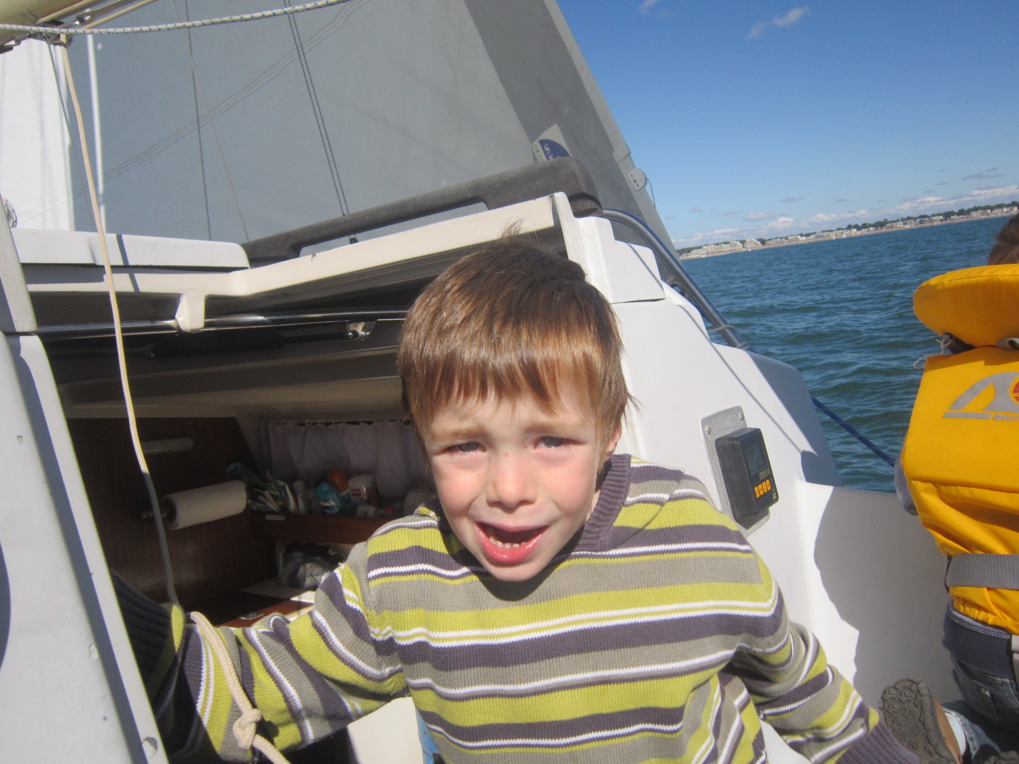 On nous annonce un tout petit 2 beauforts se renforçant à 3 dans l’après midi, on ne risque pas grand chose, mais on se demande quand même si on ne devrait pas accrocher les petits. Le départ est donc bien tranquille, et les petits s’étonnent de tout : pourquoi ça bouge ? pourquoi tu arrêtes le moteur ? pourquoi c’est un bateau à voiles ? pourquoi tu tournes ? pourquoi on va pas se baigner ? comment tu t’appelles ? tu t’appelles pépé ?…