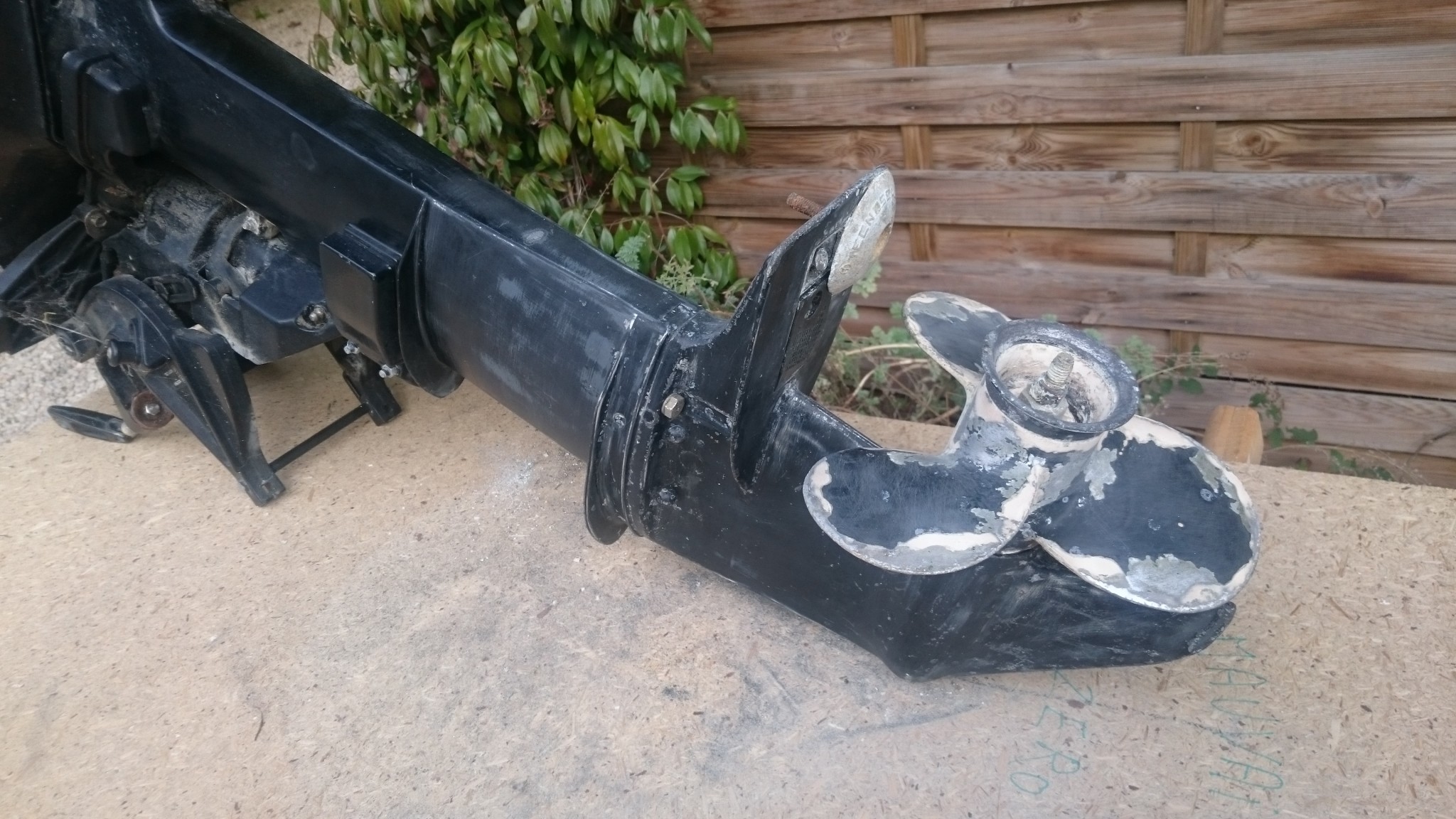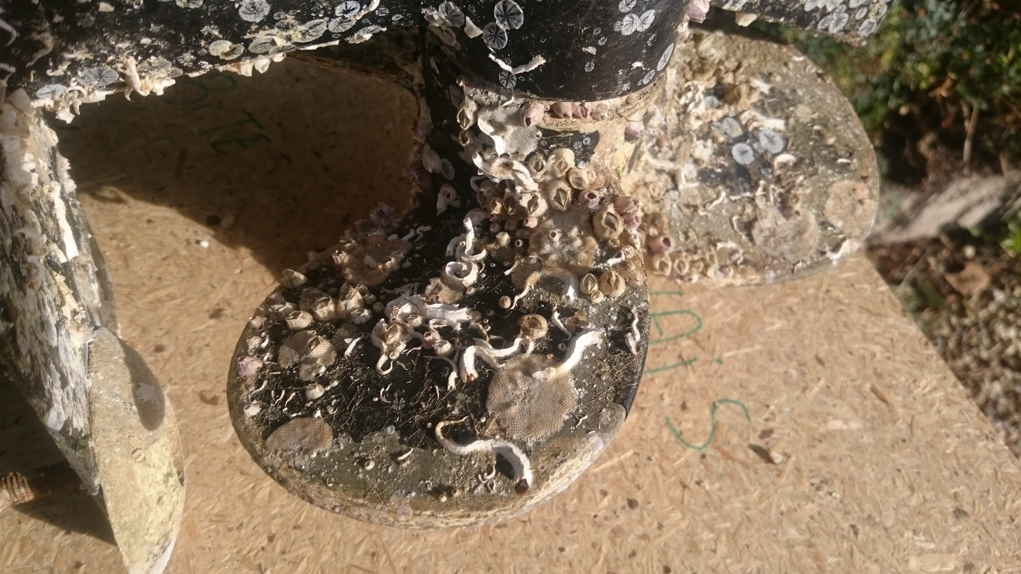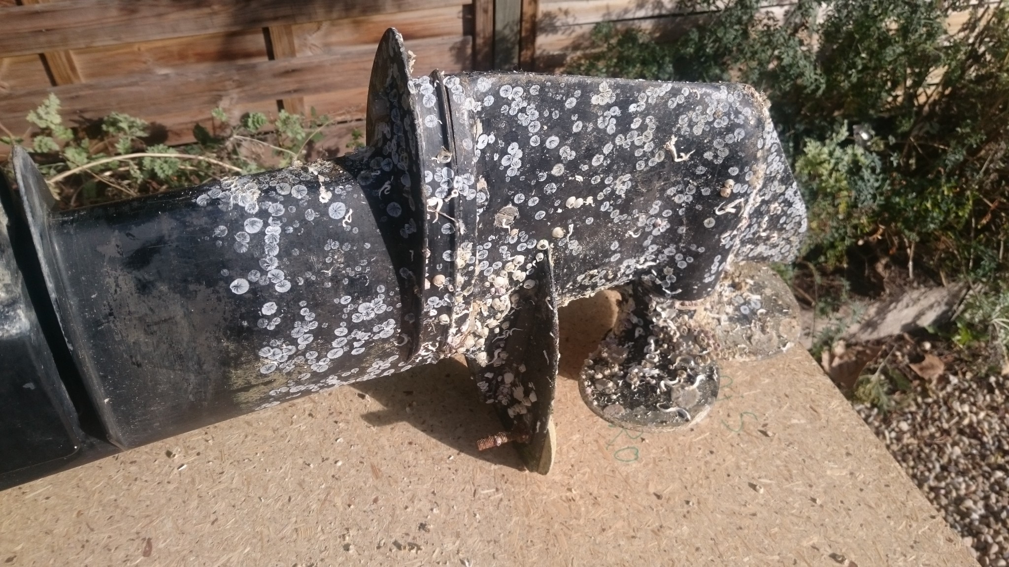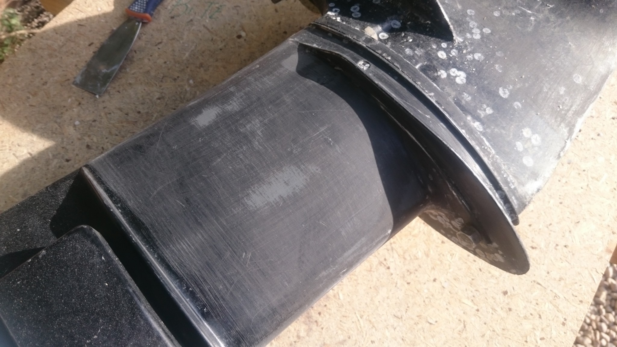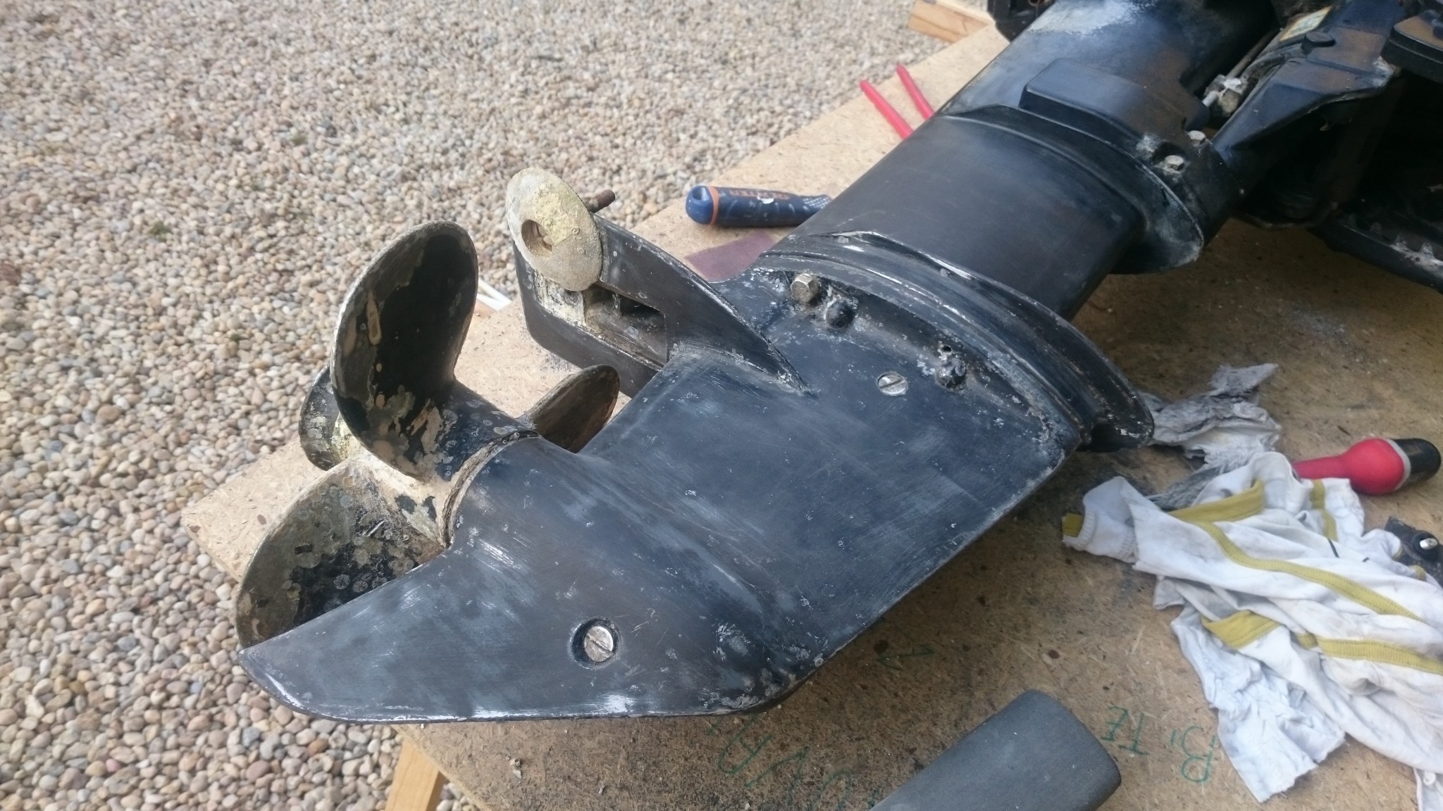 On était resté sur la stupeur et les tremblements d’un moteur totalement englouti par la faune et la flore locale de Pornichet, s’en suit une remise en état pas très simple. Ça se passe à la spatule en plastique qui ne fait pas de gros miracles, à la spatule métallique qui décroche les berniques, et finalement au papier de verre grain 180, en prévoyant une remise en peinture par la suite (et surcouché d’antifouling en spray). Il me restera à revenir avec quelques autres outils pour décrocher l’anode sacrificielle qui semble avoir fait son temps et mérite d’être remplacée. L’hélice sera également enlevée pour un traitement plus minutieux. Au moins je suis content d’avoir aussi bien récupéré la crépine !