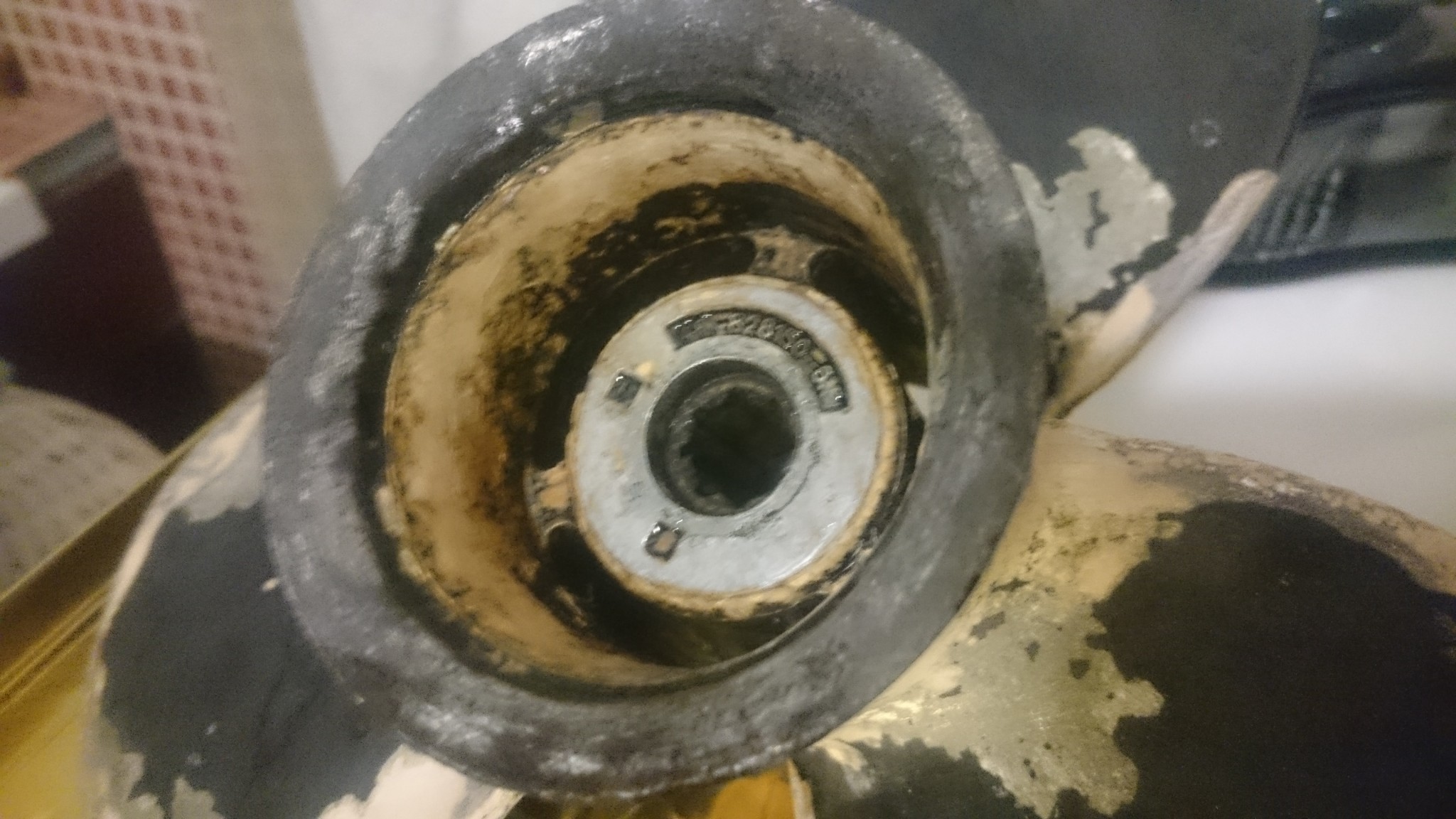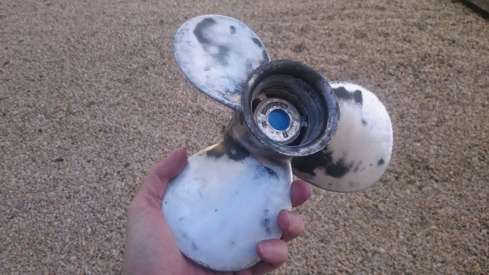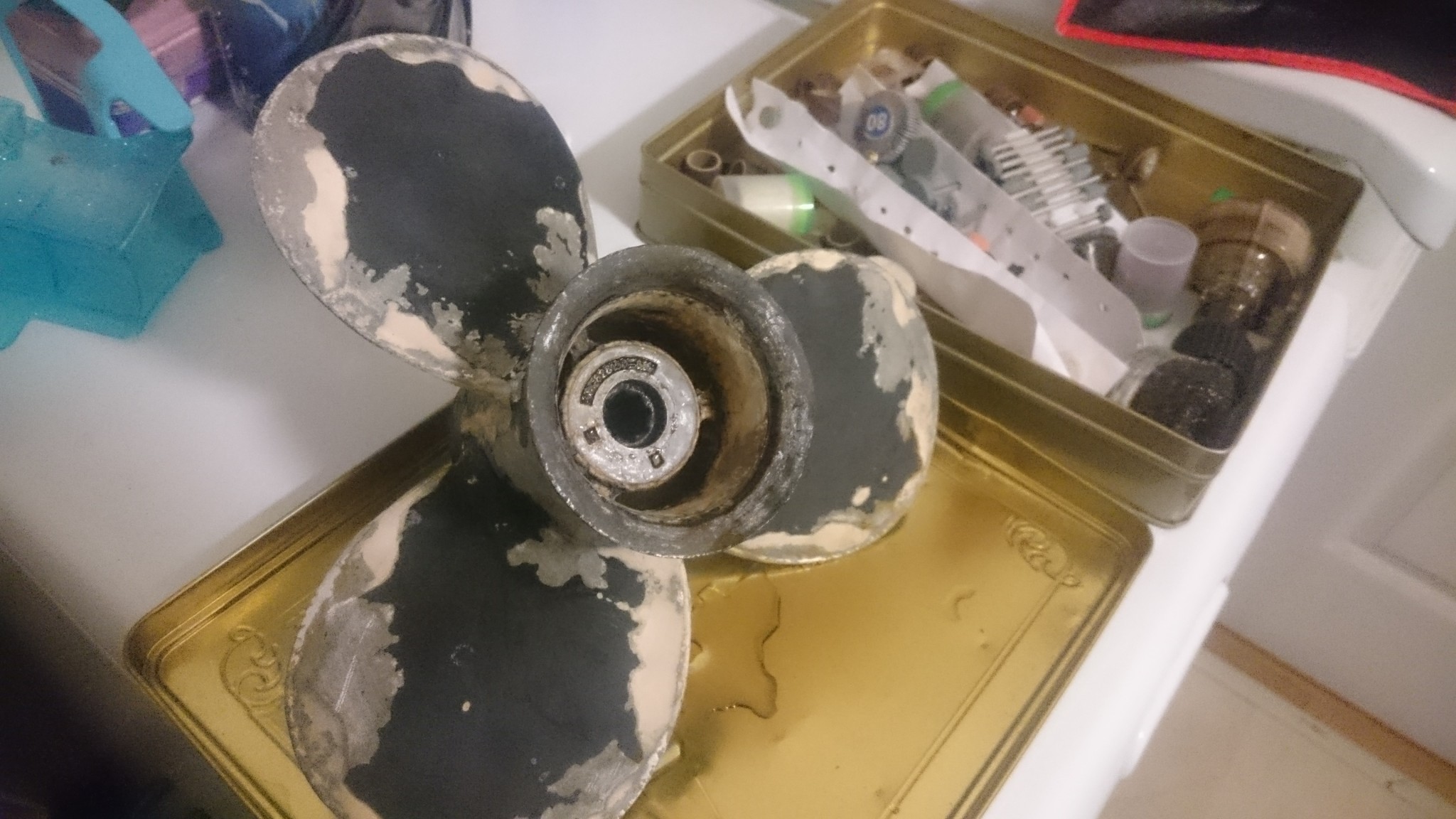 On commence par l’hélice qui est désormais désolidarisée du moteur. Elle n’est pas très belle, et depuis qu’on a le moteur, elle présente de larges parties à la peinture écaillée et des traces d’un blanc laiteux dont je ne sais toujours pas trop s’il s’agissait d’un mastic pour reboucher des trous, de vase très collante ou de corrosion. Sans en être trop certain, je privilégierais cette troisième option…