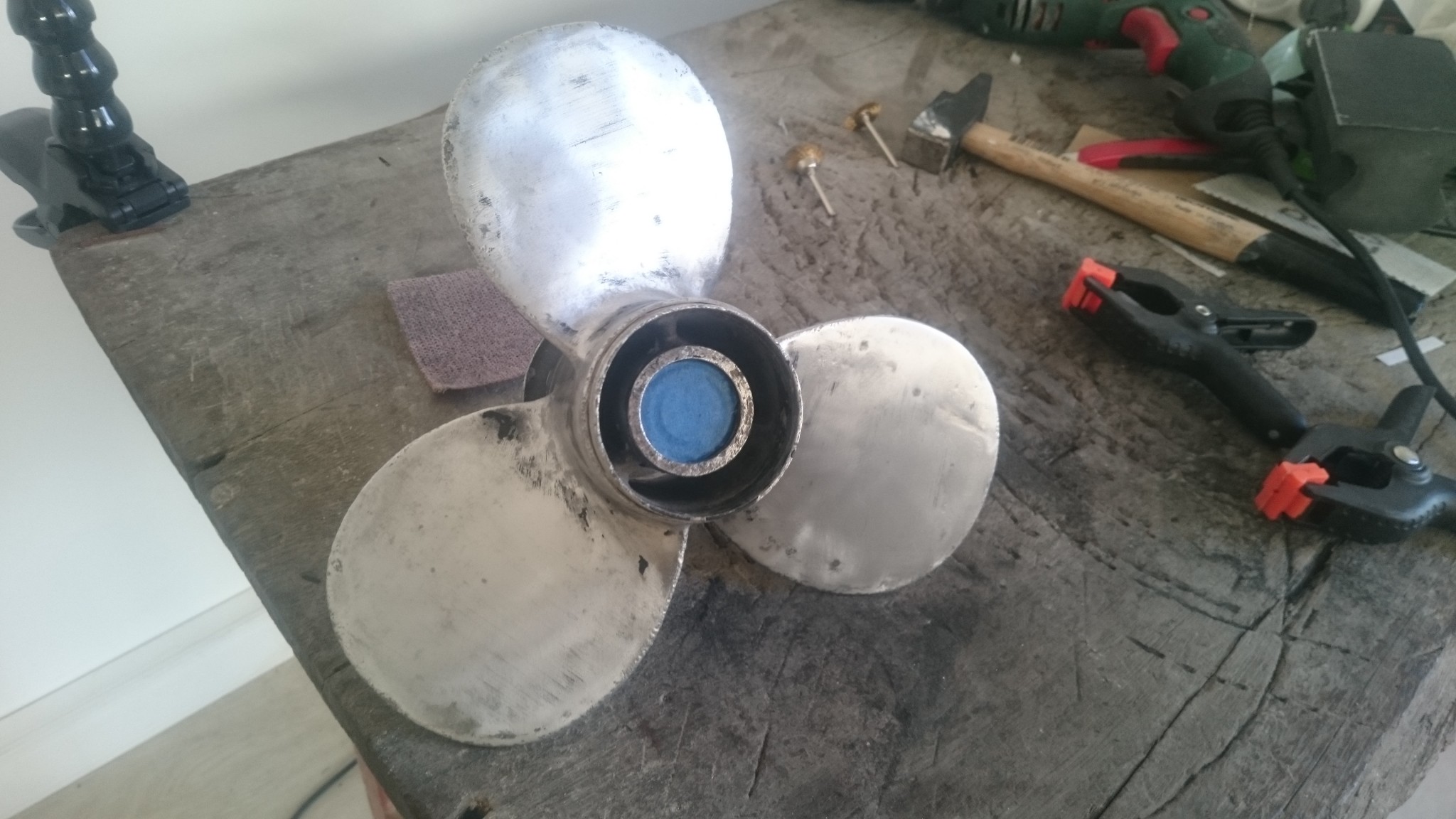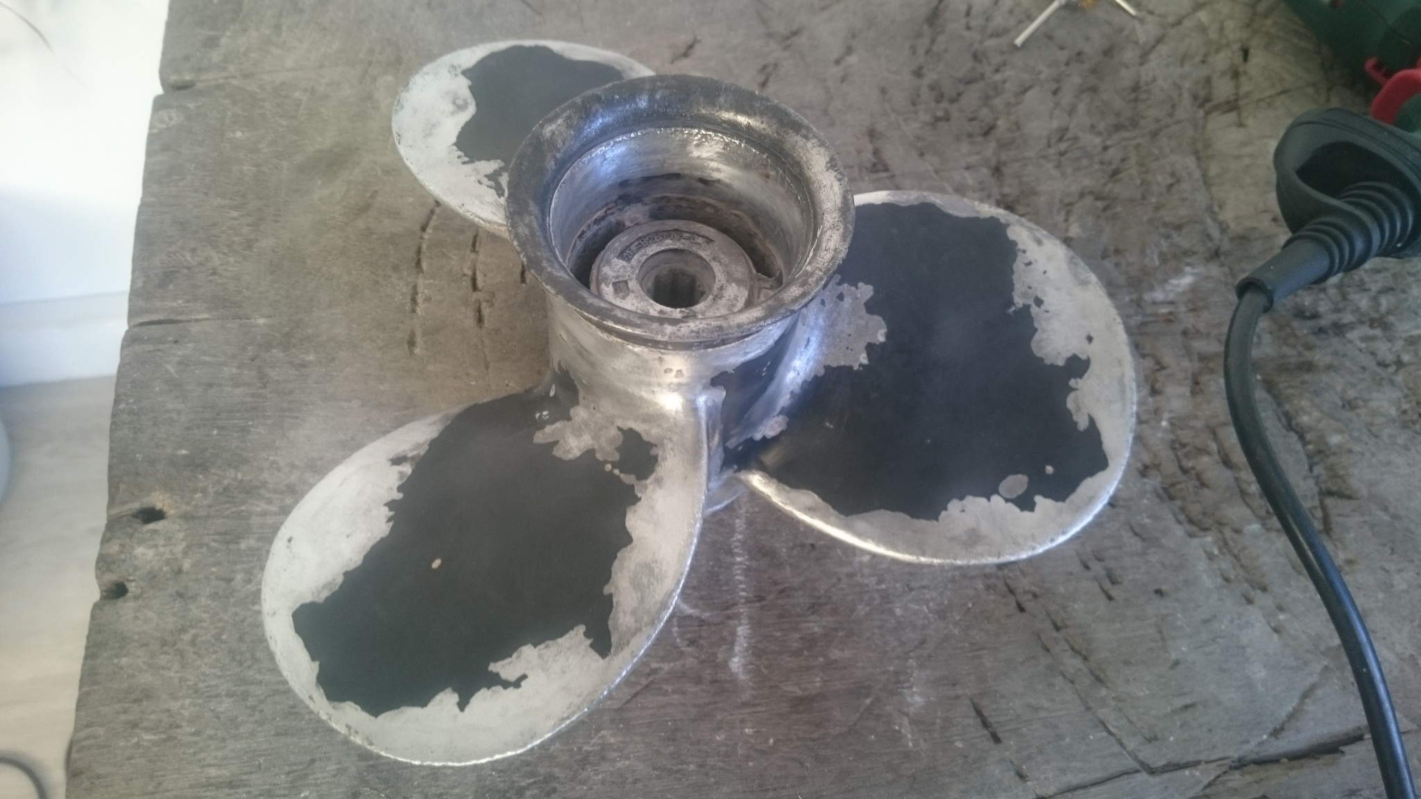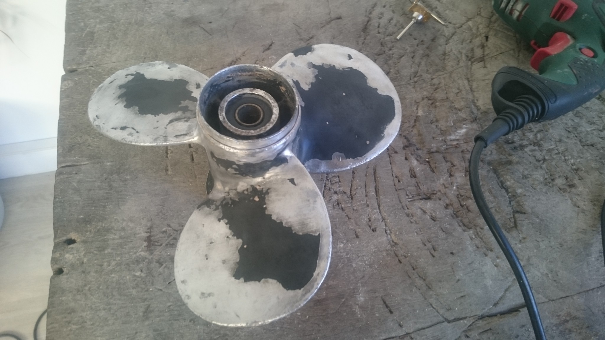 Vendredi soir, j’ai mon hélice dans mon sac, et de retour à la maison, je joue de la Dremel dessus avec de petites brosses métalliques. Ca marche relativement bien sur les parties qu’on qualifiera, sans trop savoir, de corrodées, mais ces brosses sont très fragiles, et je décide de ne m’occuper que des parties les moins accessibles.