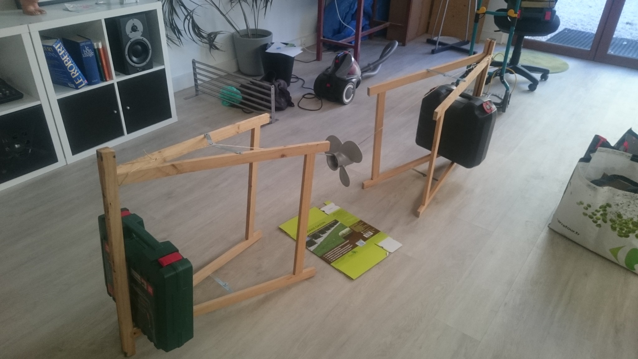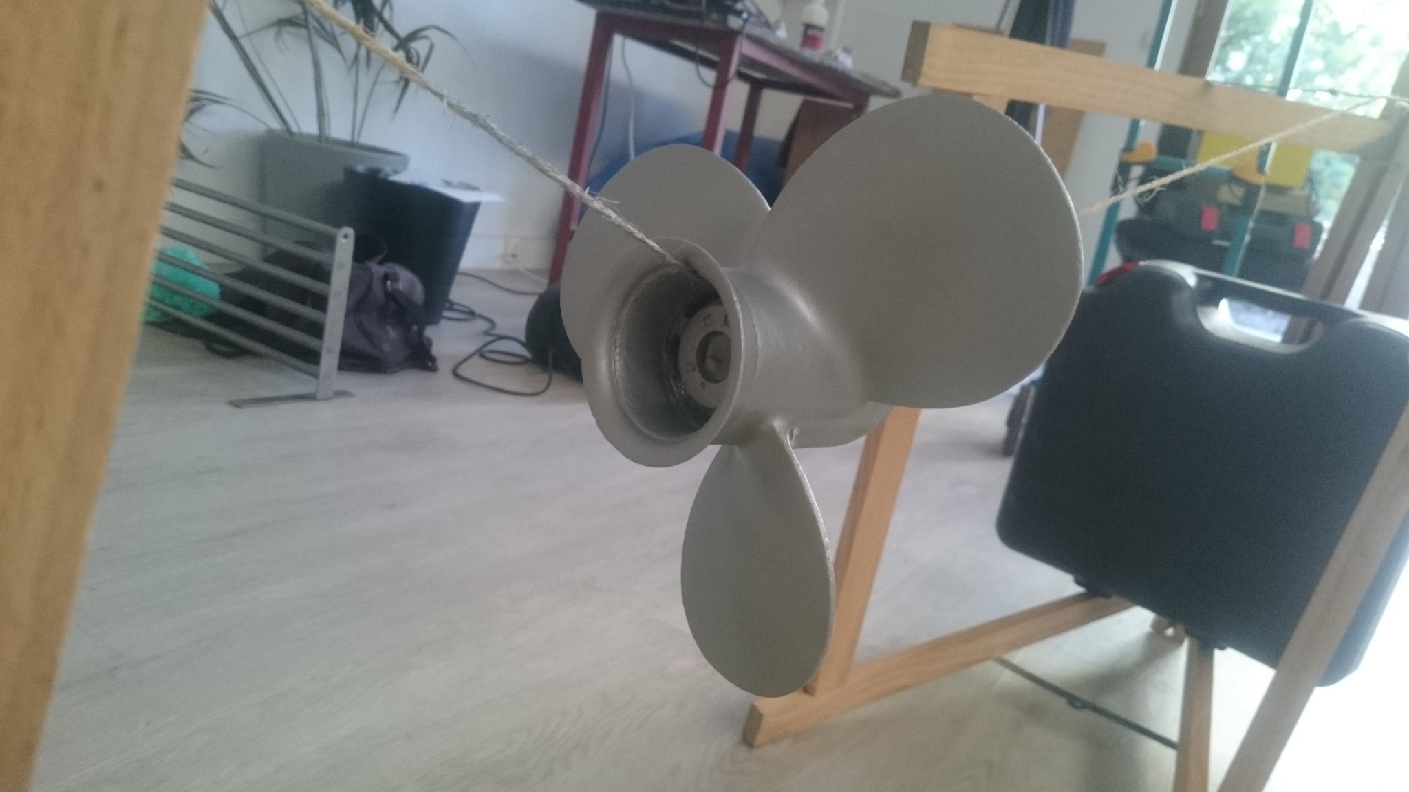 L’hélice est prête à peindre, il fait beau dehors. Je la suspend à un fil entre deux tréteaux, mais le poids de l’hélice fera tomber alternativement l’un puis l’autre des tréteaux dans un ballet qui amusera mon épouse tout le week-end. Une fois lesté, le tout tient droit, et je commence à secouer ma bombe de primaire spécial hélice. Du P7 Nautix. L’hélice va très vite à peindre, et le résultat fait très plaisir !