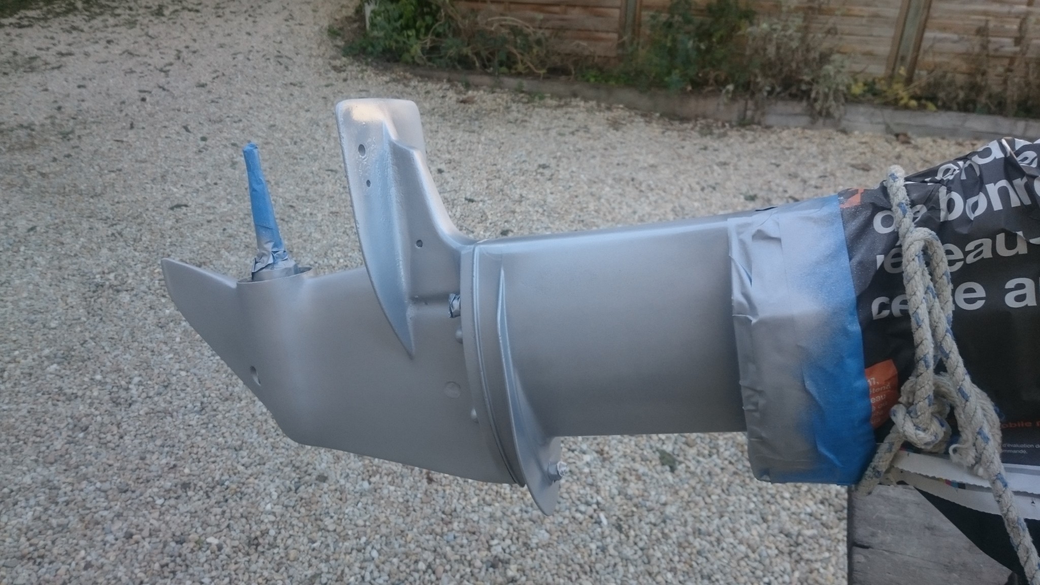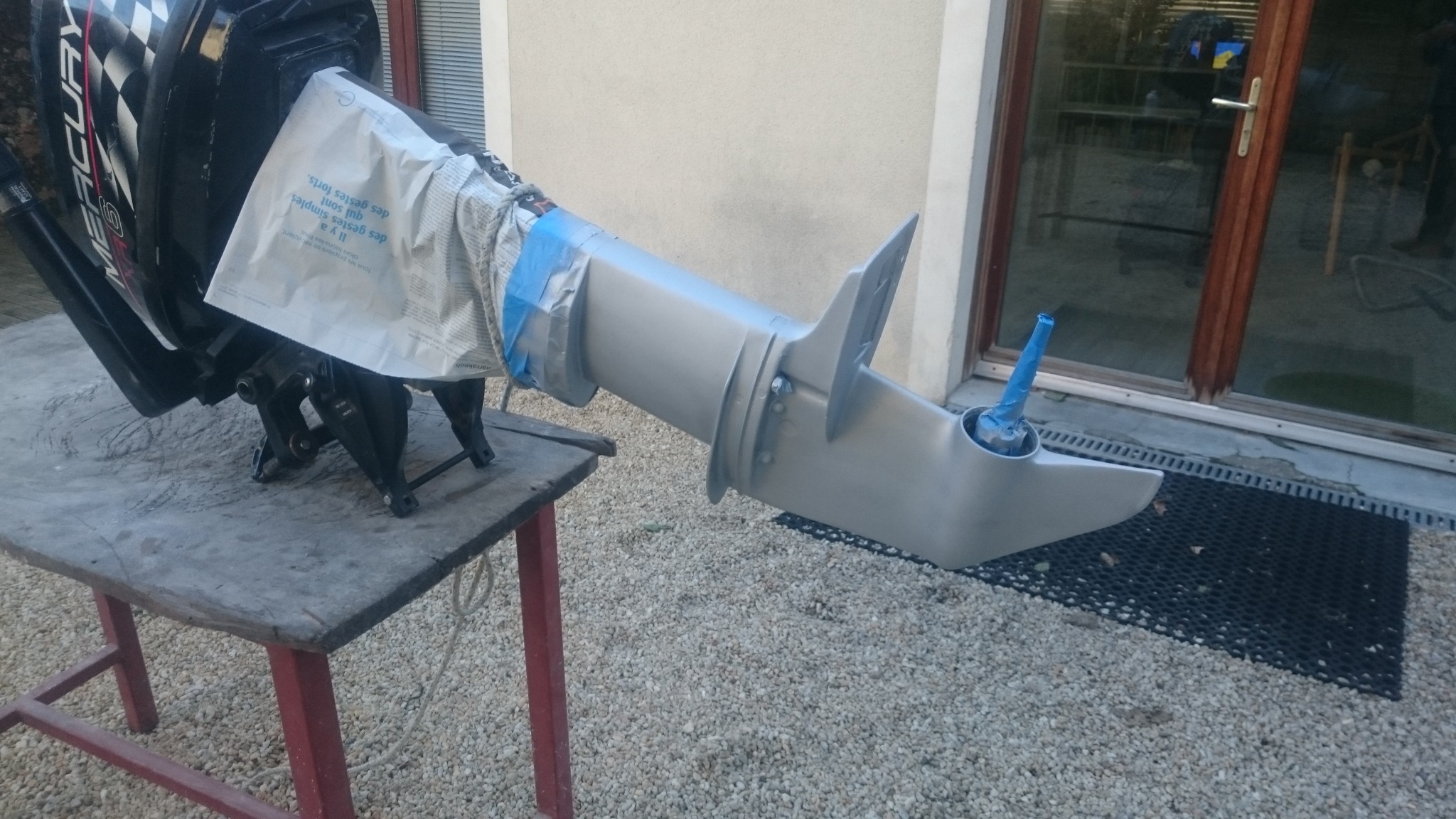 Je m’attaque alors à l’embase du moteur, sur lequel je repasse avec la brosse métallique. Je passe un peu de temps avec le boulon qui tient l’anode et qui est bien rouillé. Il eut été un temps où je cherchais à récupérer ces pièces indélicates, depuis, ma décision est bien plus rapide à venir : « tu veux pas venir, tu vas voir ce que je fais avec une Dremel ! ». Le boulon découpé, je masque les parties qui ne doivent pas être peintes (en particulier les écrous et têtes de vis), et zoup je peux me casser le dos à porter seul mon moteur dehors et à le hisser sur mon établi. Là encore, ça va très vite à peindre et le résultat fait très plaisir.