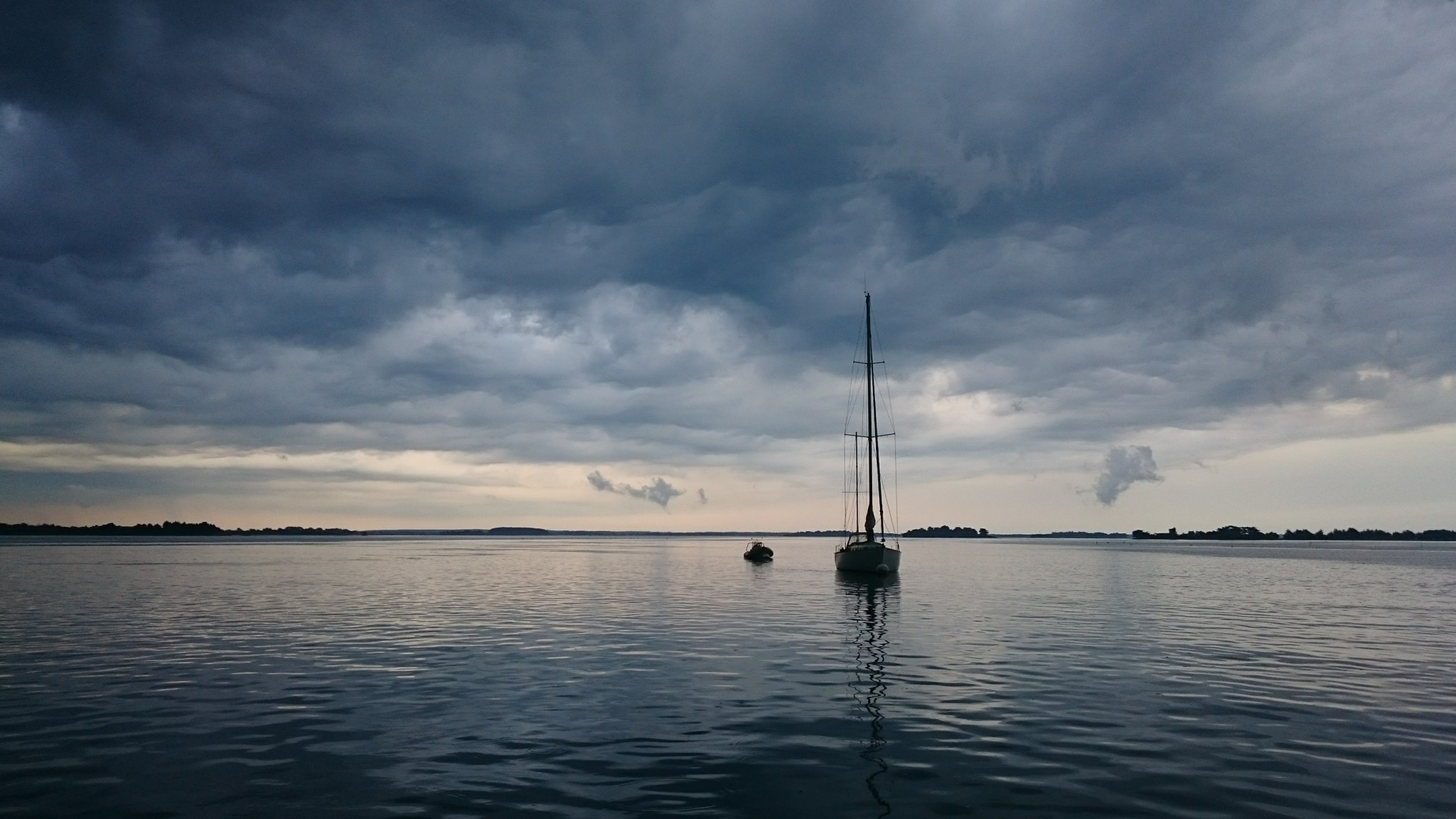 Je reçois sur l’eau un appel de Patrice, organisateur en chef de la flottille qui me dit d’attendre avant de passer Port Navalo, on est à l’étale de pleine mer avec un gros coefficient, il faut attendre au moins 1h30 avant que le flux ne s’inverse. On sera trois voiliers à tenter le coup néanmoins. Un seul parviendra à passer, nous sommes sous voile et au moteur pleine balle, on parvient à se déplacer latéralement, mais on ne progresse pas d’un pouce. Je décide alors de faire demi-tour, et on jette l’ancre sur la petite plage de Port Navalo. On casse une petite croute à bord en attendant une heure plus propice au passage. L’heure venue, on décolle et on se place dans le flux qui s’est inversé et on se prend un petit grain sur le coin du nez.