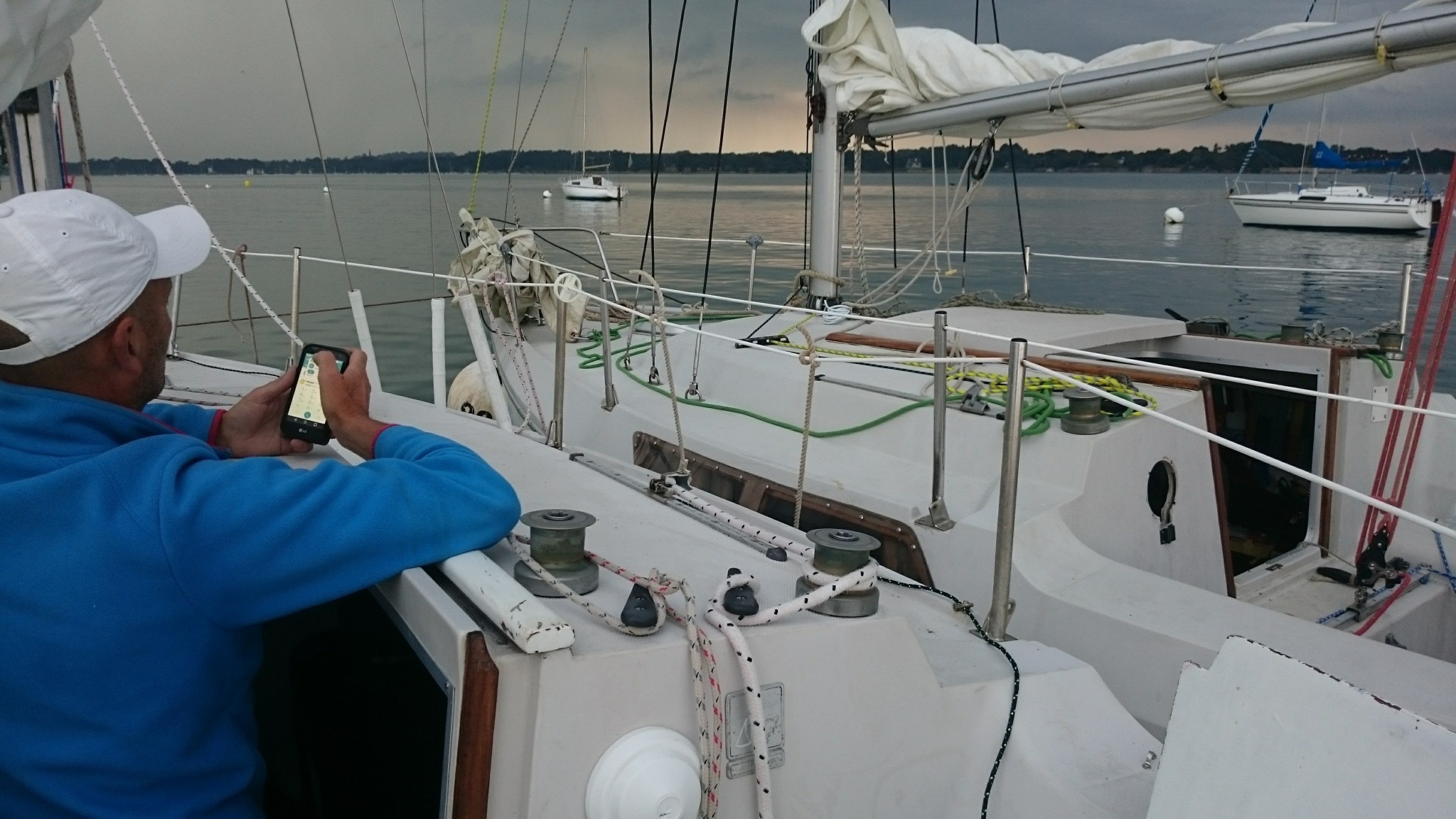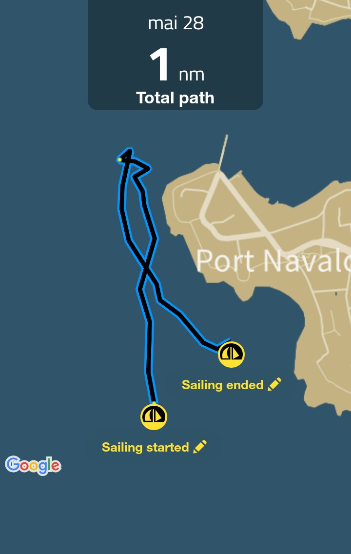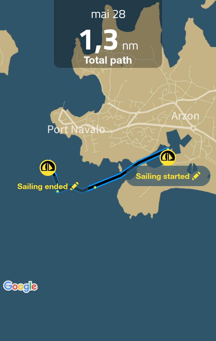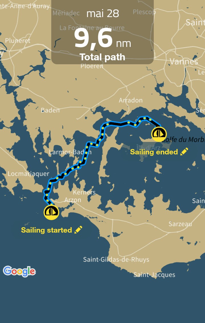 5h30 de navigation pour environ 12 milles parcourus, une pointe à 8 noeuds qui n’est pas du tout représentative de cette journée très tranquille. Trois traces car le courant qui nous a retenu a fait penser à Sailing Log qu’on était arrêté.