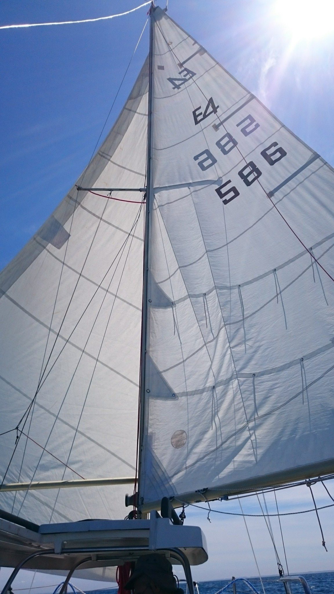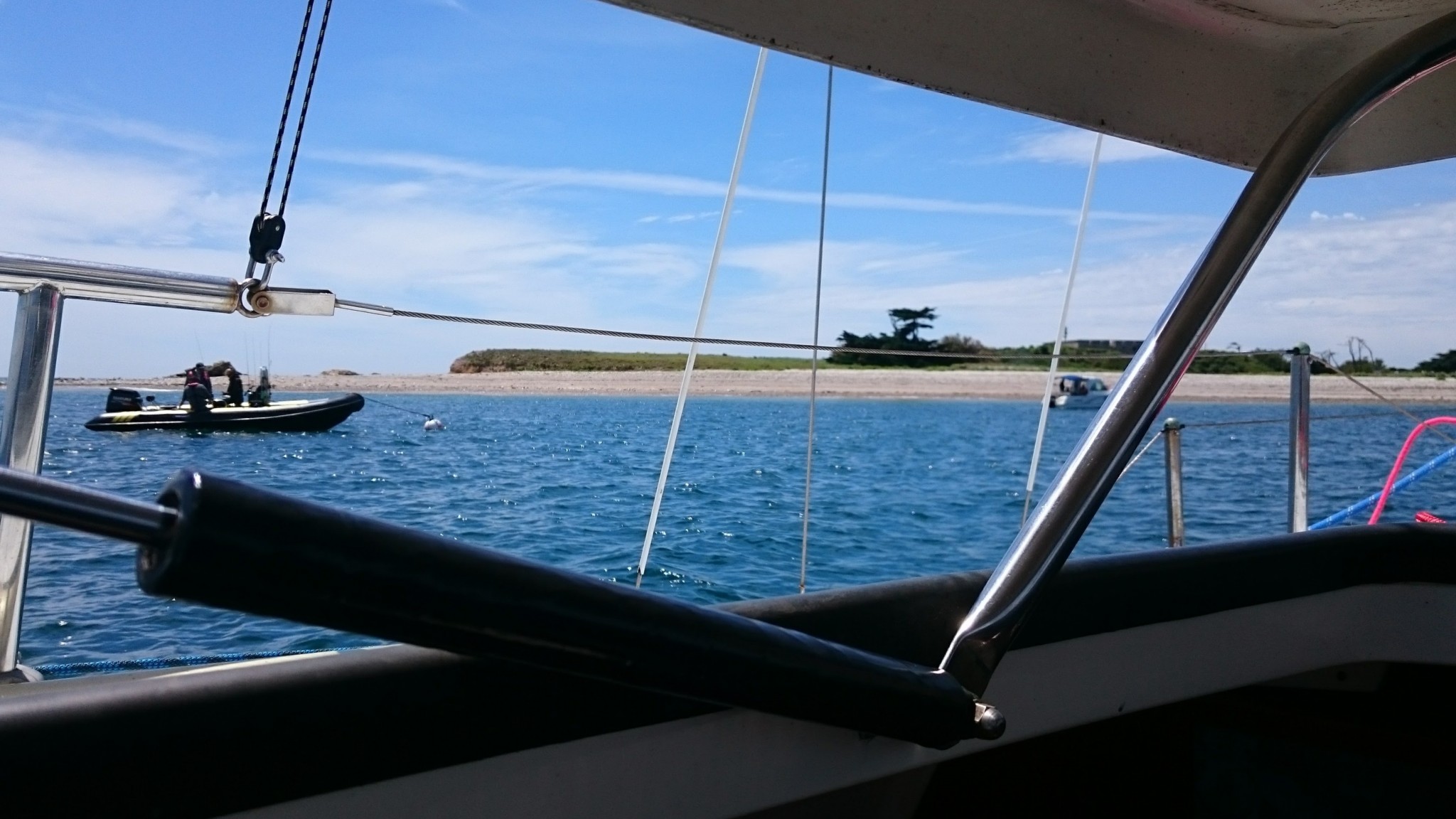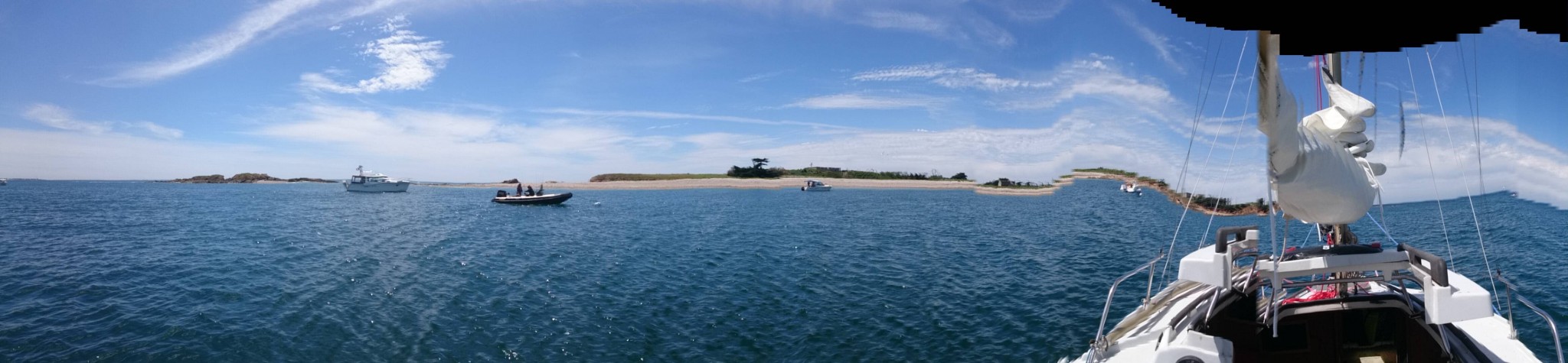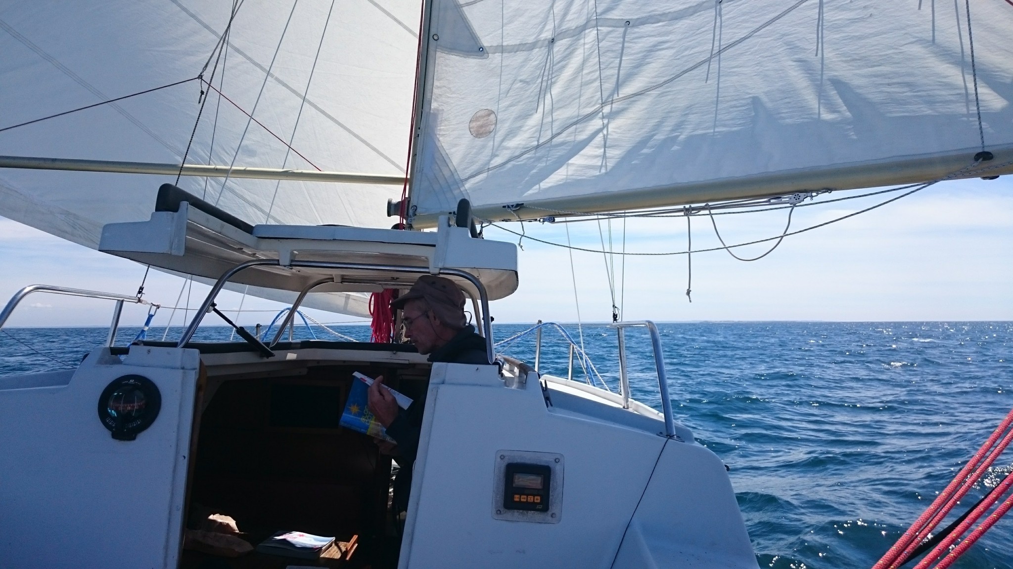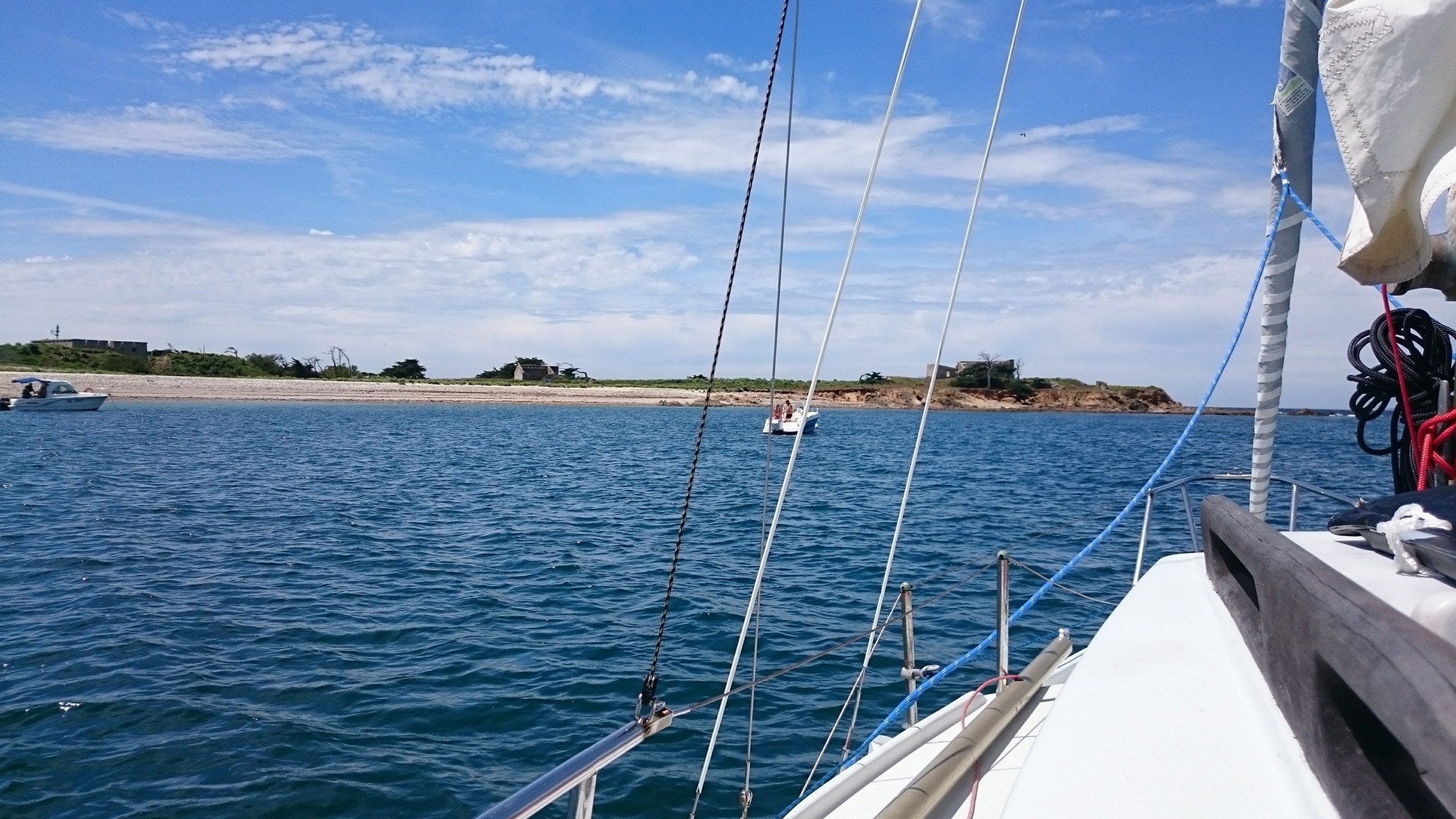 On ne s’attarde pas au Crouesty, on a de la route et même avec le peu de vent dont on dispose, on y croît et on coupe le moteur en face du port. On a du vent un peu d’air sur l’arrière, on tangonnera le génois et bloquera la GV pour qu’elle ne batte pas trop. Le peu d’air finit par nous pousser tranquillement, puis franchement au moment de passer la pointe de Saint Jacques. On remonte sur un gros Evasion qui nous avait dépassé en sortant du Crouesty et qui faisait route au moteur. En nous voyant (peut-être), il entreprend de hisser ses voiles. La matinée se déroule ainsi : on surfe sur la houle et le paysage défile. De plus en plus vite.