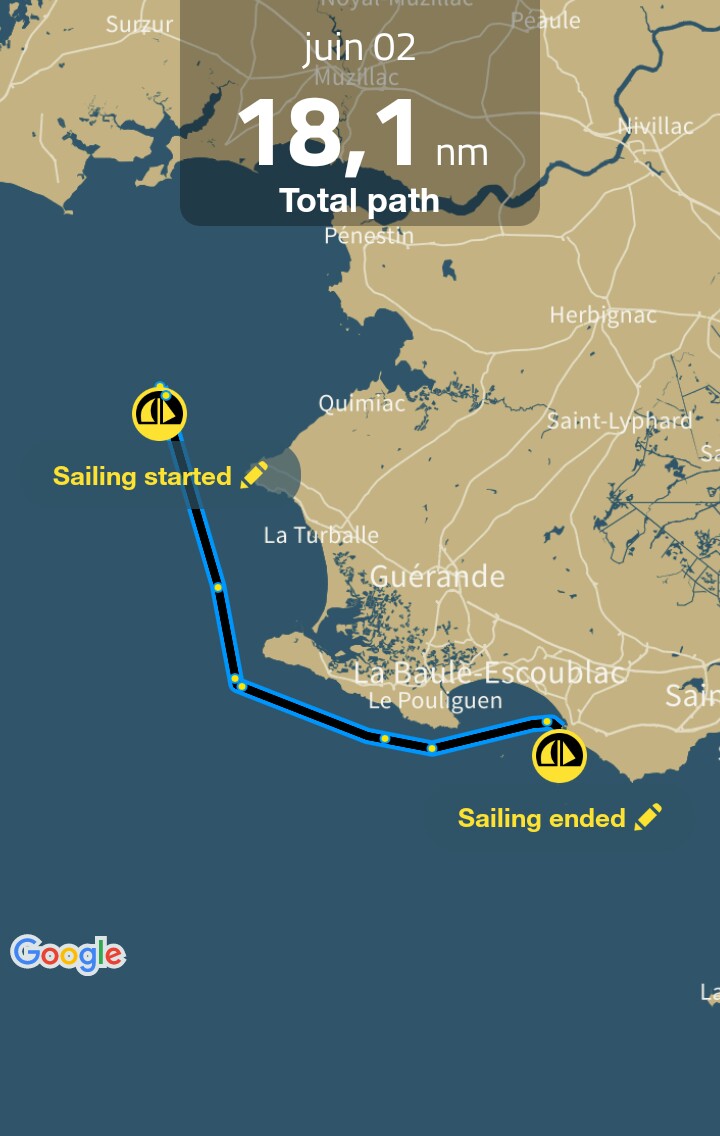 La côte de Batz au Pouliguen défile comme jamais, on fait cap direct sur la baie de la Baule plein vent arrière, et ça pousse. Je peux le dire, les brios ne sont plus là, mais on se compare cette après-midi à un gros cata qu’on ne lâchera pas ;)