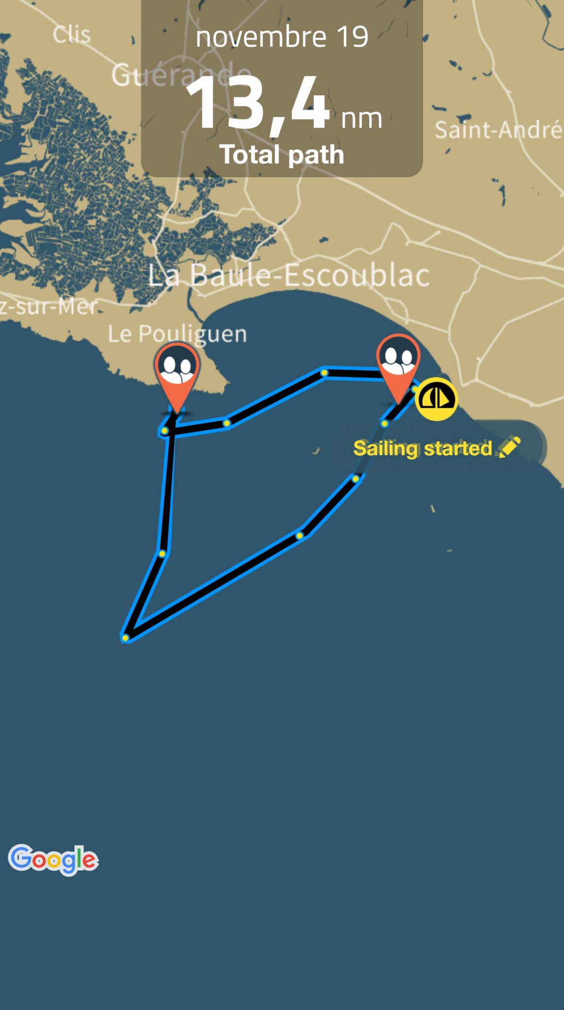 Bilan de la journée : 13,4 milles, 3,5 noeuds de moyenne (ce qui me paraît presque peu), 7,9 noeuds au max (ce qui me paraît exagéré).