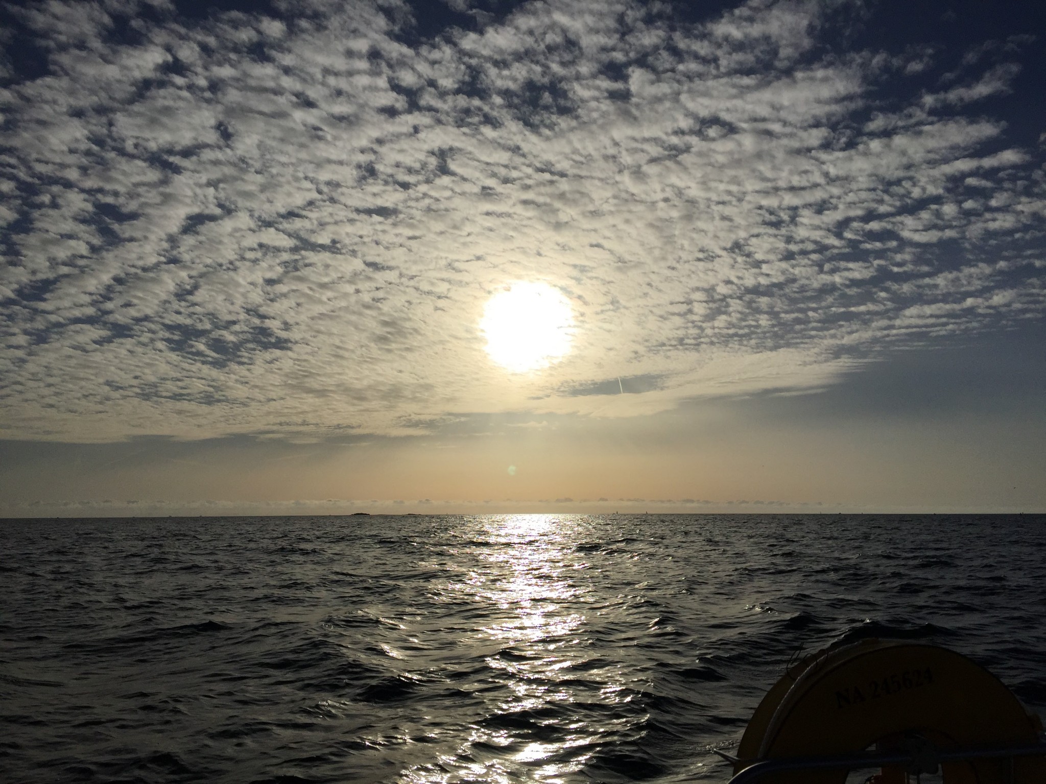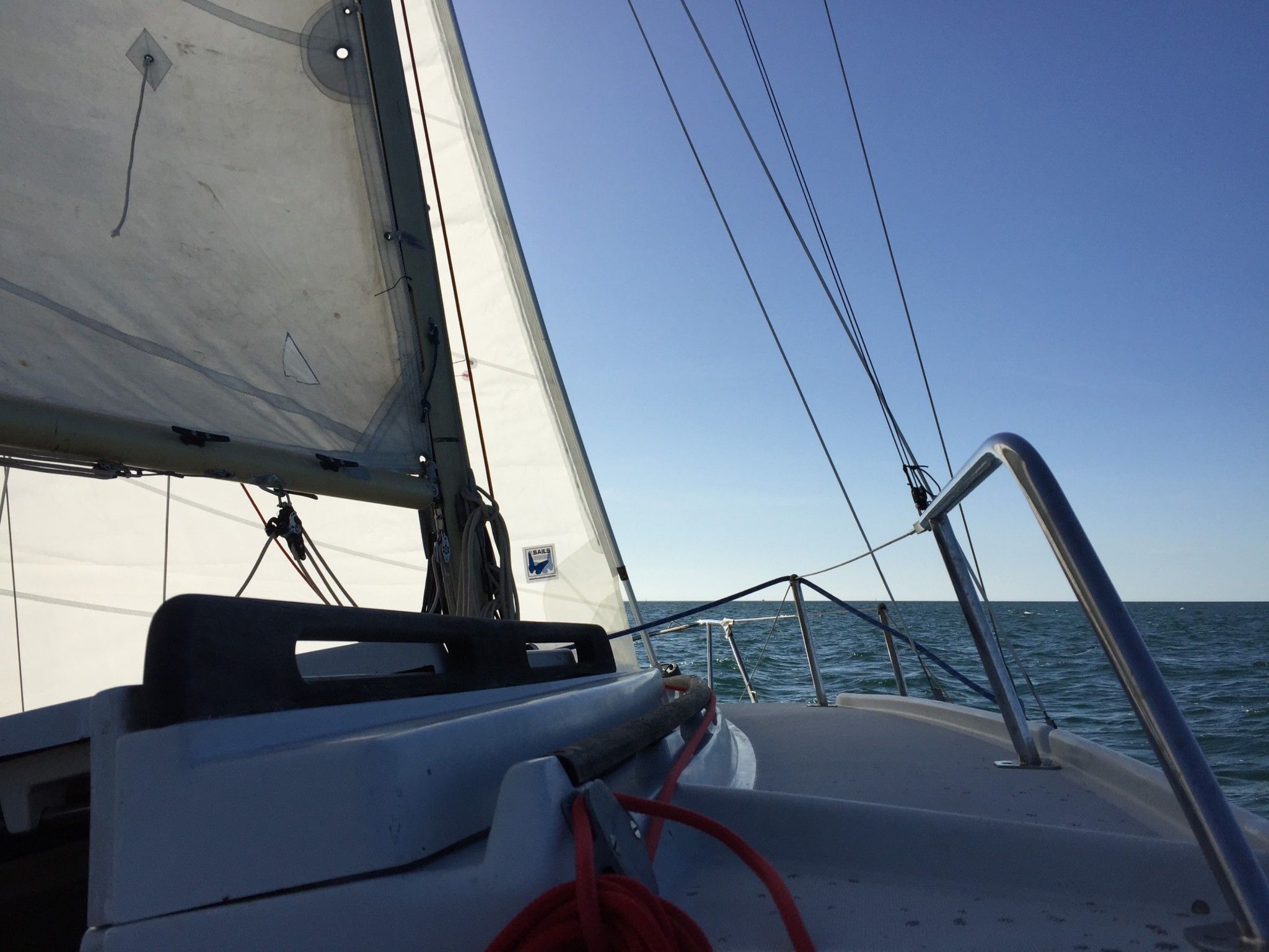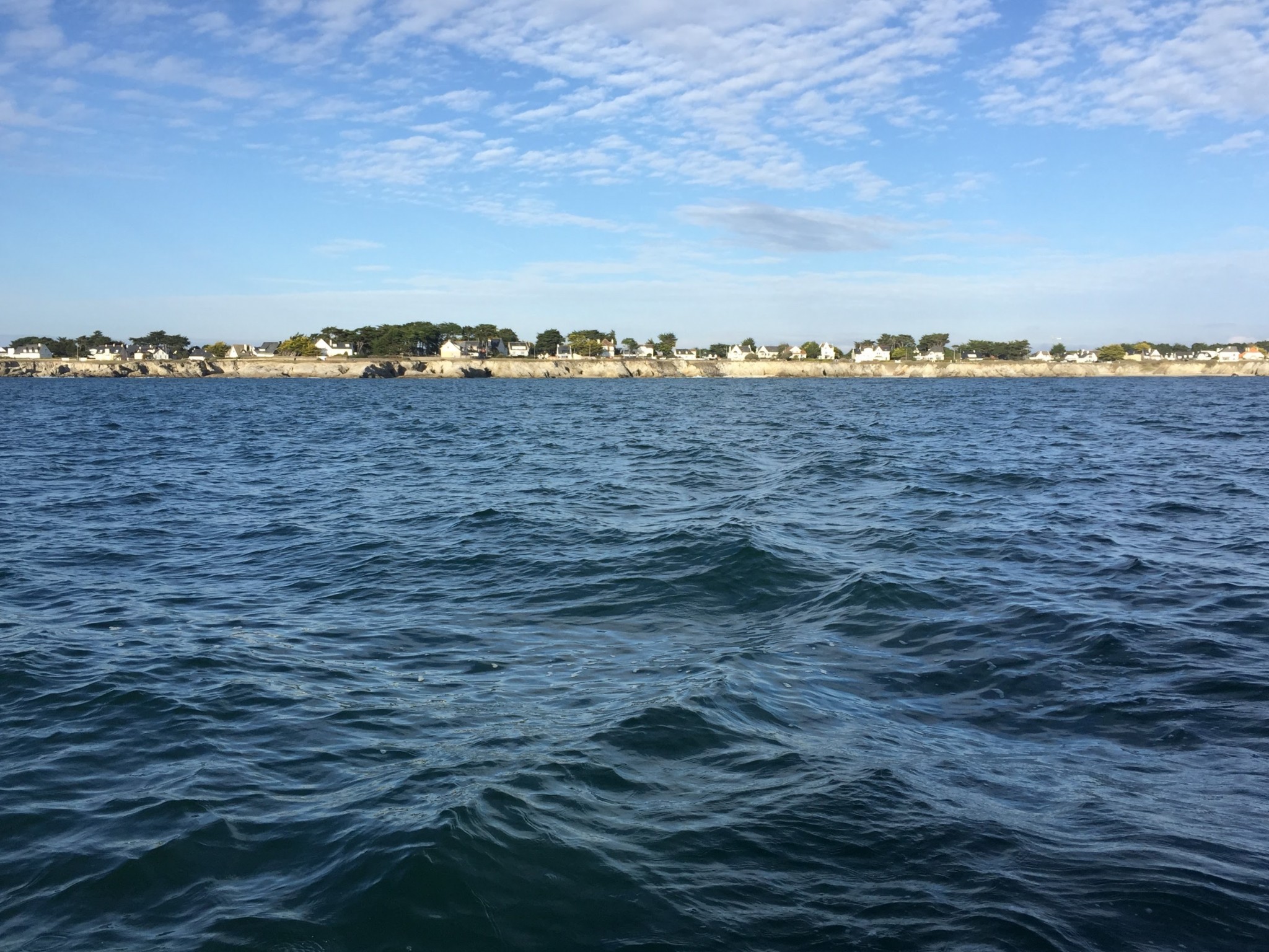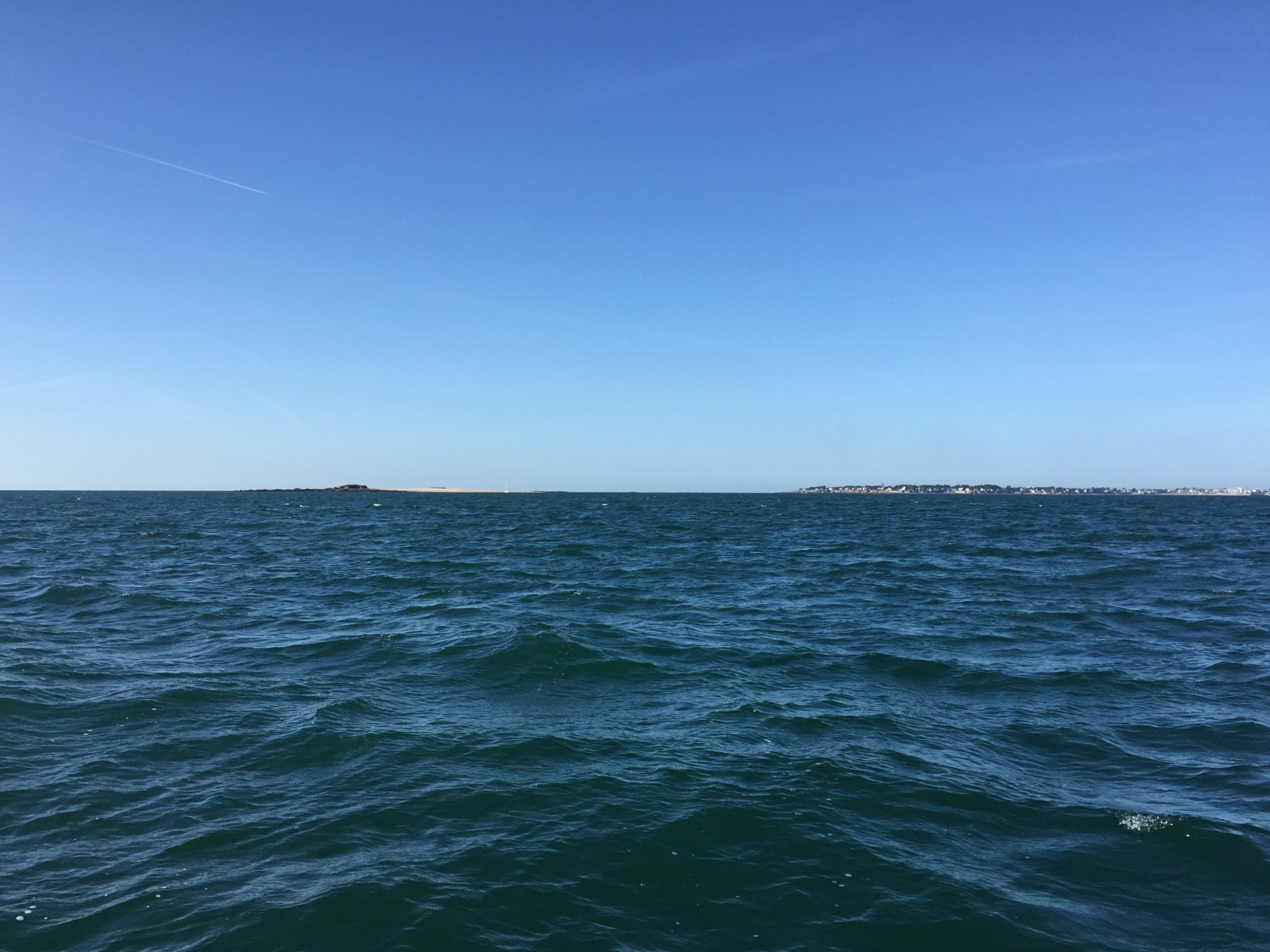 On file presque plein ouest et au près vers le plateau de la Banche, la mer creuse parfois, mais nulle doute, on avance ! On a assez peu de temps devant nous, on doit rentrer tôt au port, mais à cette allure, on a le temps de voir passer du paysage. On change de bord en espérant arriver le plus possible vers le clocher de Batz. Finalement on ne parviendra à pointer l’étrave qu’au niveau du Pouliguen, un instant j’envisage un autre bord vers Batz, mais on ne peut que repartir au large. Tant pis, on passe au portant, et c’est un bord bien agréable qui nous pousse jusque dans la baie de la Baule.