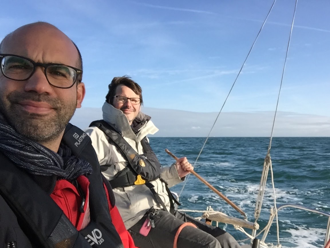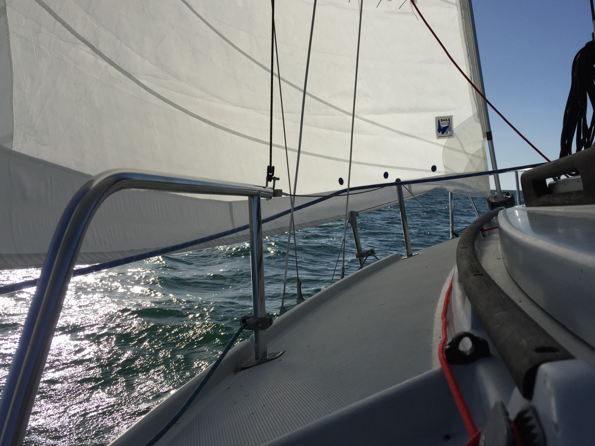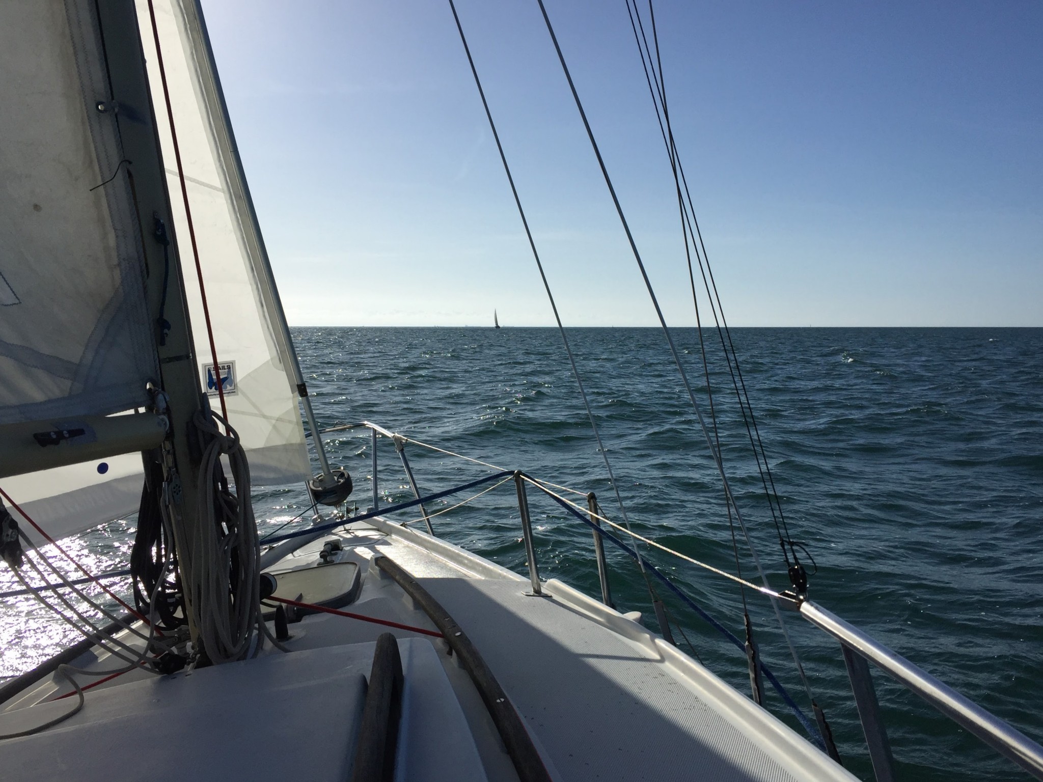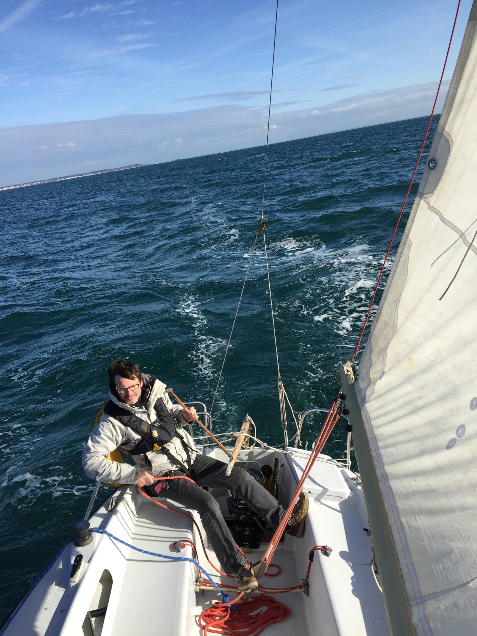 Aujourd’hui le ciel est parfaitement bleu, il ne fait pas froid, et on a un vent bien établi autour des 10 noeuds. Les régatiers sont toujours là mais filent aujourd’hui autours de leurs bouées à un tout autre rythme que la veille. On identifie des Dragons et des J80, et les dragons sont vraiment de très jolis bateaux. Certains nous font le plaisir de naviguer à nos côtés pendant un petit bord.
