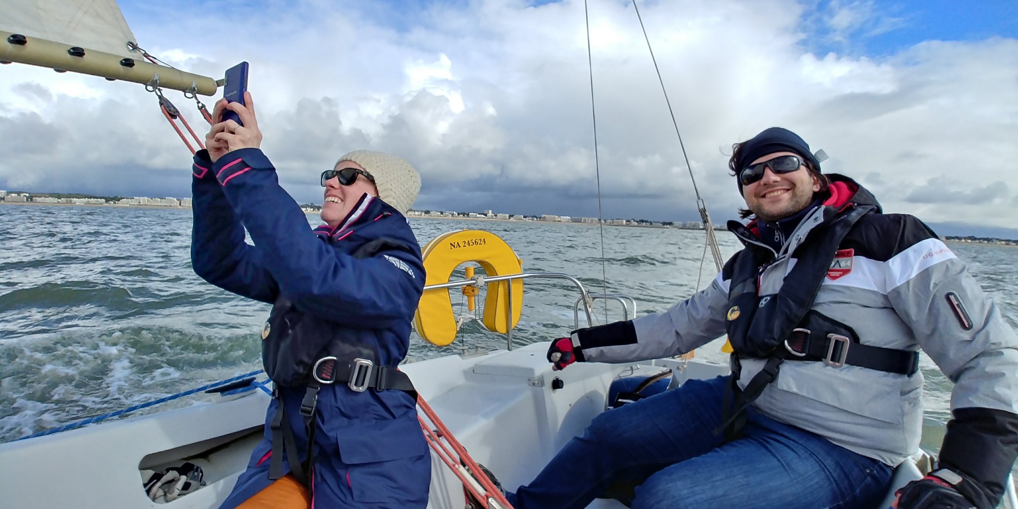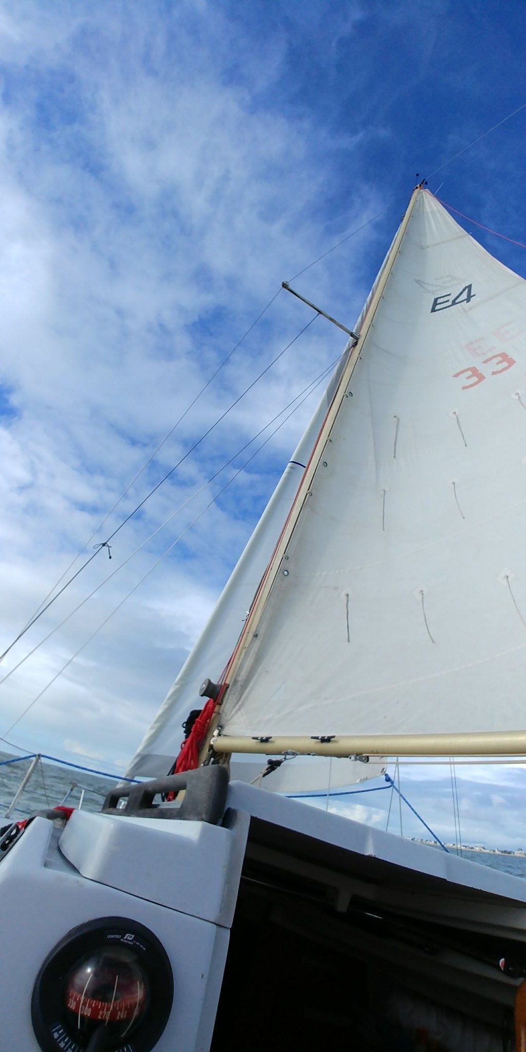 Le temps de tout installer, de chercher le sac avec mes écoutes que j’ai pensé un moment resté à Nantes, brancher la batterie qui ne donne absolument rien, charger la VHF sur le ponton, on est sur l’eau et aujourd’hui, c’est mon neveu qui barre dès le départ. Son épouse est avec nous et c’est une première pour elle.