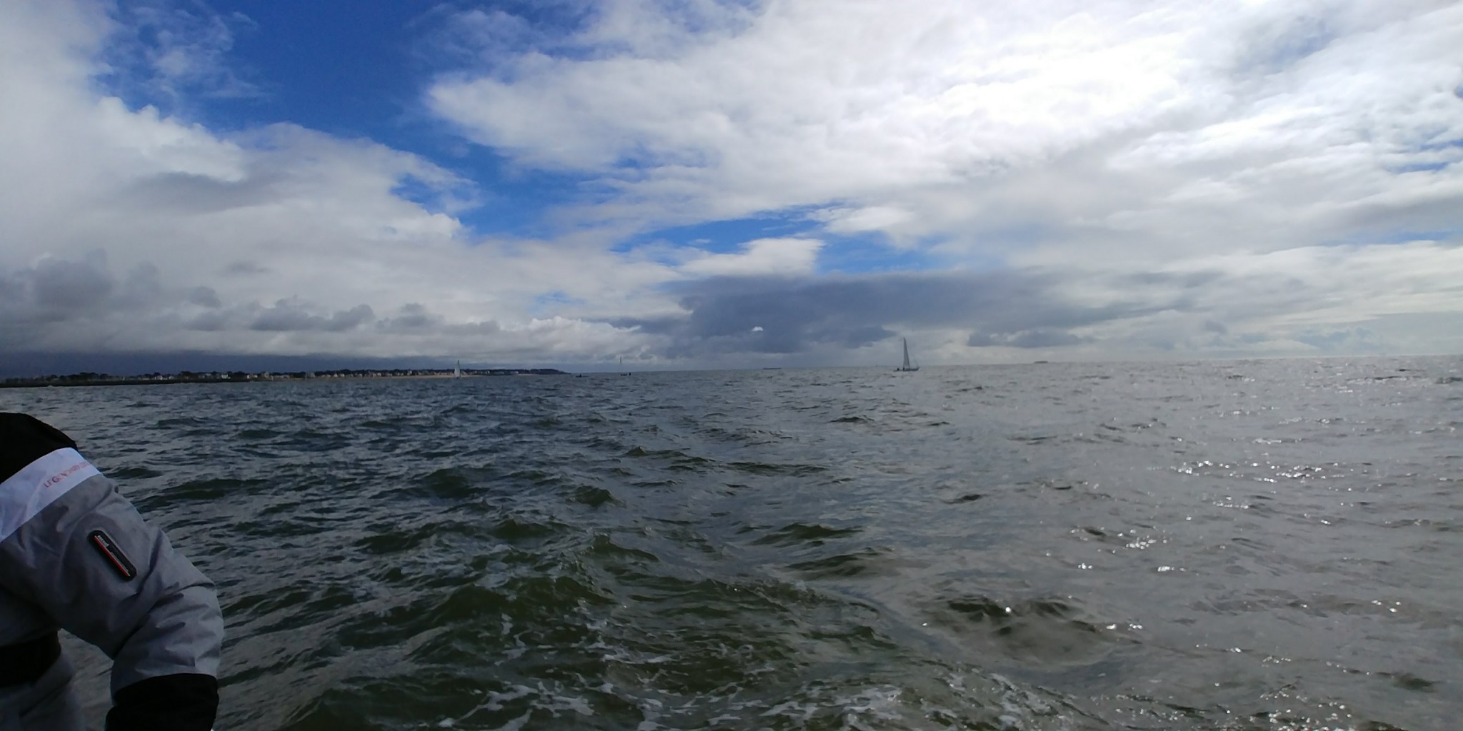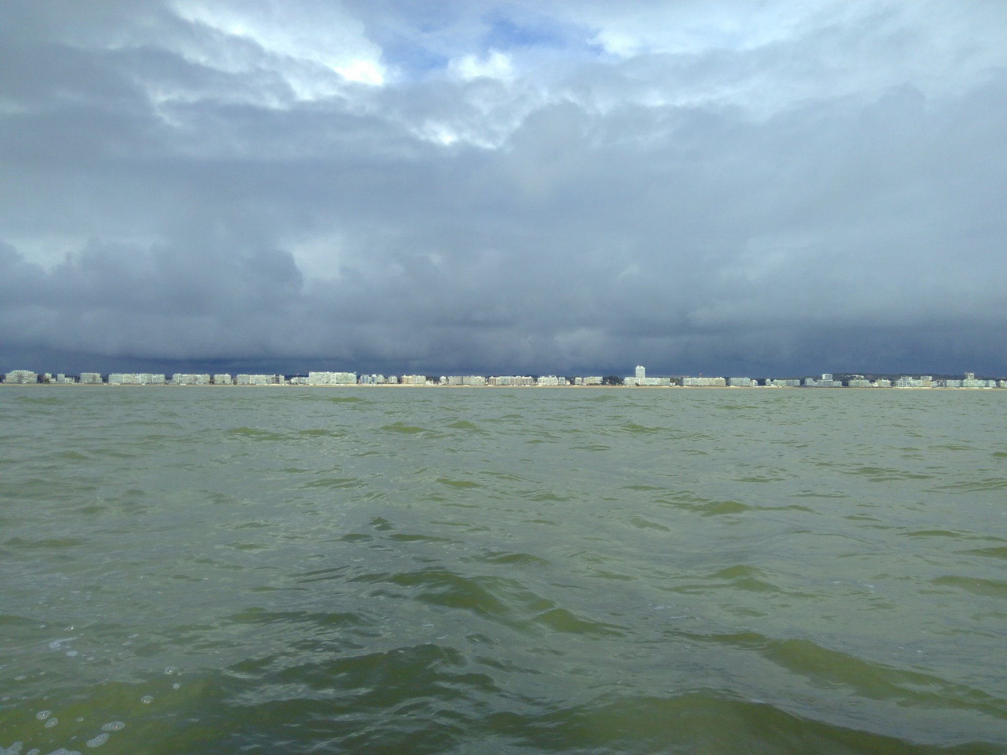 On part avec un vent qui est bien établi et une houle pas très commode. Trois voiliers tournent autour d’une bouée, on les laisse et on pointe l’étrave sur la sortie de la baie de la Baule. Tout le long de la sortie, une barre noire s’installe sur toute la longueur la côte, il doit faire sacrément moche à terre.