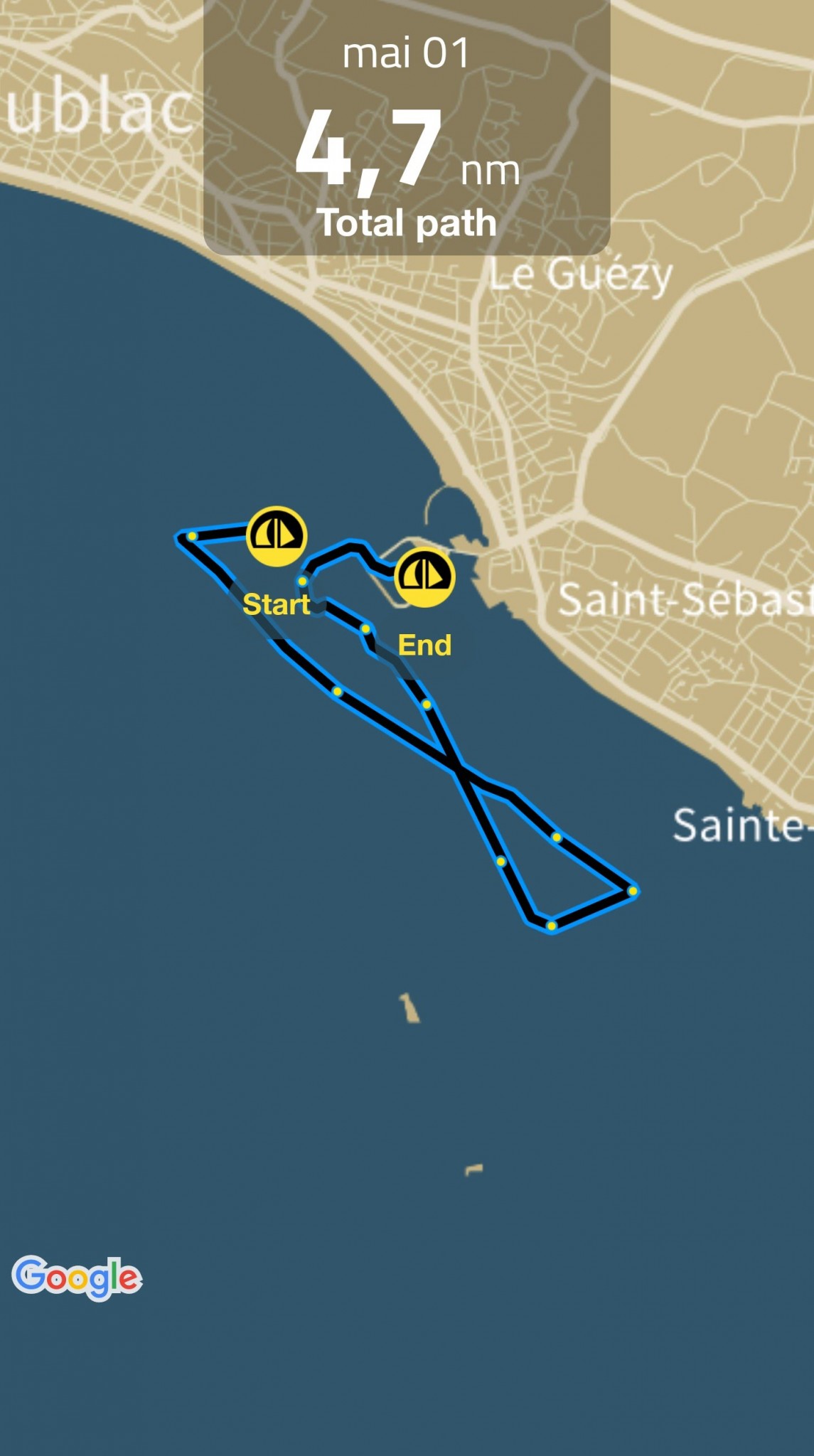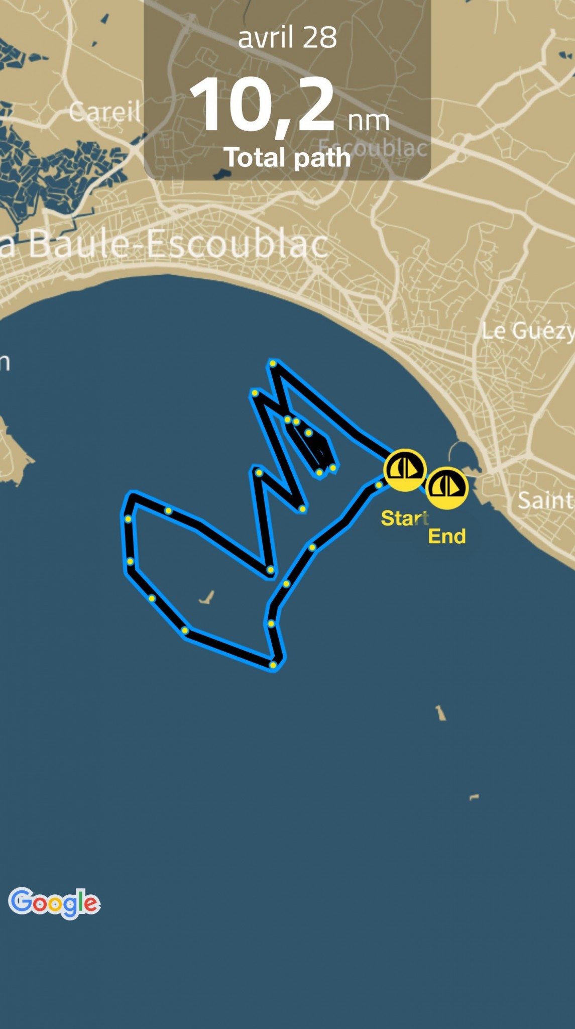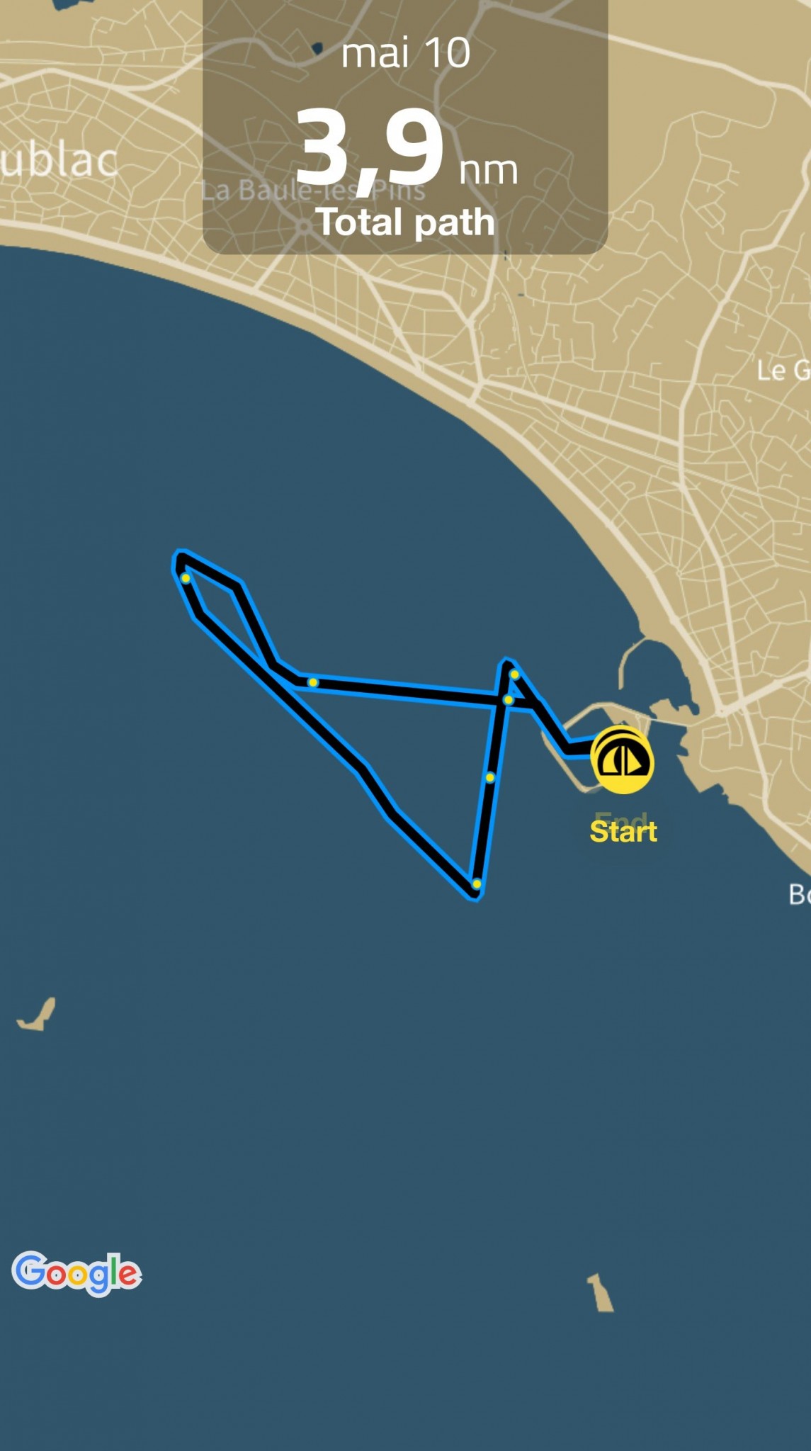 Jeudi de l’ascension, c’est avec mon copro, son fils et ma fille qu’on sort. L’objectifs : faire découvrir la mer à son fils. On tirera trois bords en baie de la Baule sur une mer pas trop facile et des coeurs sensibles à bord (ça en fait quelques uns en ce début de saison).