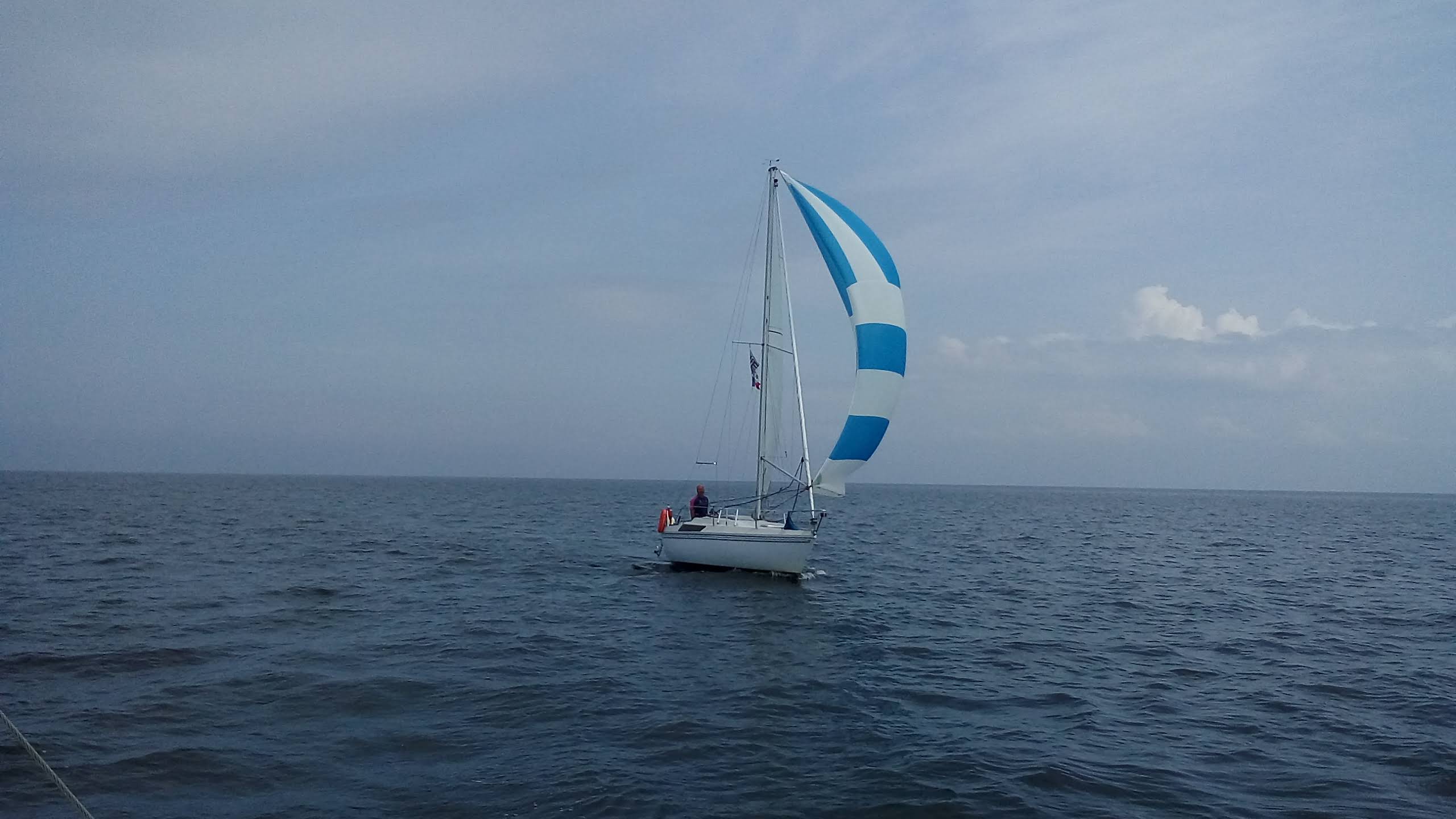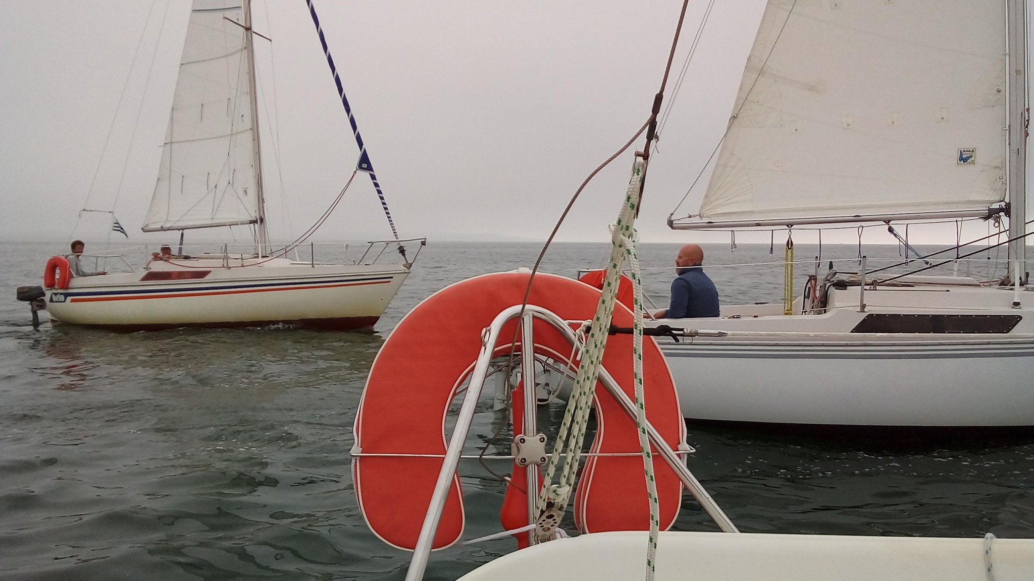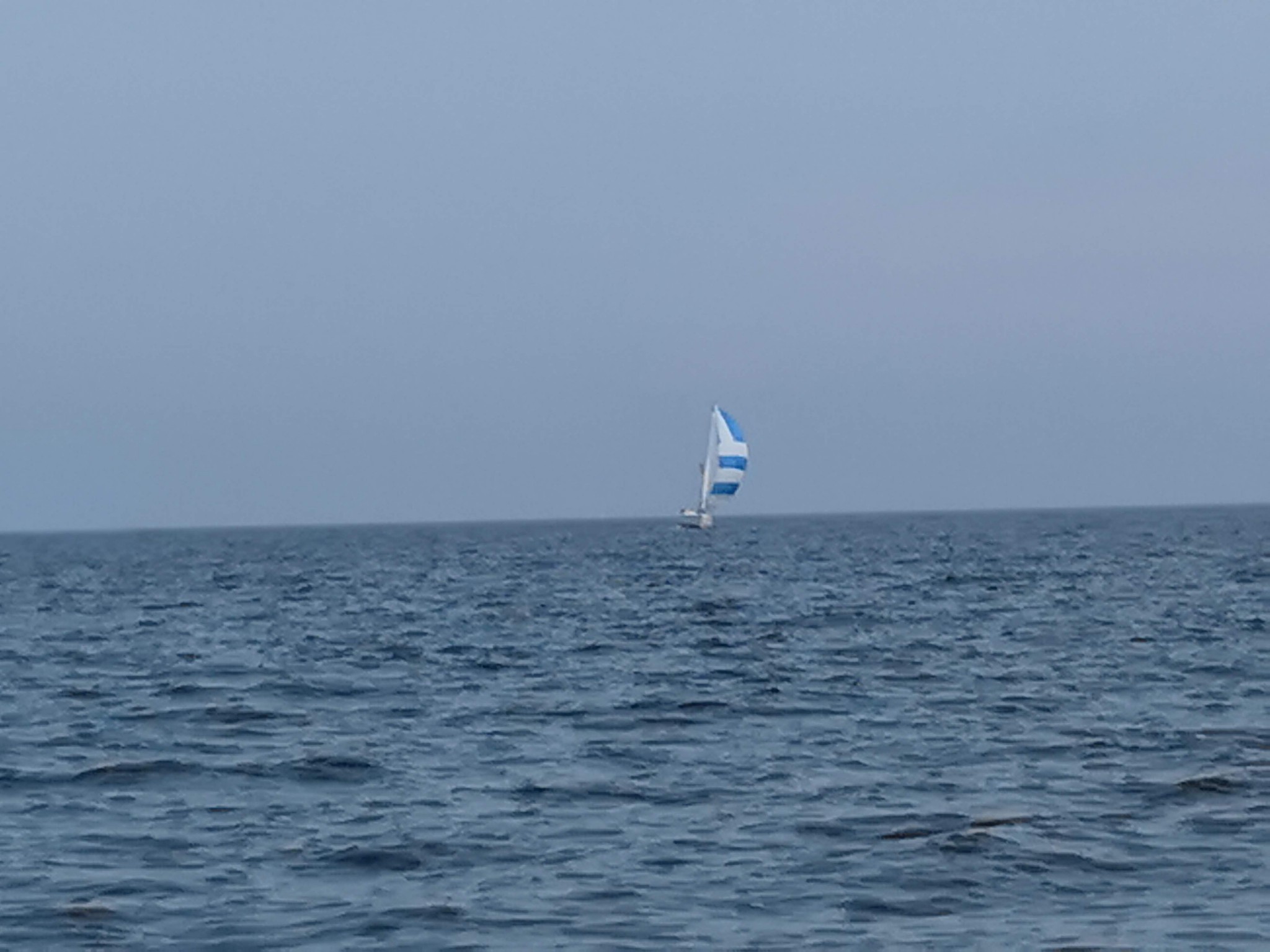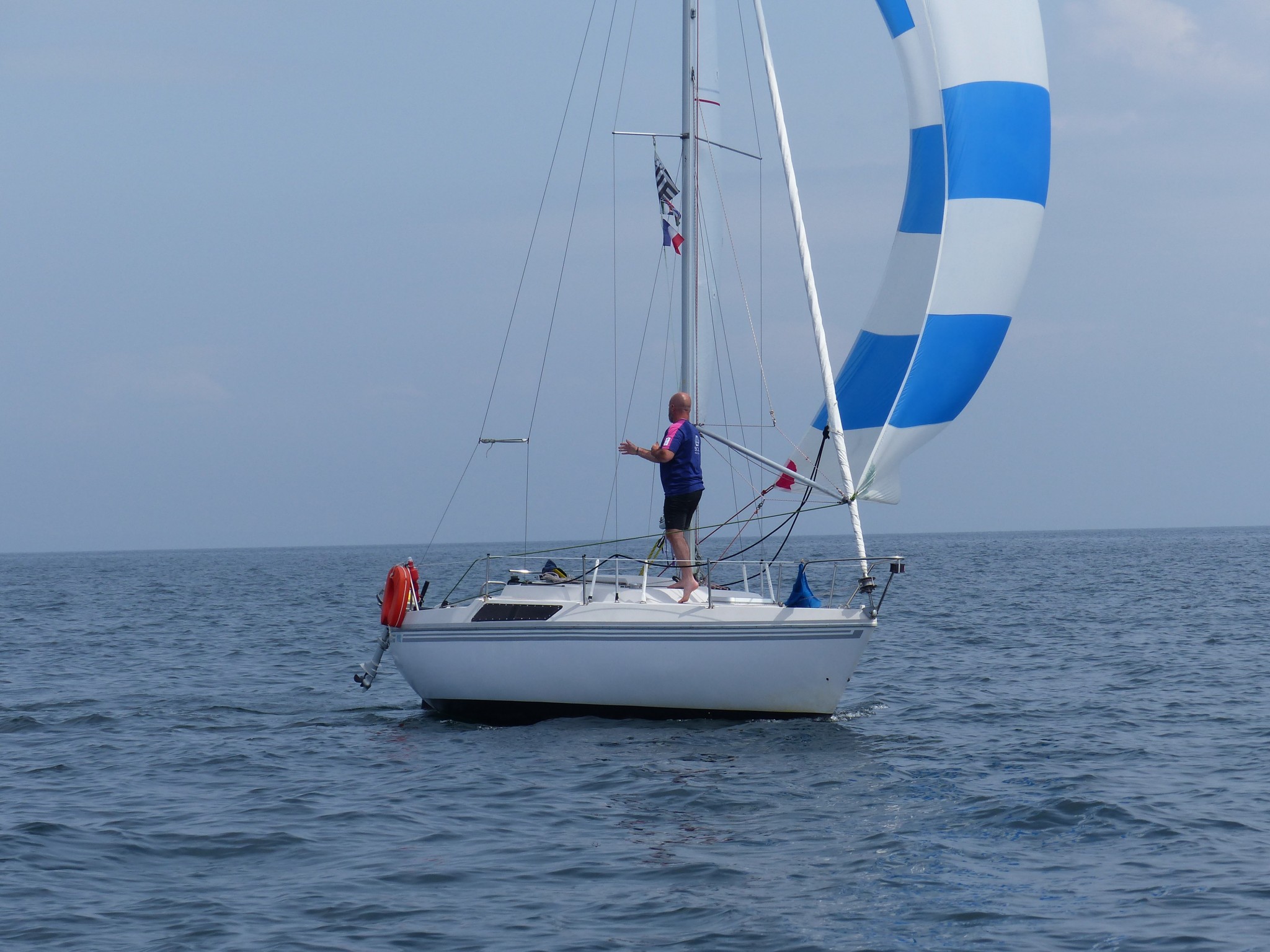 Il remonte à notre niveau, sous gennaker bleu et blanc et on établi à notre tour le génois. Il n’y a pas vraiment de vent, pourtant, le bateau d’Erwan se montre étonnament véloce dans ce temps, on remonte assez vite sur tout le monde, on fait même demi-tour pour retrouver les gars derrière nous, pour repartir et reprendre la tête avec le Tonic de Patrice qui nous colle d’assez près et nous dépasse parfois. Sébastien sous spi s’écarte de notre route, et mouille du fil, manque de peu un mulet qui se décroche, Lionel ferme le convoi.
