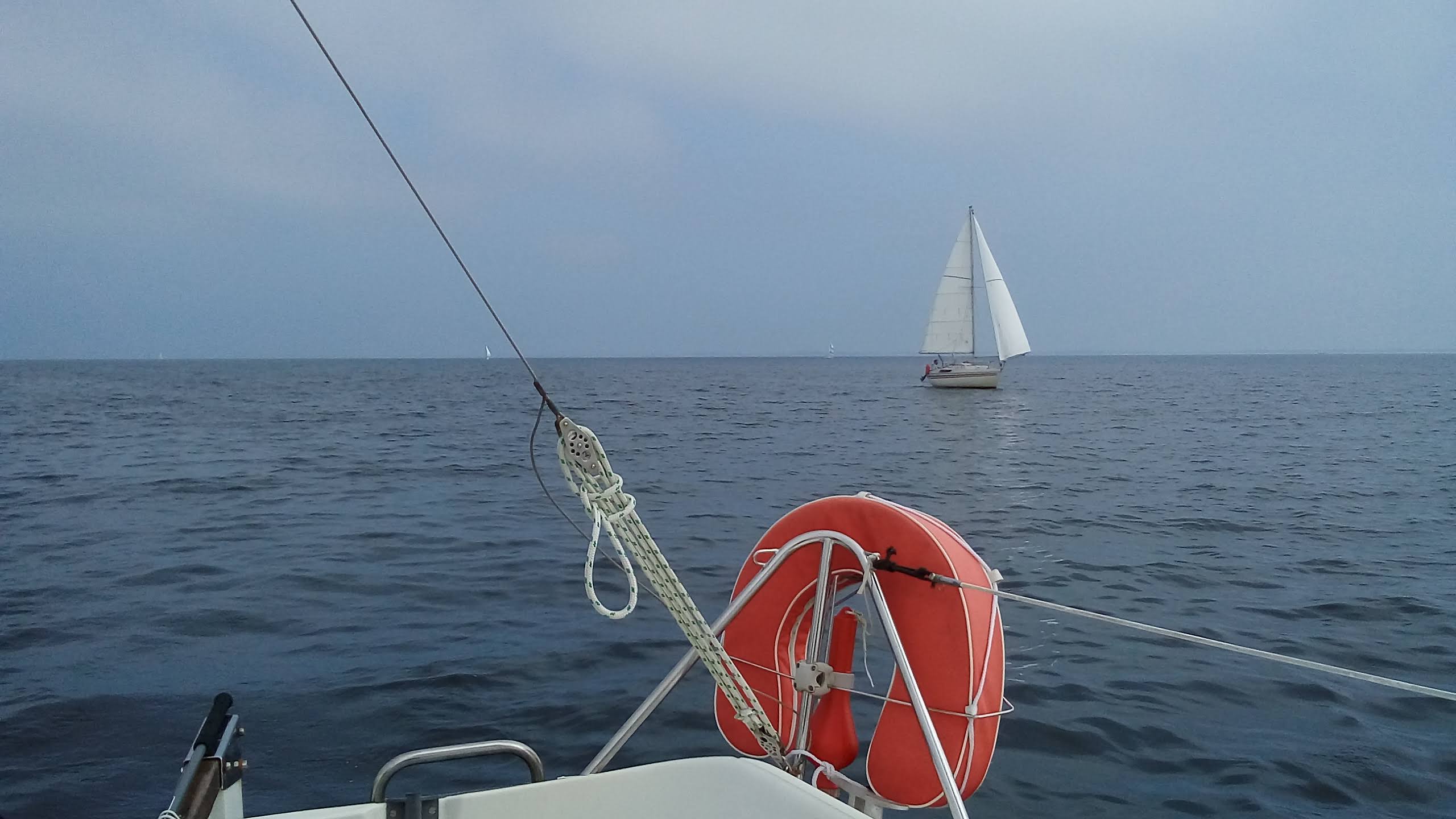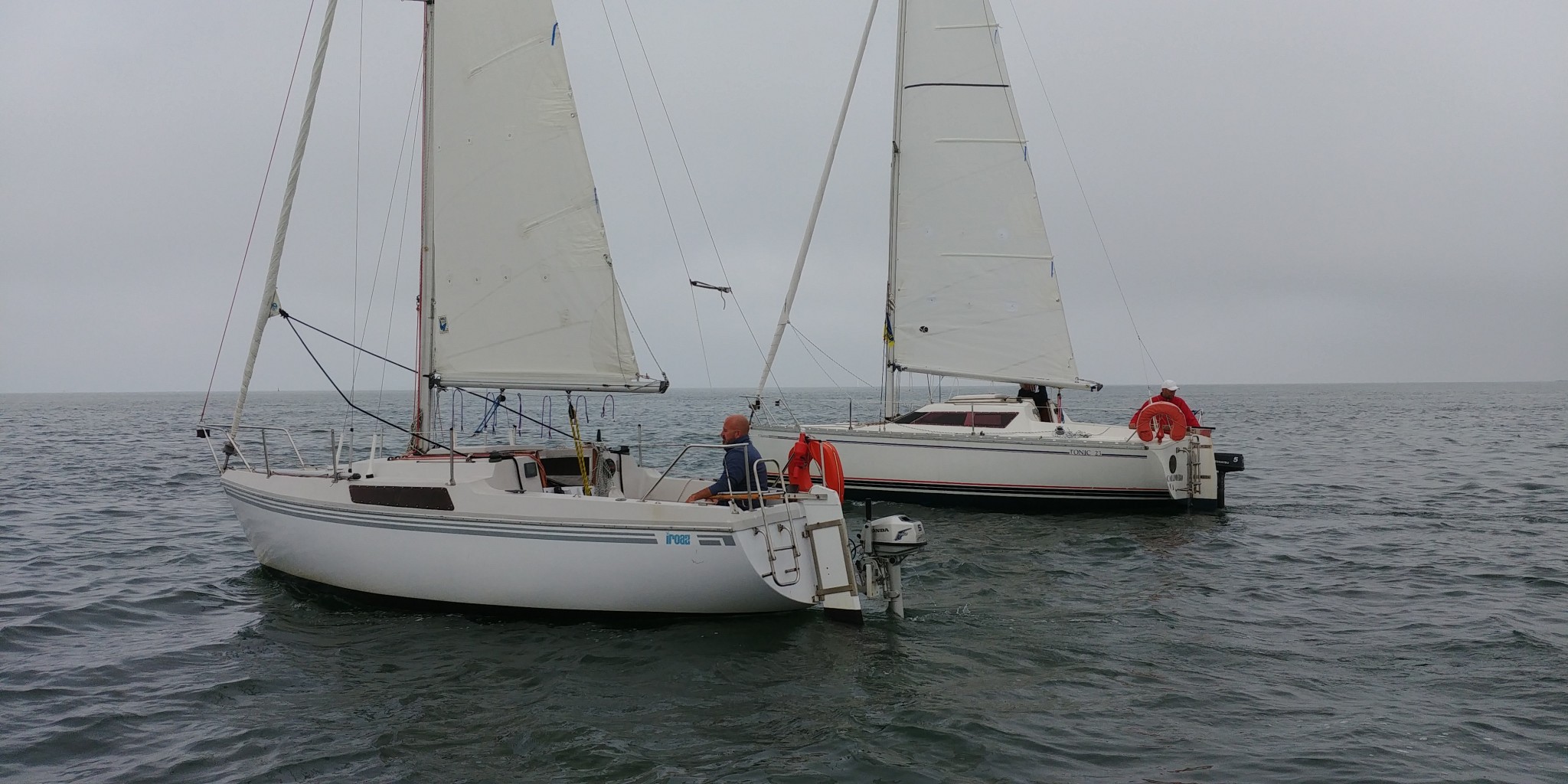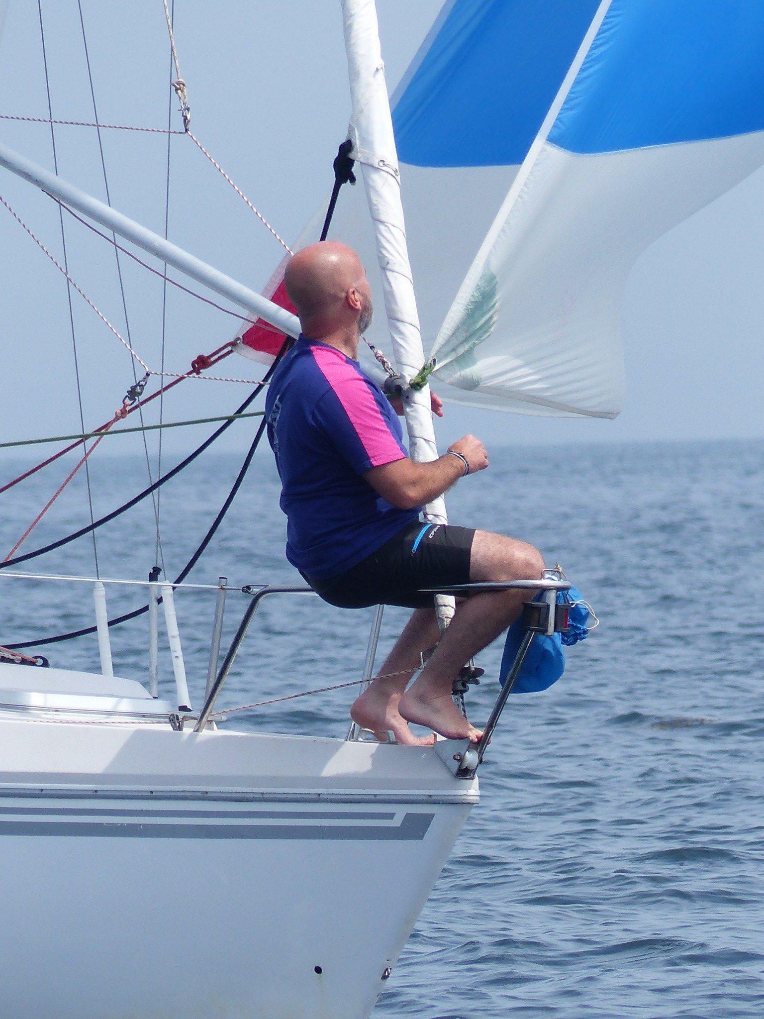 Il remonte à notre niveau, sous gennaker bleu et blanc et on établi à notre tour le génois. Il n’y a pas vraiment de vent, pourtant, le bateau d’Erwan se montre étonnament véloce dans ce temps, on remonte assez vite sur tout le monde, on fait même demi-tour pour retrouver les gars derrière nous, pour repartir et reprendre la tête avec le Tonic de Patrice qui nous colle d’assez près et nous dépasse parfois. Sébastien sous spi s’écarte de notre route, et mouille du fil, manque de peu un mulet qui se décroche, Lionel ferme le convoi.