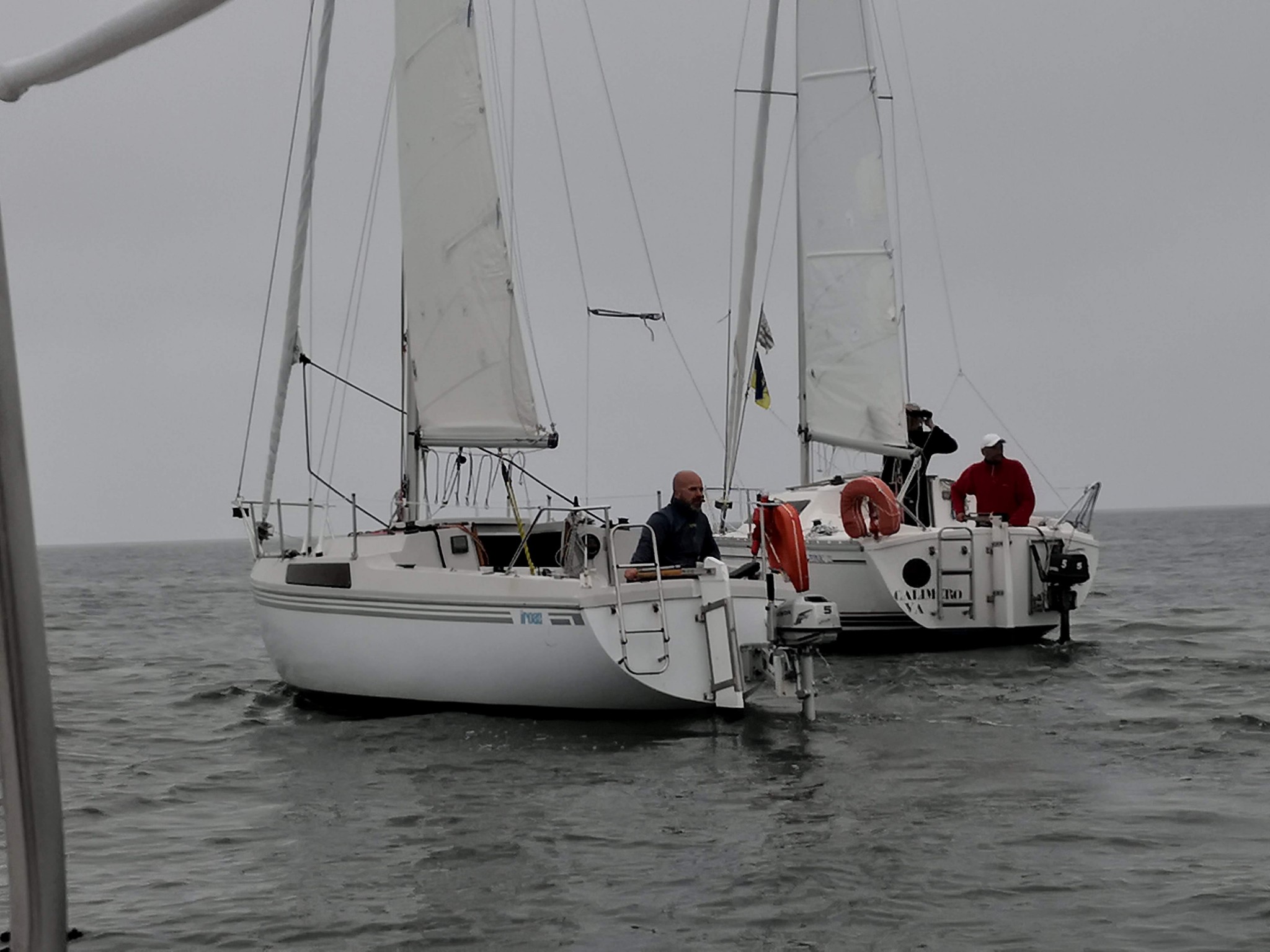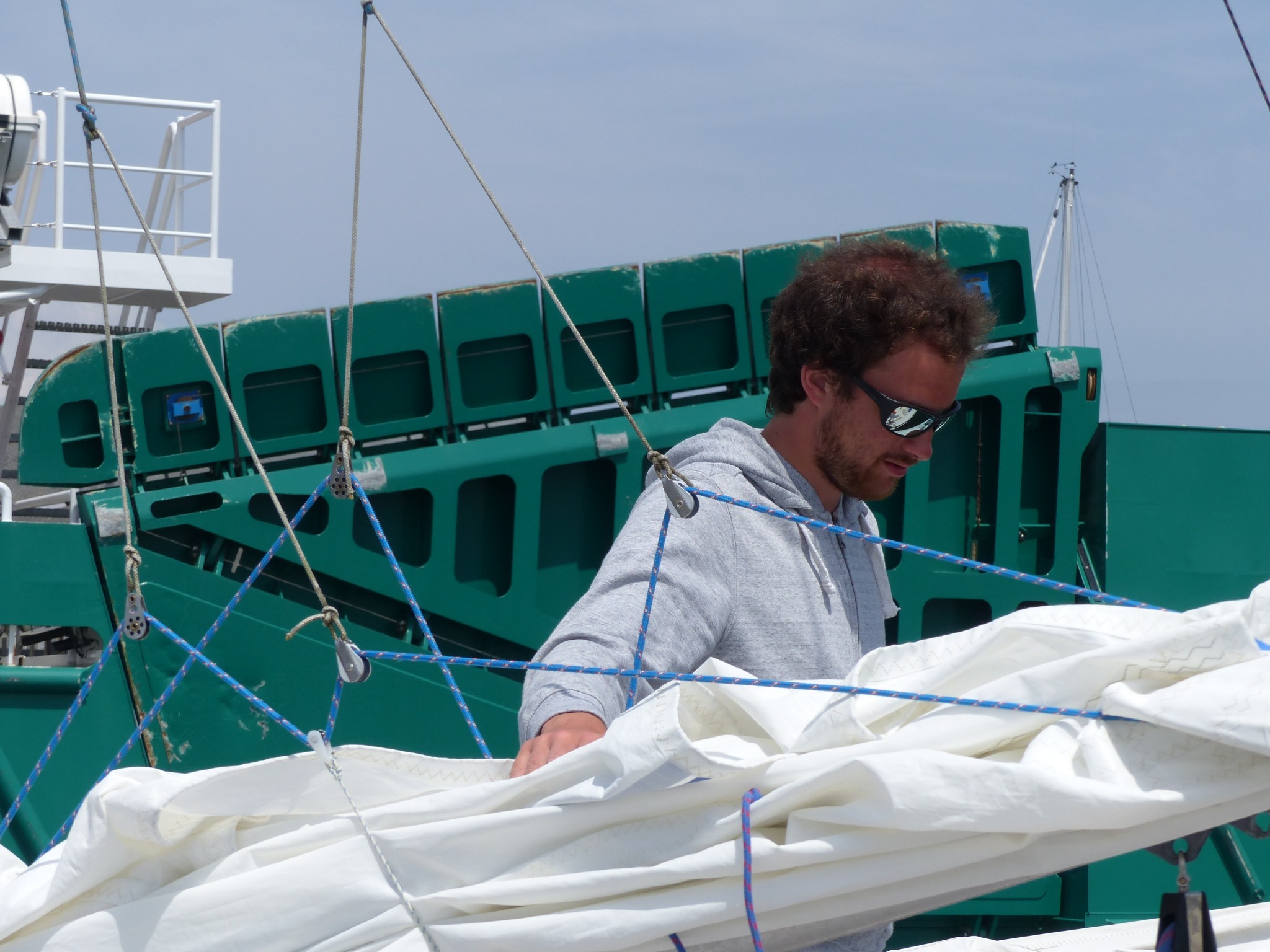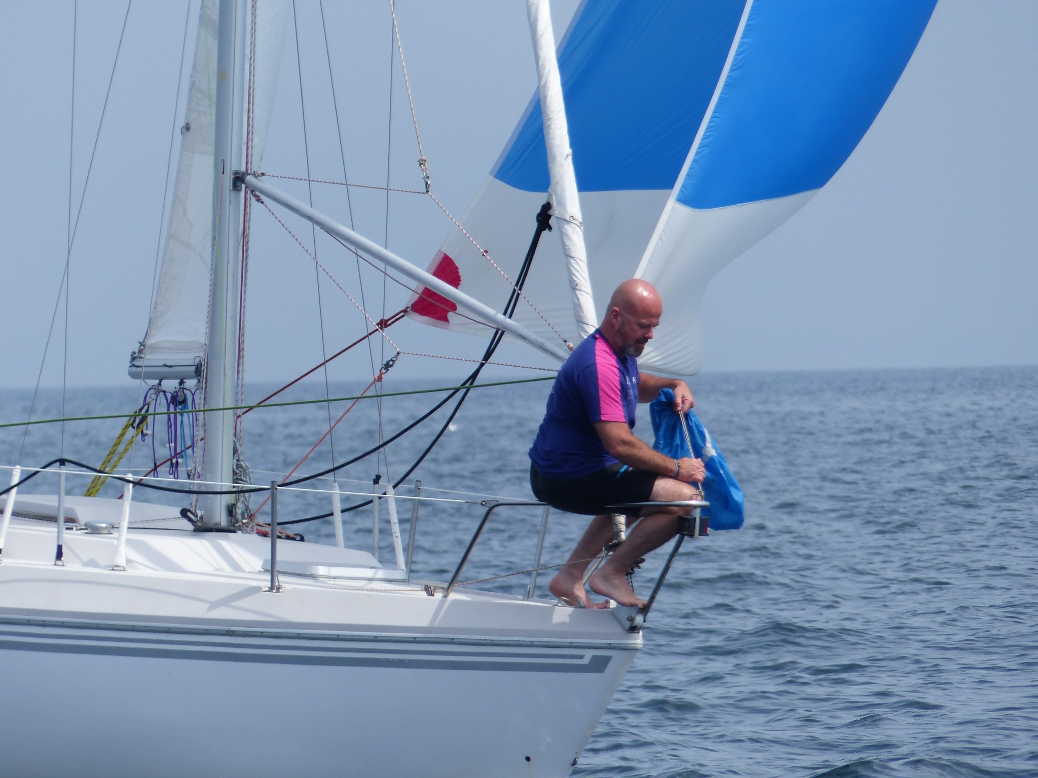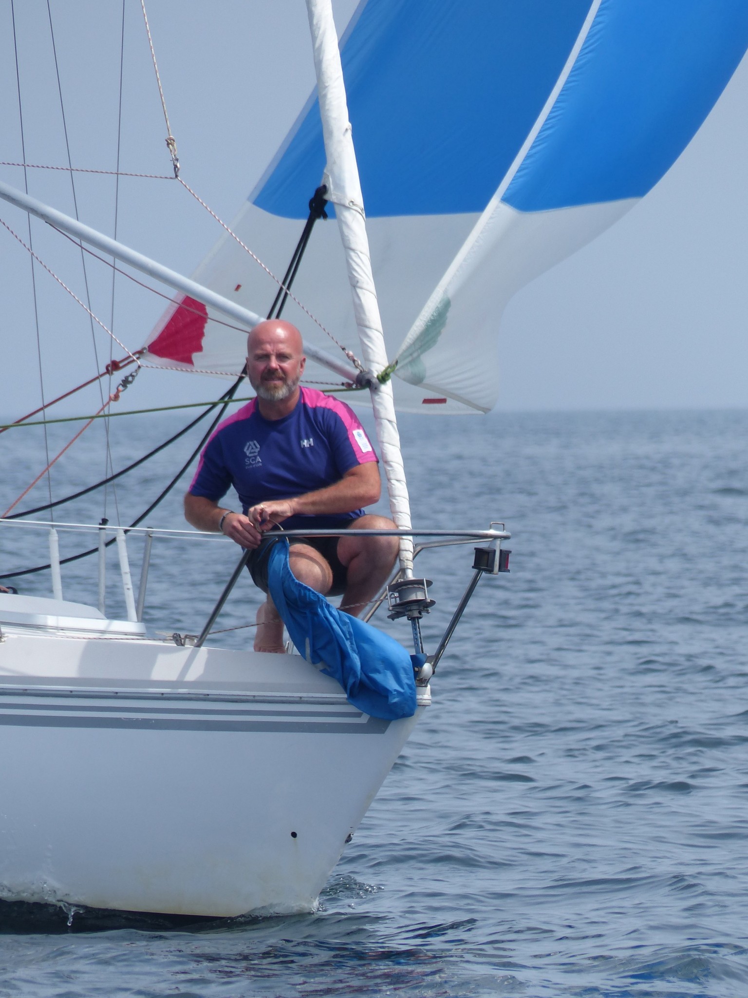 Il remonte à notre niveau, sous gennaker bleu et blanc et on établi à notre tour le génois. Il n’y a pas vraiment de vent, pourtant, le bateau d’Erwan se montre étonnament véloce dans ce temps, on remonte assez vite sur tout le monde, on fait même demi-tour pour retrouver les gars derrière nous, pour repartir et reprendre la tête avec le Tonic de Patrice qui nous colle d’assez près et nous dépasse parfois. Sébastien sous spi s’écarte de notre route, et mouille du fil, manque de peu un mulet qui se décroche, Lionel ferme le convoi.