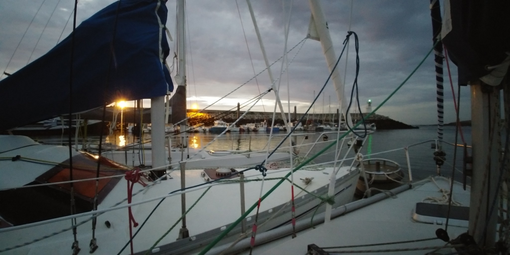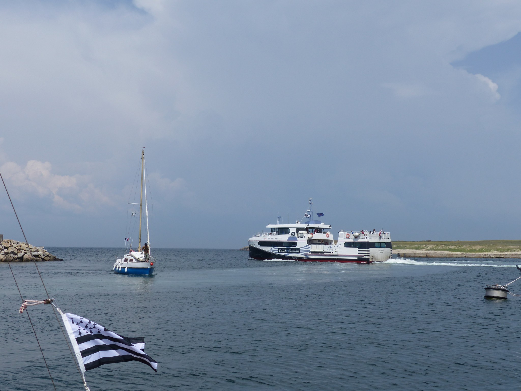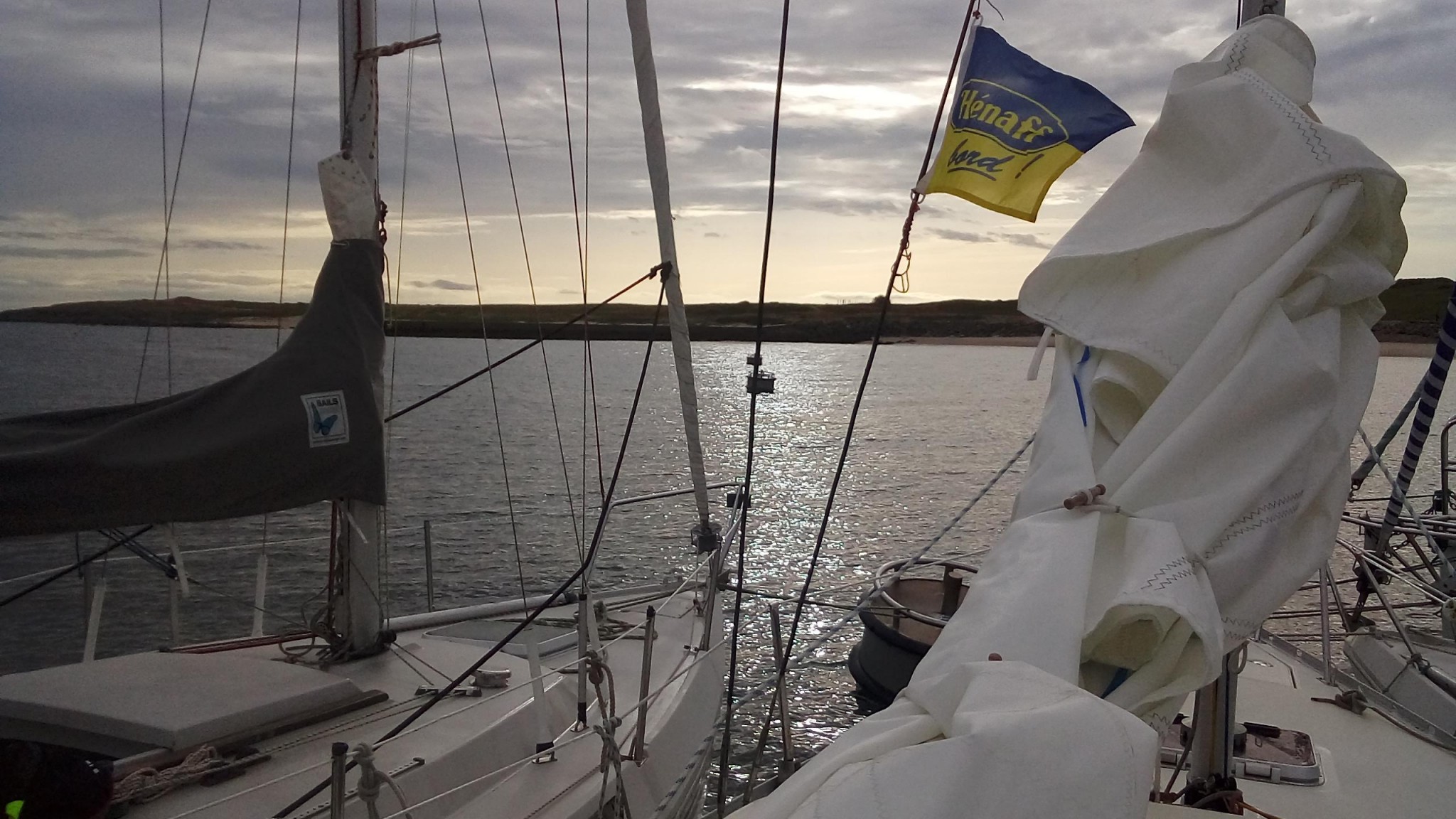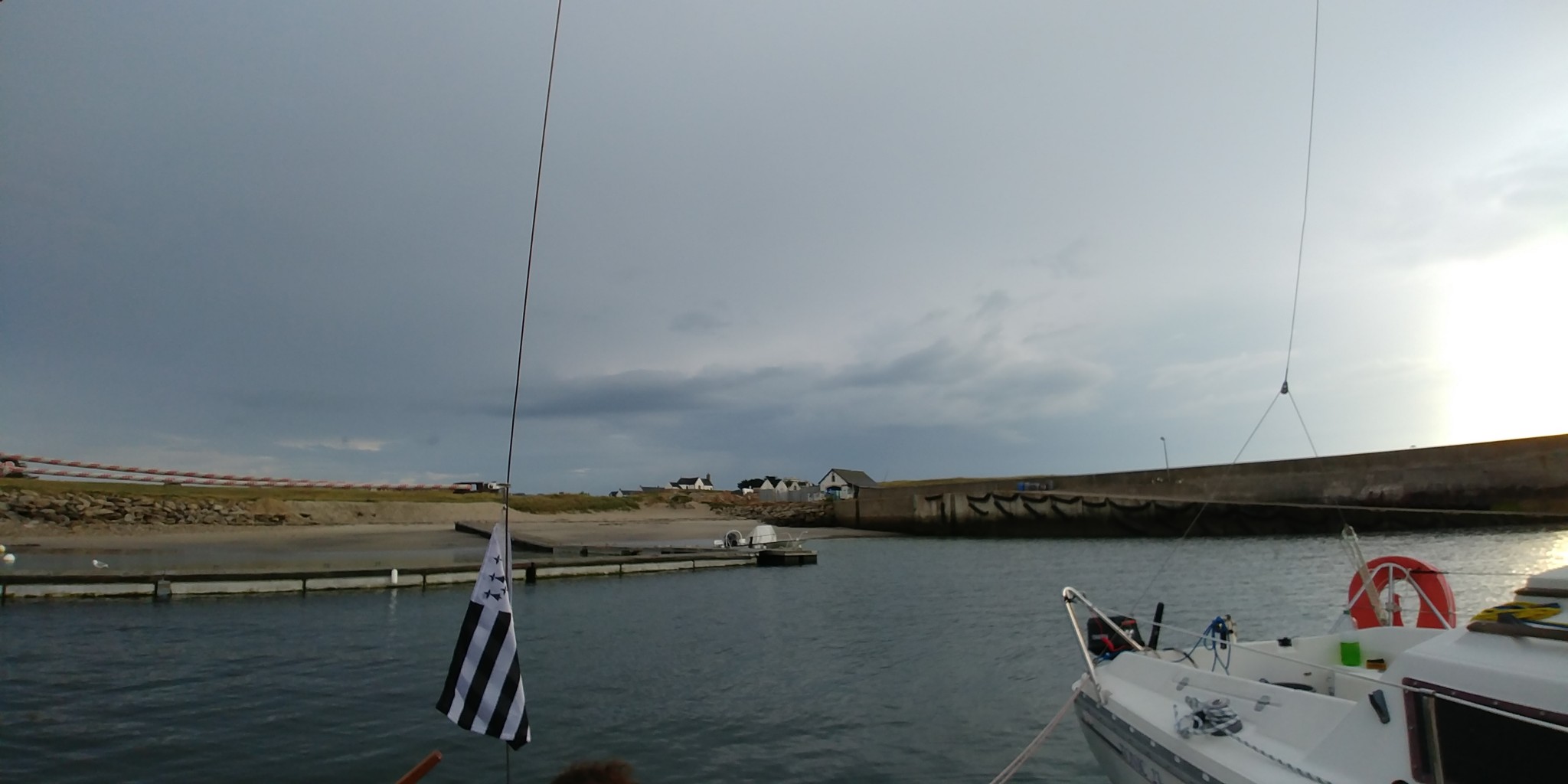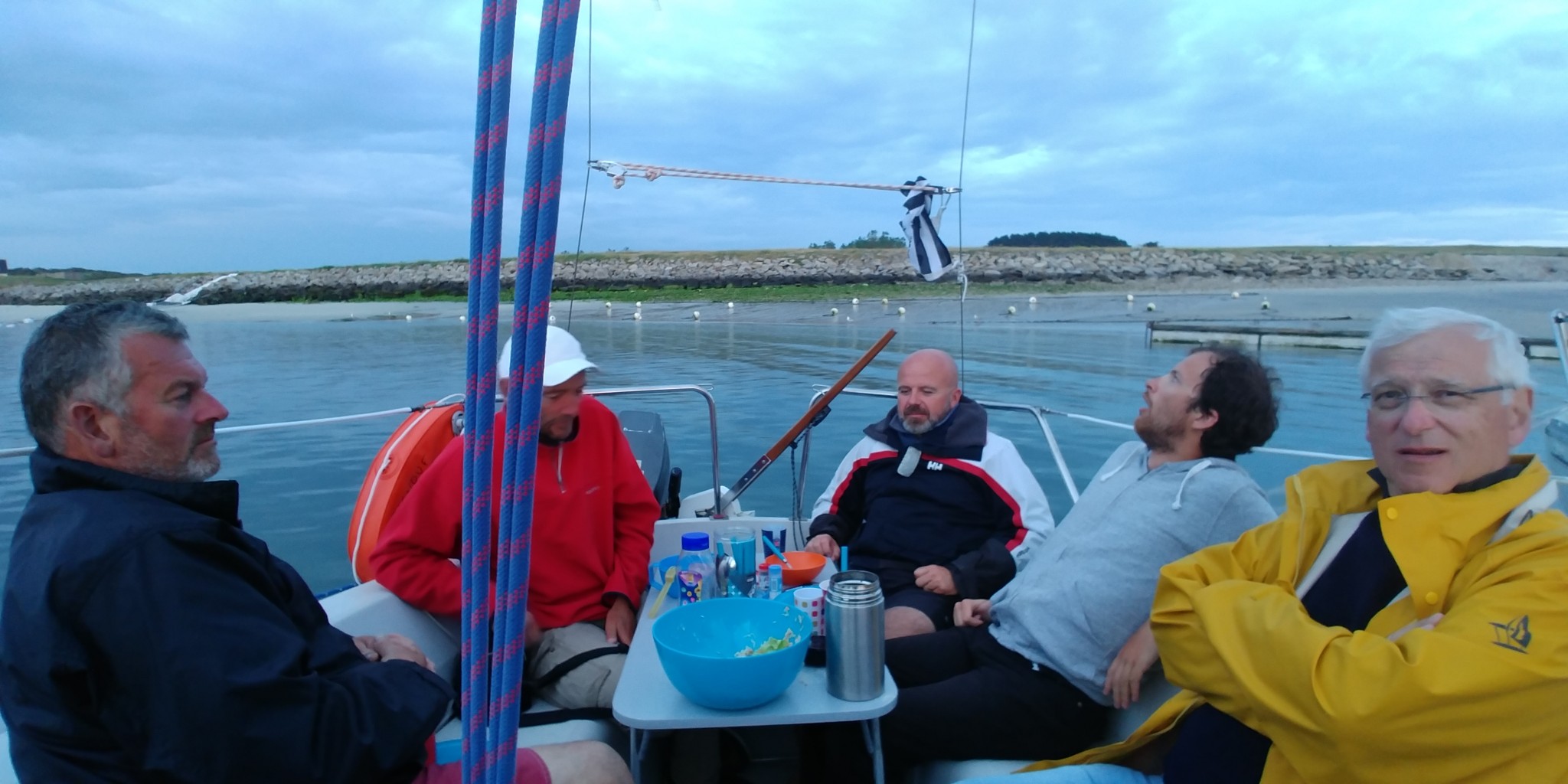 A l’origine, on pensait diriger nos étraves vers Belle-Ile pour cette première journée, mais les conditions météo nous déroutent vers Hoedic. On se réveille tous assez tôt, à l’exception de Didier qui nous avouera avoir profité d’un couchage de première qualité (« Royal ») dans le Tonic de Patrice. Et le soleil qui se lève se trouve assez vite rattrapé par un nuage d’orage qui ne nous dit rien de trop bon.