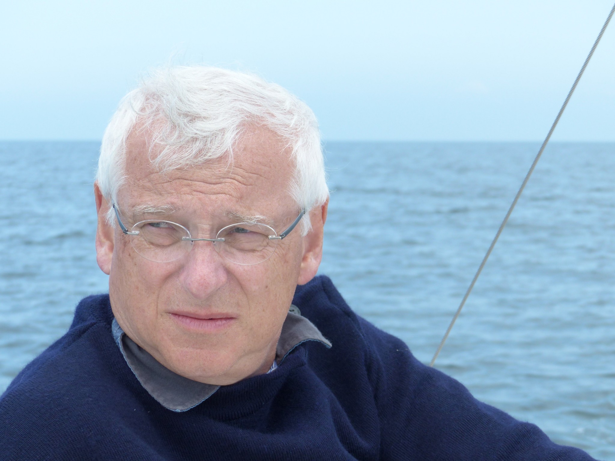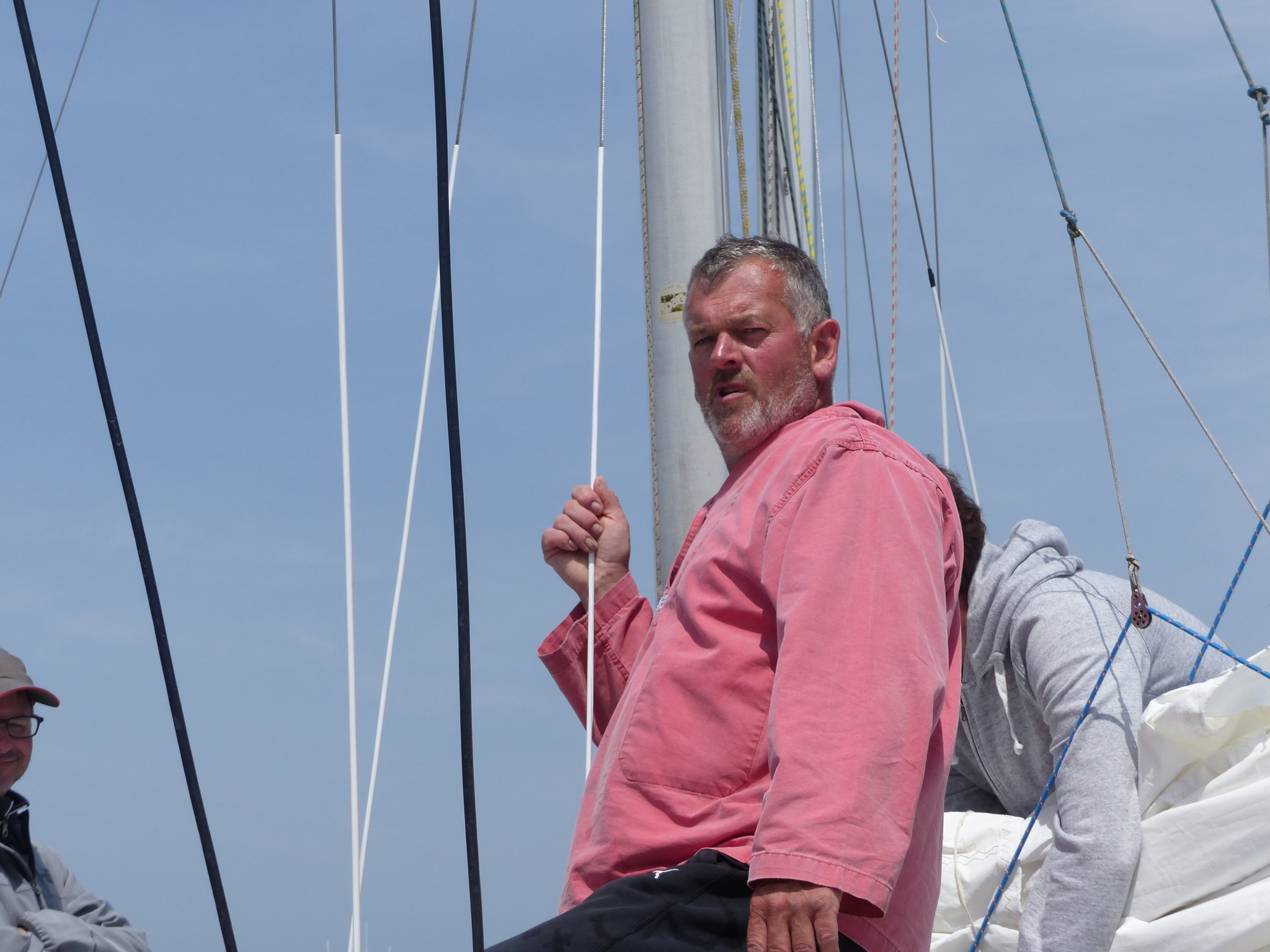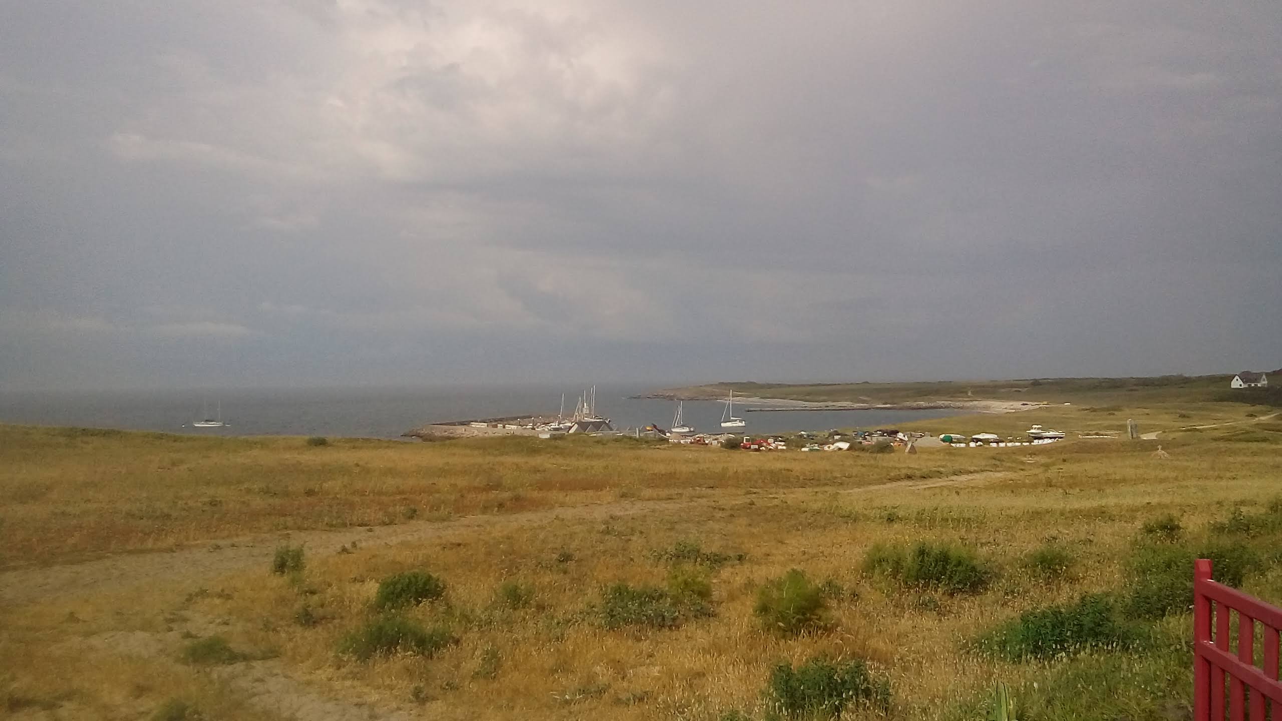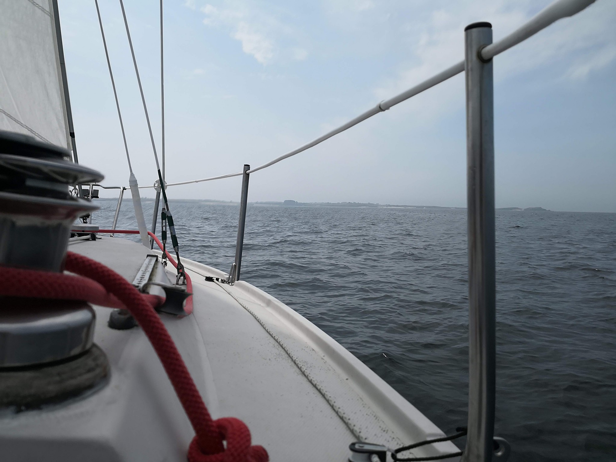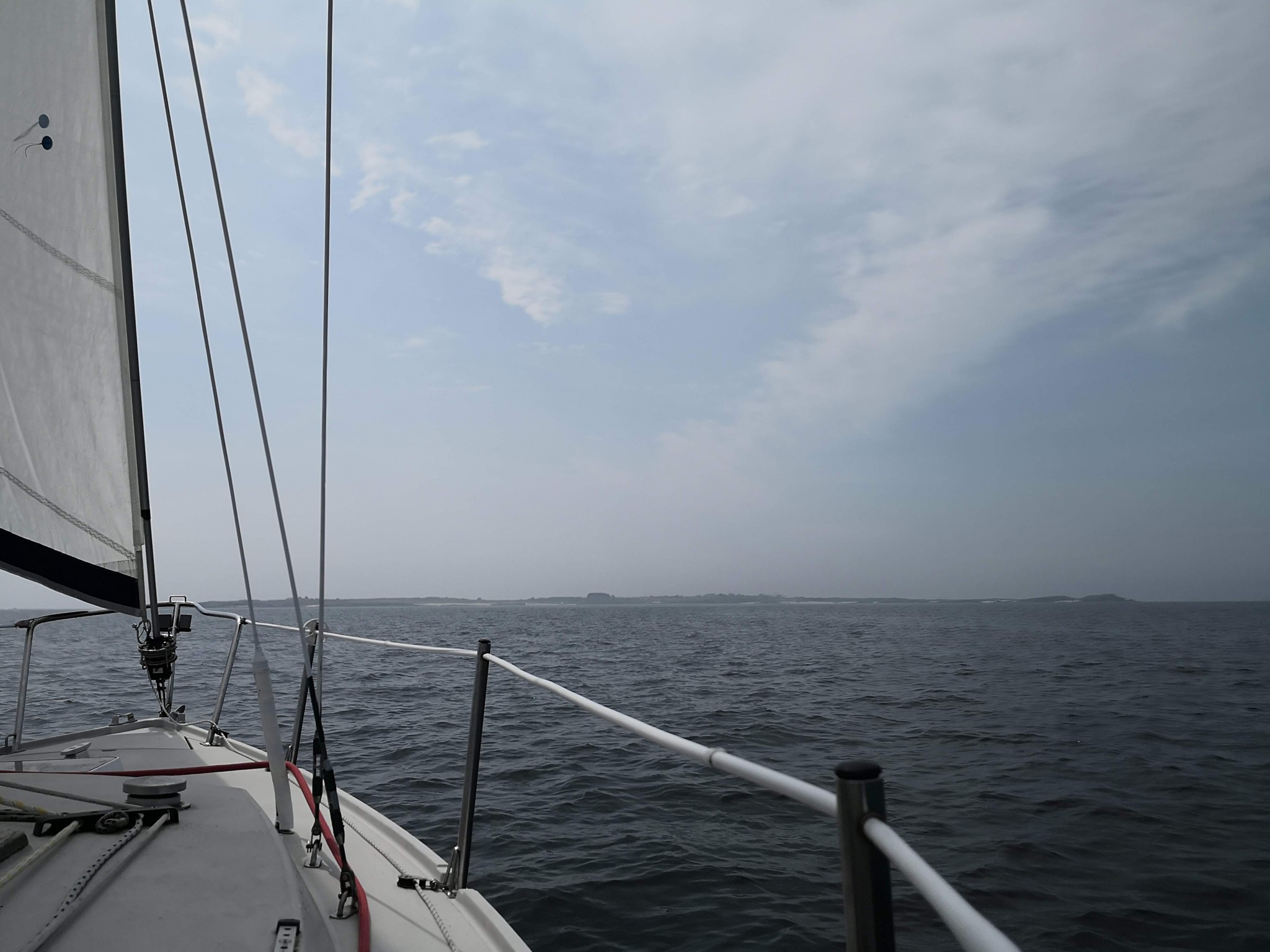 A l’origine, on pensait diriger nos étraves vers Belle-Ile pour cette première journée, mais les conditions météo nous déroutent vers Hoedic. On se réveille tous assez tôt, à l’exception de Didier qui nous avouera avoir profité d’un couchage de première qualité (« Royal ») dans le Tonic de Patrice. Et le soleil qui se lève se trouve assez vite rattrapé par un nuage d’orage qui ne nous dit rien de trop bon.