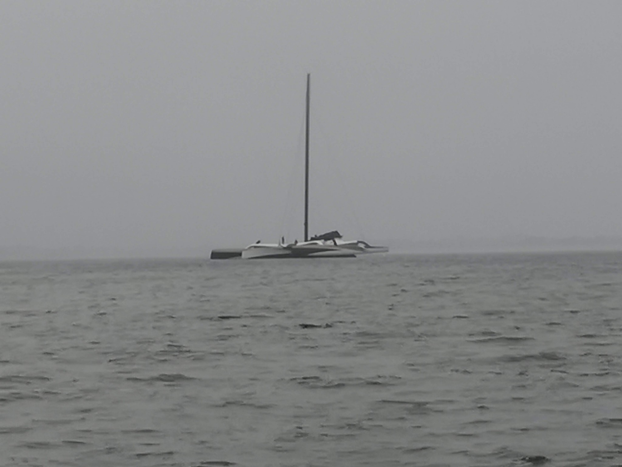 Le temps d’une douche, d’un café et de voir Didier se lever, on quitte le Crouesty sous de tout petits airs et avec la présence de Spindrift sur le plan d’eau. Celui ci a sans doute décidé de venir nous saluer pour se première sortie de l’année ! Il sort du Golfe, à sec de toile, propulsé par un Zodiac à couple de sa coque centrale. Lionel s’annonce également à la VHF alors qu’on est au niveau de Méaban. On peine à le distinguer, on croit le reconnaître plusieurs fois, mais si il est présent sur le canal 8 son Brio tarde un peu à se montrer. Petit malentendu, il nous cherchait à la sortie du Crouesty apparemment.