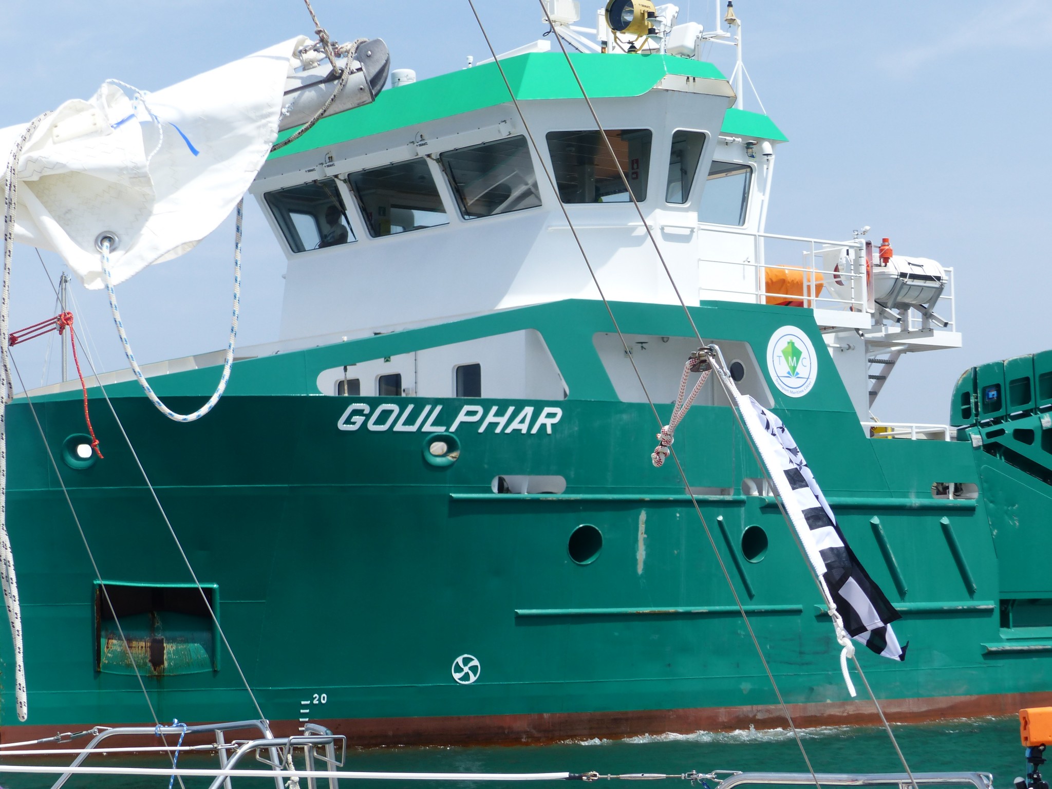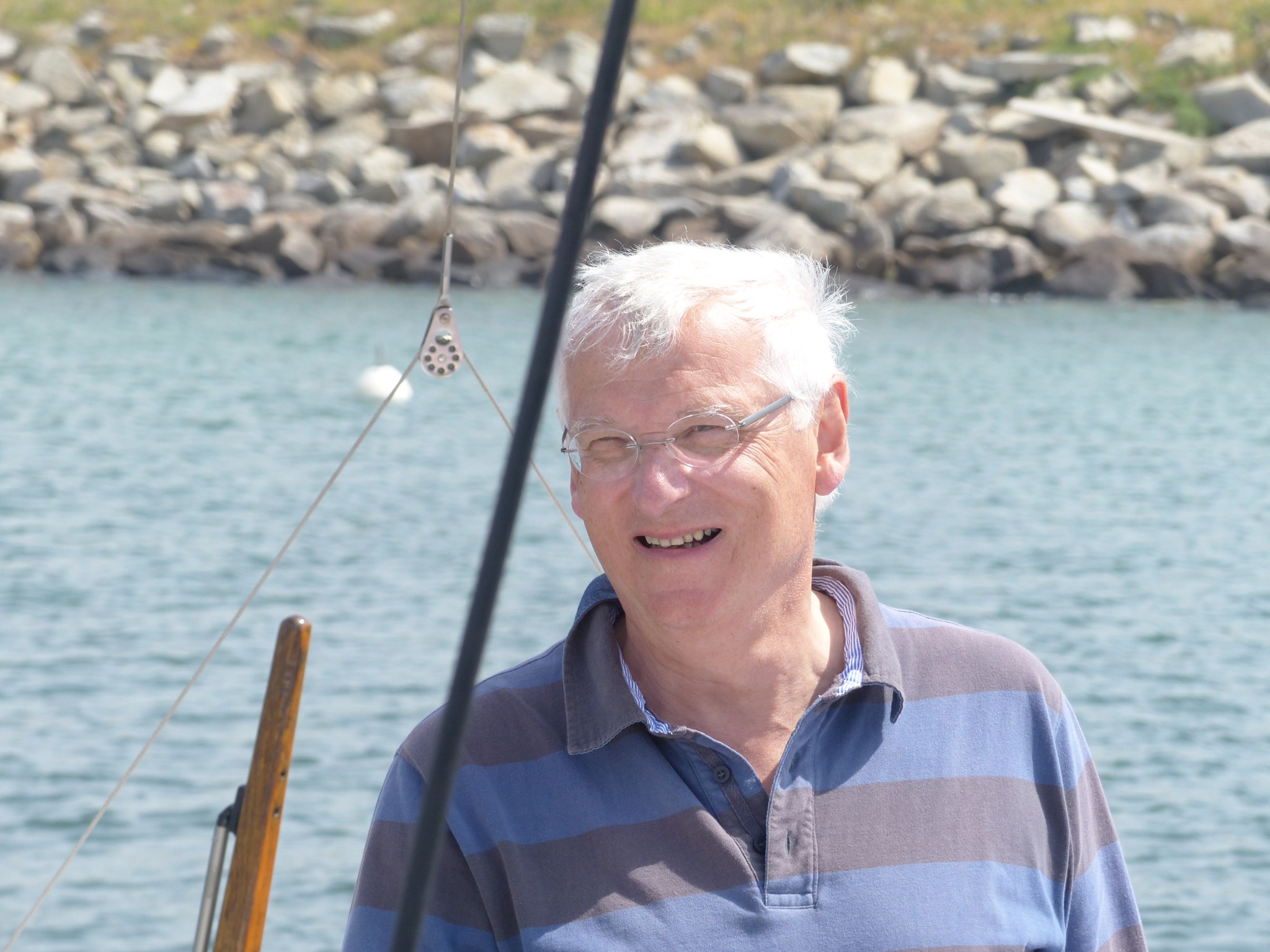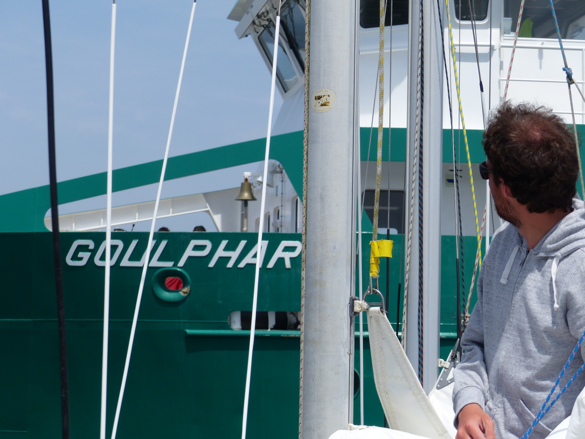 On affale au niveau de « La chèvre », la bouée de danger isolé devant l’entrée du port de l’Argol. Patrice profite d’un petit regain de vent pour nous fondre dessus à une vitesse qui nous fait penser qu’il est pleine balle au moteur, même pas, avec un tout petit peu plus de vent, Caliméro s’exprime à son tour pleinement !