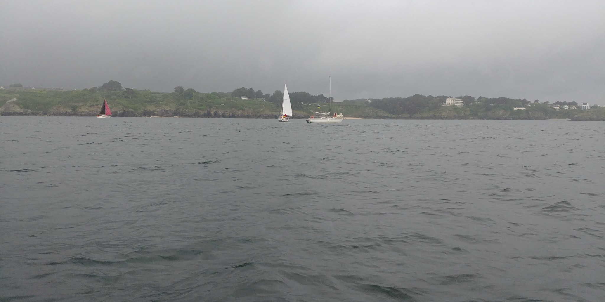 On sera les premiers sur l’eau, suivis par les autres le temps de deux bords dynamiques. Les bateaux se tournent les uns autour des autres avant de prendre la direction de Sauzon. La Chance découvre ses voiles : grand-voile noire, génois rouge, ce bateau a un sacré caractère !
