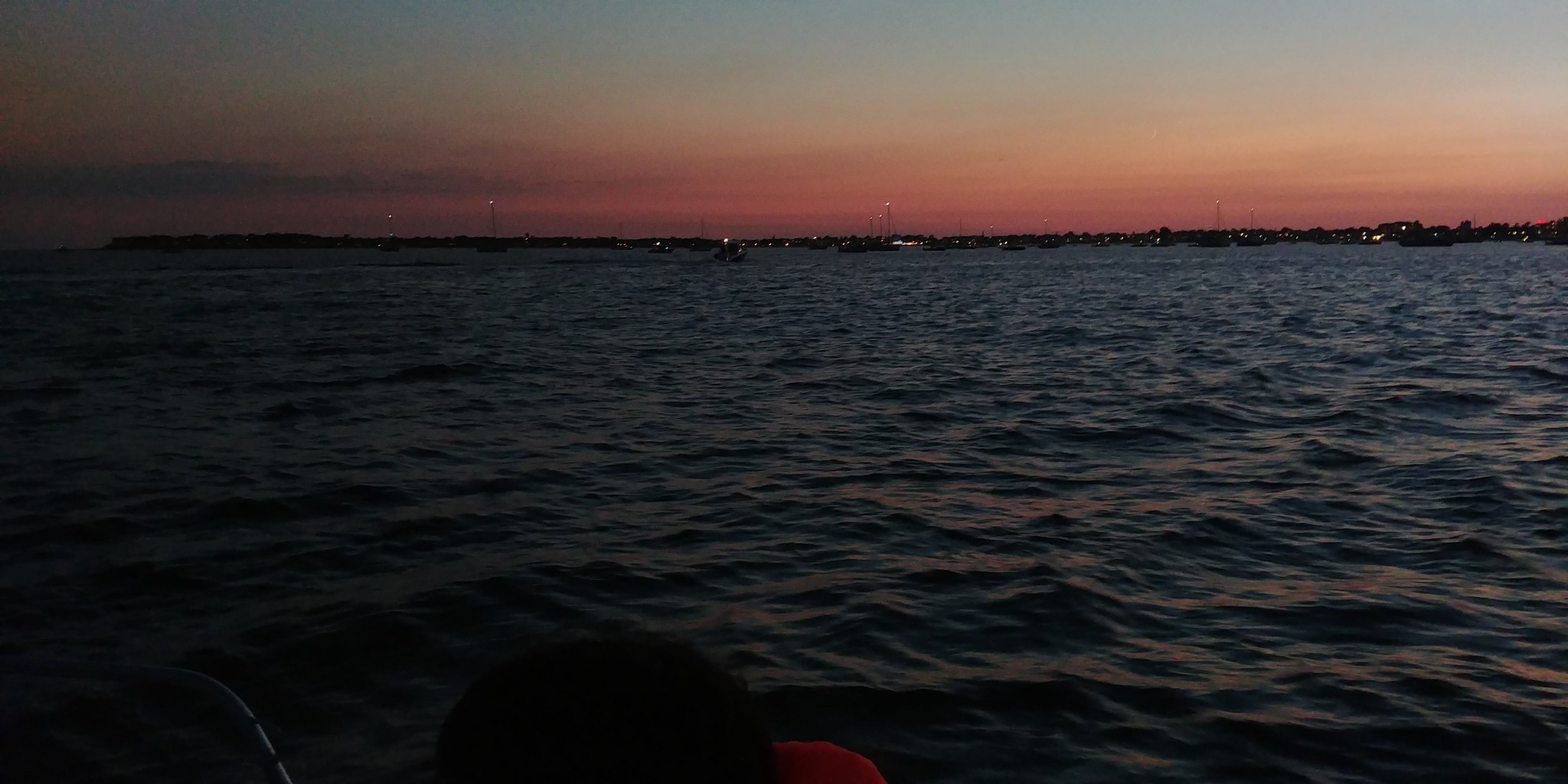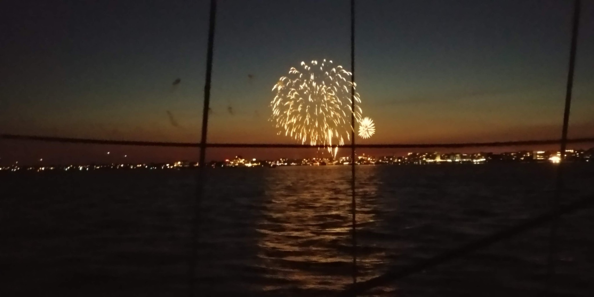 Après avoir cru assister à plusieurs reprises au bouquet final, le der des ders nous laisse dans la pénombre et m’envoie à l’avant remonter l’ancre. J’imaginais dans mes rêves être dans la nuit noire avec un clignotant rouge et vert bien visible au bout. En fait, le trait de côte est tellement fouilli et tellement lumineux que le port n’est pas évident à trouver dans ce bazar.